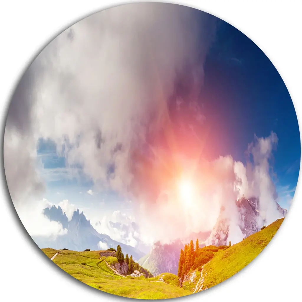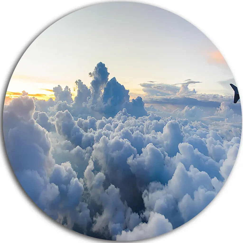 Bring Contemporary Abstraction to your home with this large Circle Metal wall art. This Solotful Sunset in Sky Cloudscape Metal Artwork makes it the focal point of any room or office. - White Gloss Coating ensures colors are extra vibrant with light reflection.- Aluminum grade Sheet Metal with 1 inch mounting frame on the back giving the illusion that the artwork is floating on the wall..- Mounting Brackets are included along with instructions.- High Quality Digital images are created directly into a glossy aluminum panel producing a stunning and captivating print into the glossy finish of the metal.- Water, Fire and Scratch resistant HD Aluminum panels.- Looks better than any photo paper and guaranteed to last at least 20 years- Easy to clean with a microfiber cloth. Colors are far superior to regular Canvas Art. - Easy to Hang