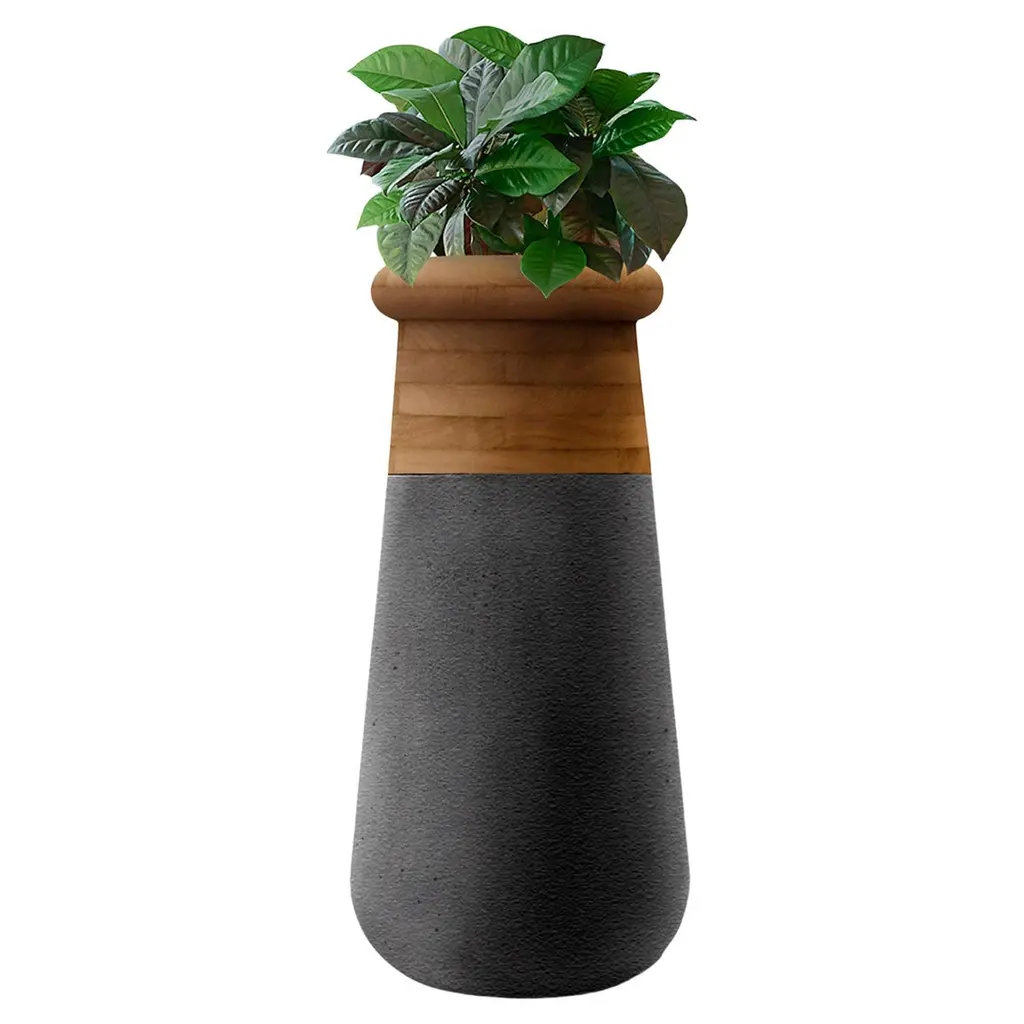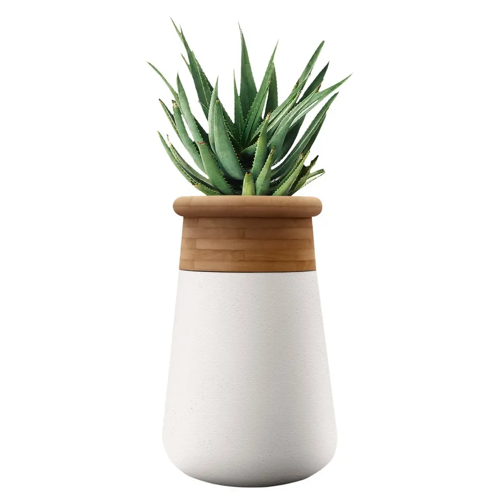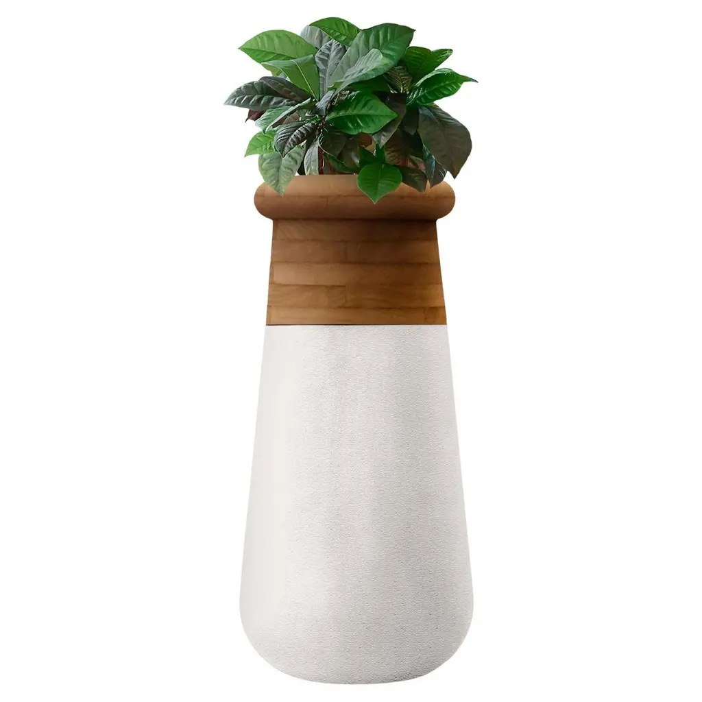 Soma Medium Oiled Wood And White Stone Planter by IndigenusDesigned by Laurie Wiid van HeerdenDimensions: Ø 73,3 x H 100 cm.Materials: Wood and stone.Weight: 75 kg.Available in natural/oiled wood or stone. Different colors and sizes are available. Please contact us.Soma is the Greek word for “body” and Laurie Wiid van Heerden’s design of the Soma is inspired by the body of a tree. The trunk-like shape carries leaves towards the sky raising them upwards and above other plants. The Soma planters, some of which are substantial in size, do the same and lift beautiful plants via a curvaceous tree trunk likeness which could include timber as part of the tree's body.Indigenus, founded in 2014, is the brainchild of Cape Town local, Peter van der Post. At the beginning of his career, whilst working in roto-moulding, Peter noticed a lack of high design planters in the market and the vision to produce the most beautiful, original, and desirable planters began to grow. Over the past 8 years, the Indigenus team has collaborated with South Africa’s top designers to create planters that are art pieces in their own right. 2022 has seen exciting collaborations further afield with internationally renowned designers and collaborators. In line with our sustainability and quality luxury objectives, we are constantly striving to make planters for life and not just for a few seasons. It has taken years of refinement, many valuable lessons learned and, ultimately, setting up our world-class factory for in-house manufacturing to be able to ensure that the planters are of the highest quality. All materials are sustainably sourced and the planters are made by hand. It is this craftsmanship that puts Indigenus in a league of its own. Each range of planters is unique and illustrates the impact that beautiful sculptural planters have on architecture and landscapes. The planters' close connection to the earth is expressed through a stable and grounded design, made with beautiful natural materials and evoking an underlying story of our relationship with the natural world.Indigenus is focused on collaboration with the world’s top designers and artists. We are committed to constant refinement and a willingness to be courageous, curious, and experimental with natural materials and new designs. We have built solid distributor networks and relationships that we are committed to maintaining and growing globally. We are proud of our roots as an African luxury brand with a global footprint.