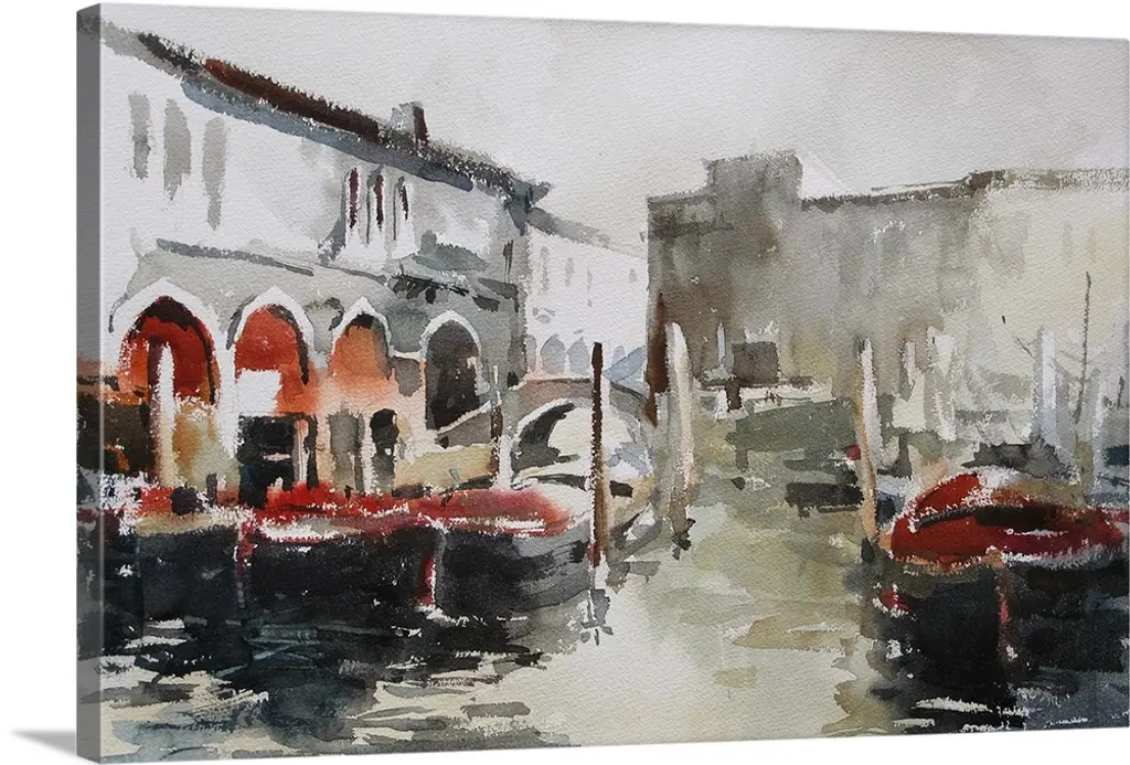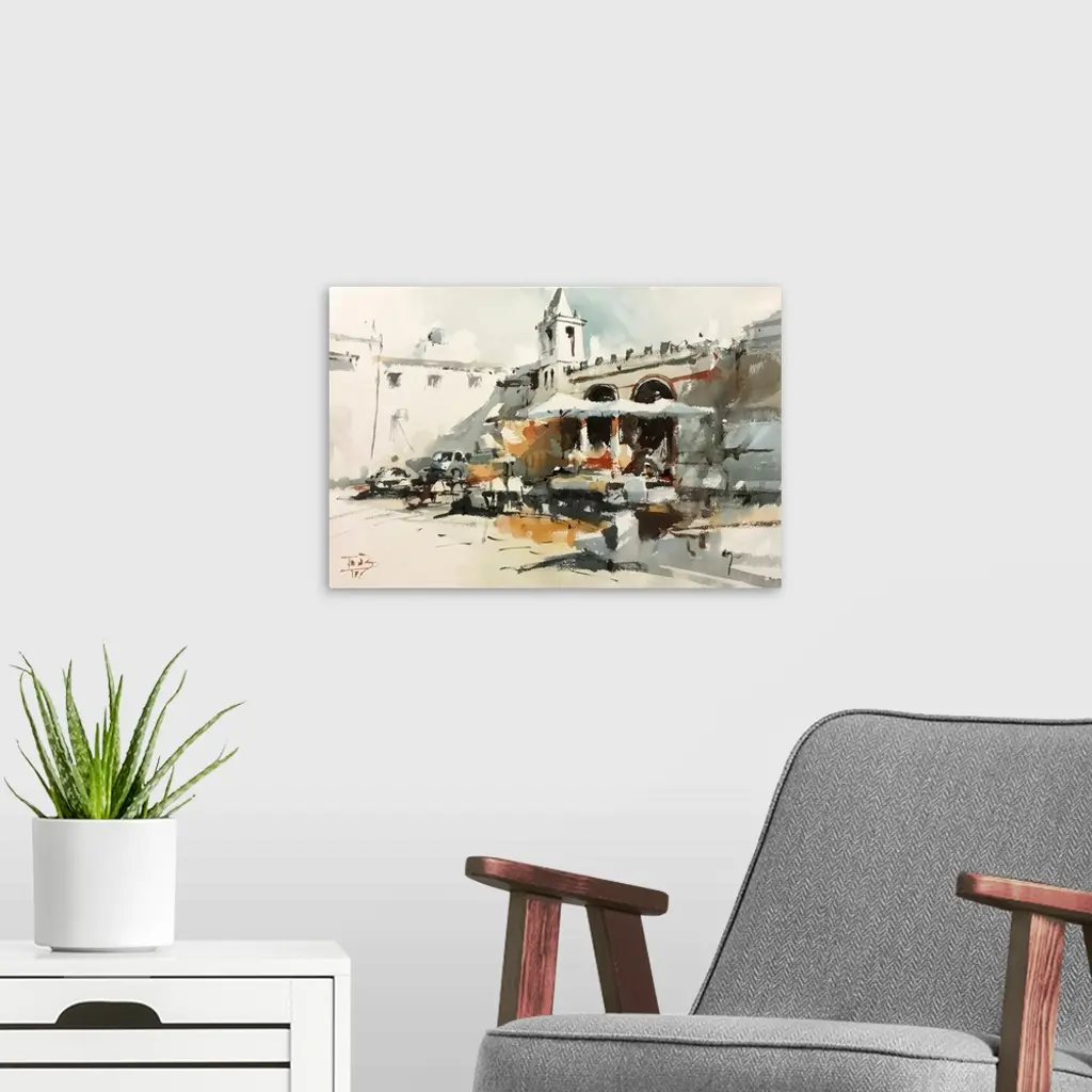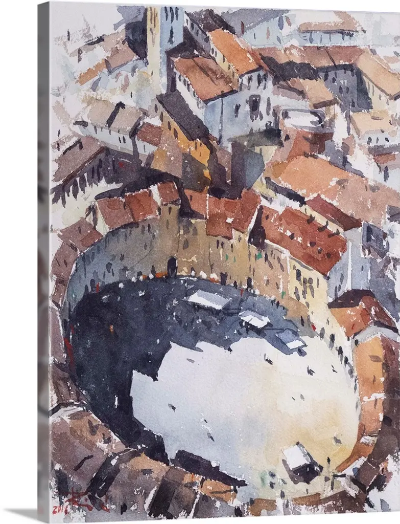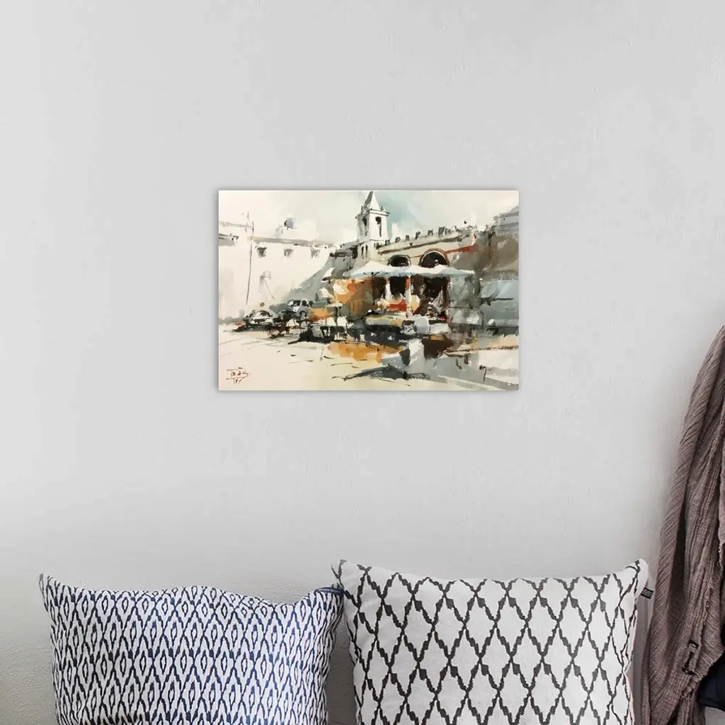 This contemporary artwork is a quick watercolor sketch of one of many Roman squares in Italy.