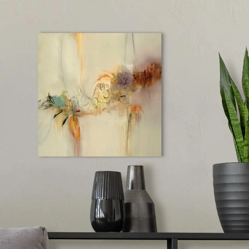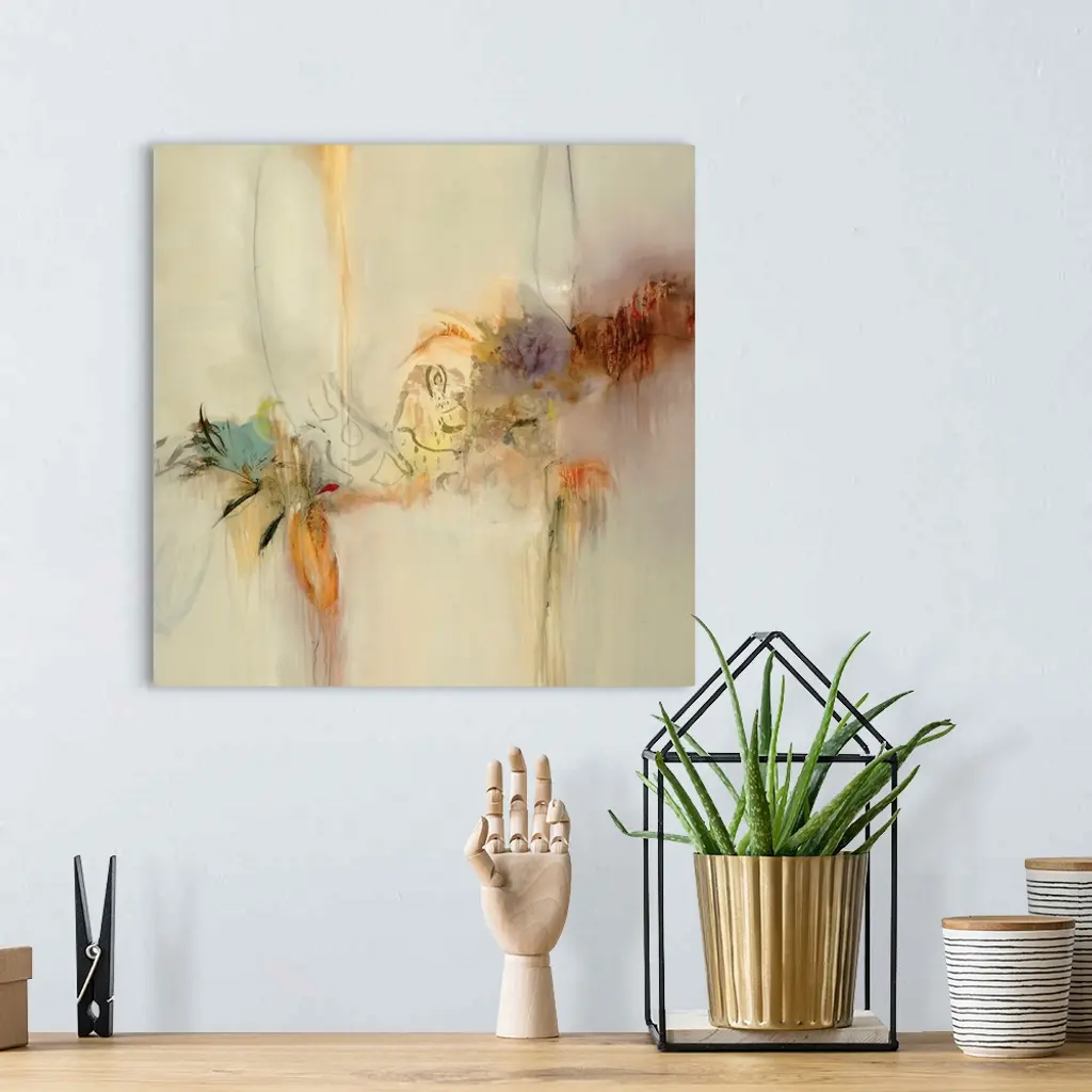 This contemporary, abstract painting is a square shaped decorative accent for a home or office. The painting has a serene composition created with layering paint over various streaks and brush strokes.