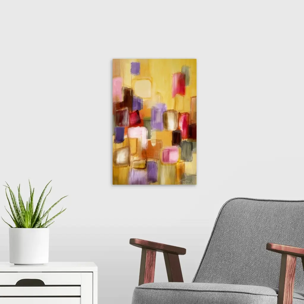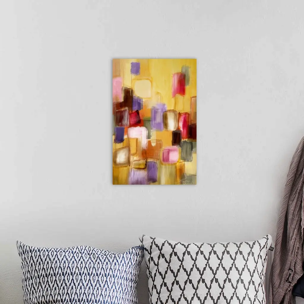 Abstract artwork that has various colored squares and rectangles painted in a vertical pattern.