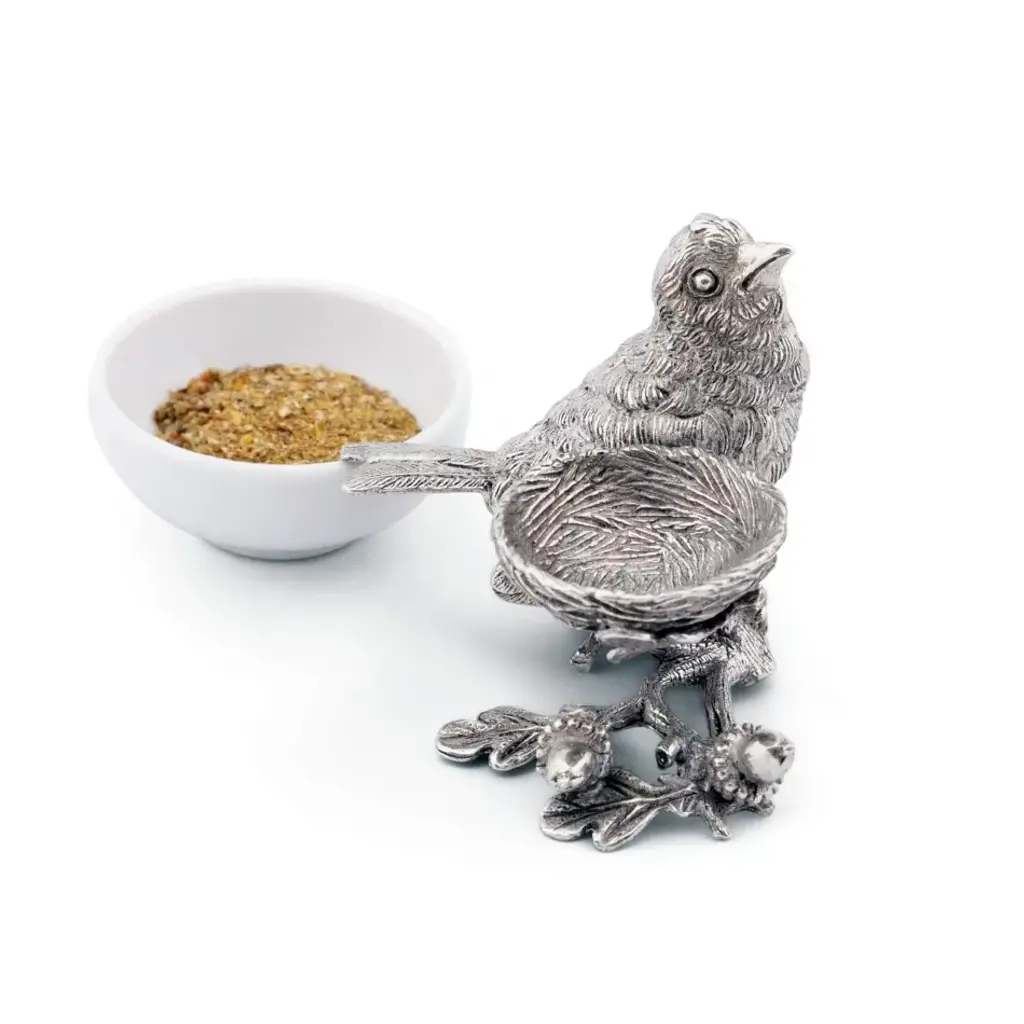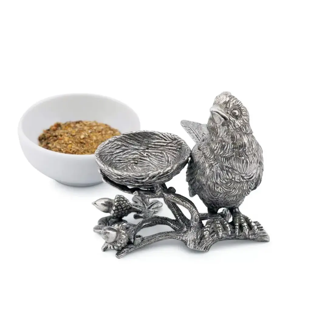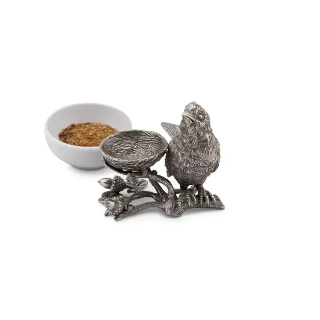 Small in size but big in detail Vagabond House’s Song Bird Salt Cellar is a study in miniature pewter art. A petite pewter nest rests on an oak branch with tiny acorns at the end. Cozied next to it rests a sweet songbird. Fill the stoneware cellar with salt or spice and place into the nest and the artwork is ready for your table. Inspired by a flock of song sparrows that nest near our foothill headquarters in California, Vagabond House’s Song Bird Collection captures their playful, carefree spirit as they sing to us each morning. Holds a generous two Tablespoons of your favorite spice Vagabond House is a family-owned American company specializing in fine pewter tableware, servingware and giftware. Largely inspired by nature, their exclusive products are designed to be unique, functional heirlooms for those who seek to express tradition and style in both family and formal entertaining.
