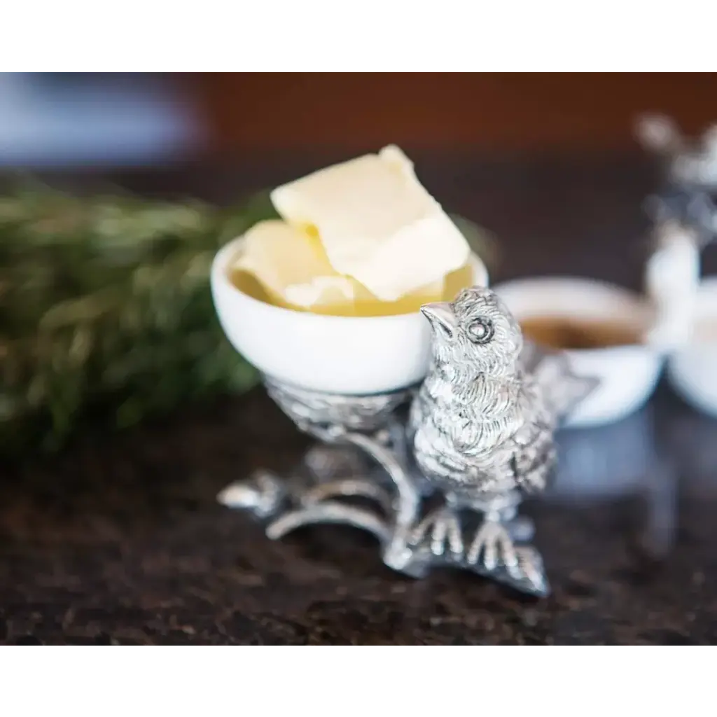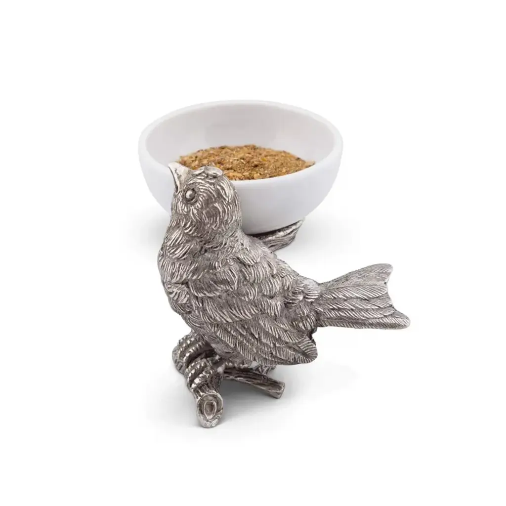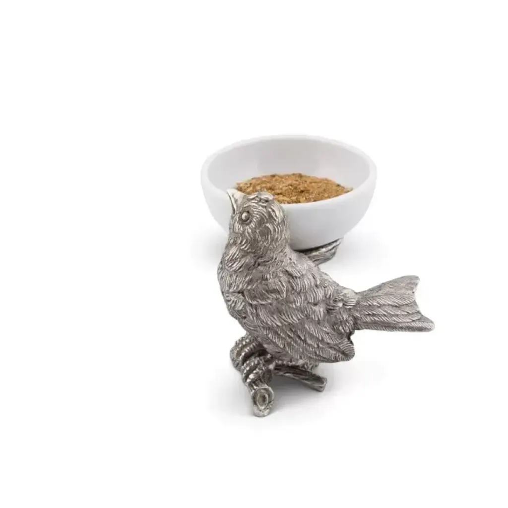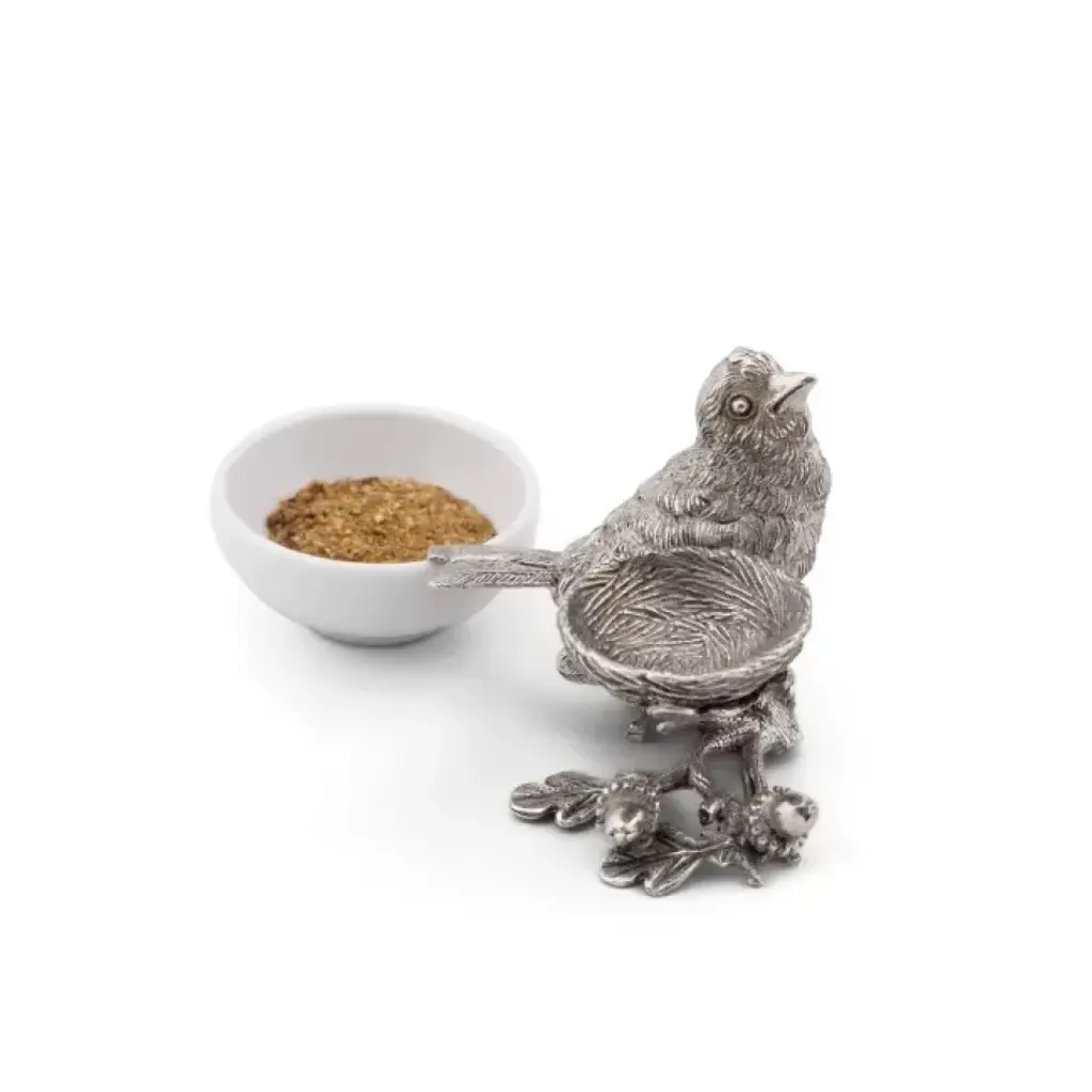Small in size but big in detail Vagabond House’s Song Bird Salt Cellar is a study in miniature pewter art. A petite pewter nest rests on an oak branch with tiny acorns at the end. Cozied next to it rests a sweet songbird. Fill the stoneware cellar with salt or spice and place into the nest and the artwork is ready for your table. Inspired by a flock of song sparrows that nest near our foothill headquarters in California, Vagabond House’s Song Bird Collection captures their playful, carefree spirit as they sing to us each morning. Holds a generous two Tablespoons of your favorite spice Vagabond House is a family-owned American company specializing in fine pewter tableware, servingware and giftware. Largely inspired by nature, their exclusive products are designed to be unique, functional heirlooms for those who seek to express tradition and style in both family and formal entertaining.