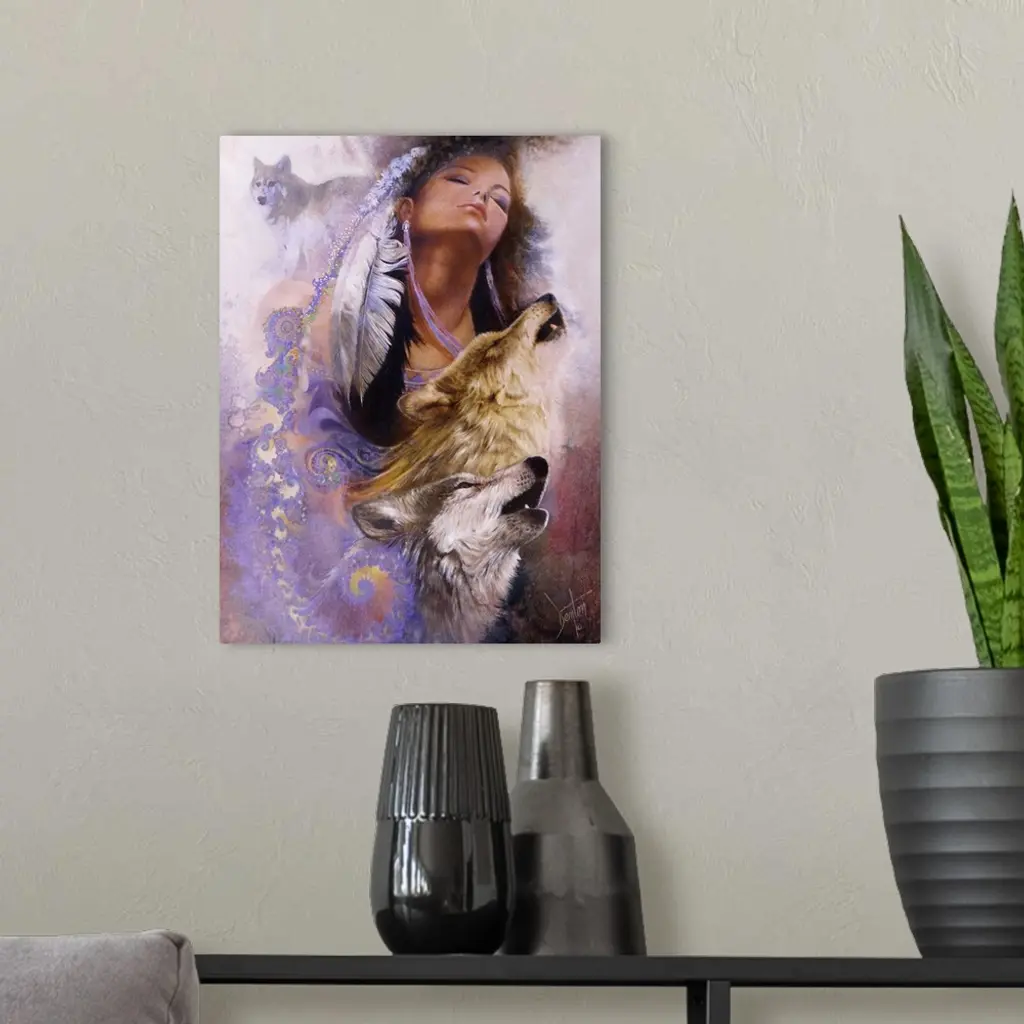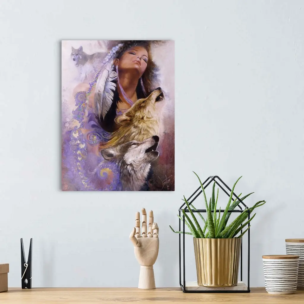 A contemporary painting of a Native American woman with fractals streaming from the feathers in her hair leading down to the images of howling wolves.