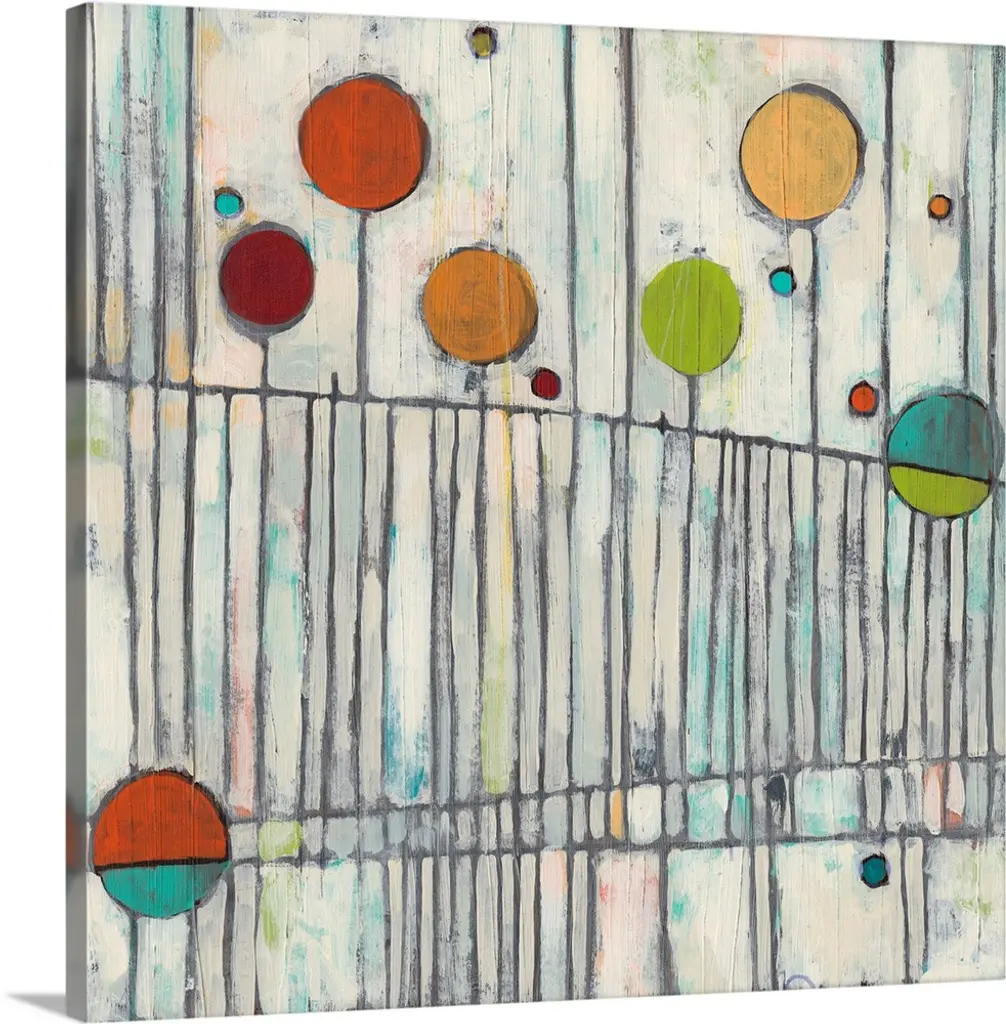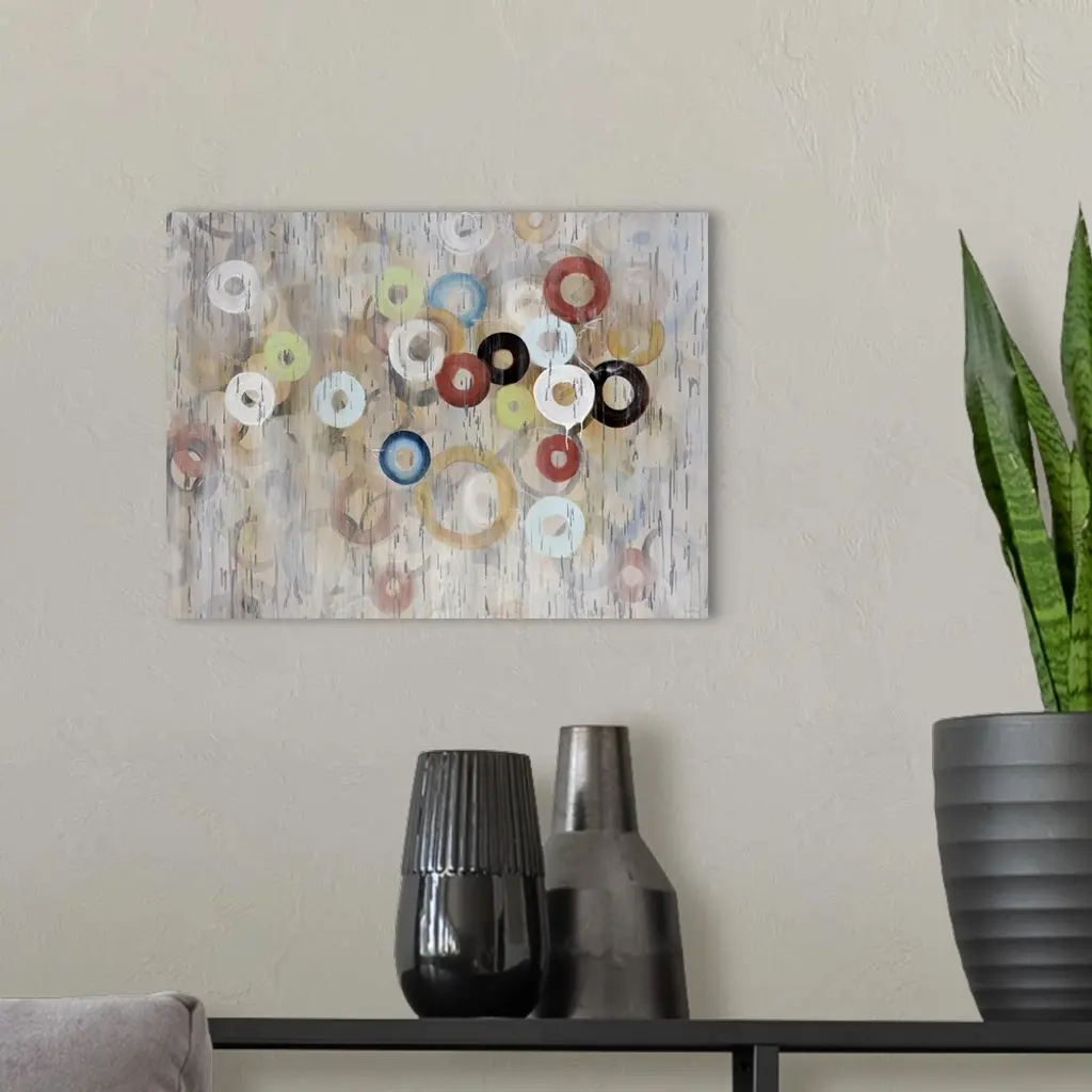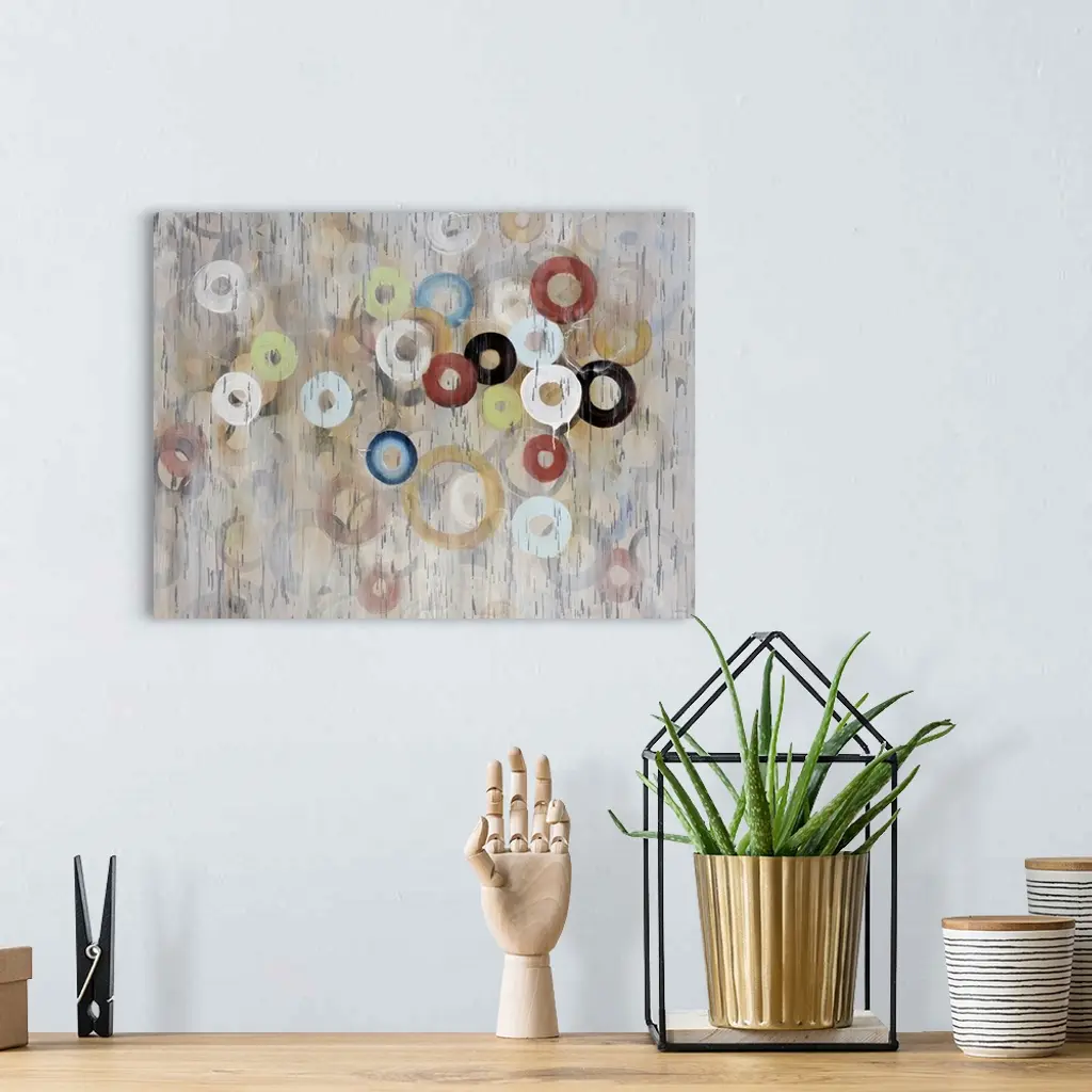 Oversized, contemporary, horizontal painting of a large cluster of circles in various sizes and colors, on a neutral background with many small paint drippings , giving it a distressed appearance.