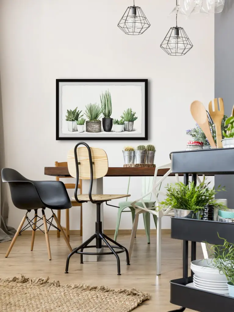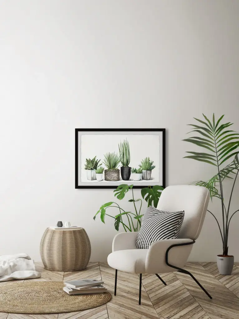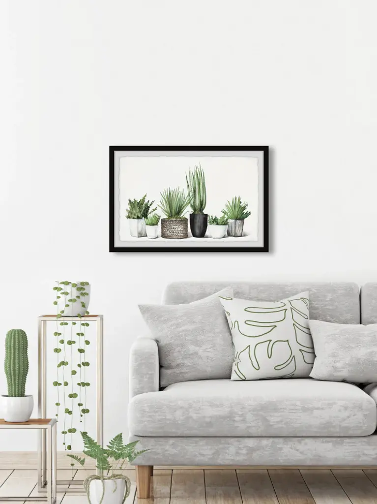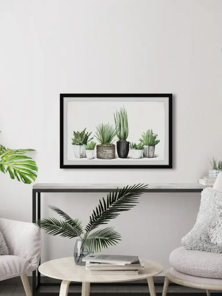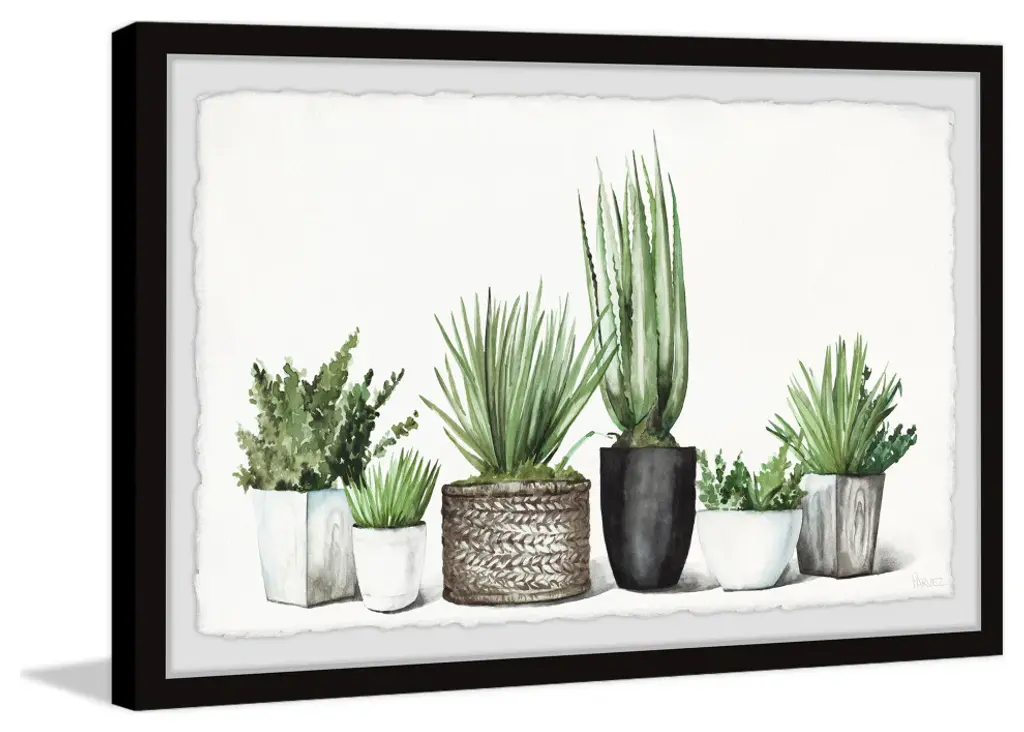 Great for modern and casual spaces, this watercolor painting print features various potted greenery. Proudly printed in the USA, this piece is printed on high quality archive paper and professionally hand-framed. With wall-mounting hooks included, this artful accent is ready to hang up as soon as it reaches your front door.Canadian artist, Parvez Taj uses water paints, photographs, software, and UV cured inks to create his wall art. His artwork connects the out-of-reach luxury art world with the modern, fashion-conscious home decorator by delivering high quality artwork that is both affordable and hip.Top quality Giclee print on high resolution Archive PaperHand cut deckled edgesHigh quality durable non-warping frameFinished under shatter resistant plexiglassArrives ready to hangIncludes a certificate of authenticityPrinted in the USAArtist signature on the front