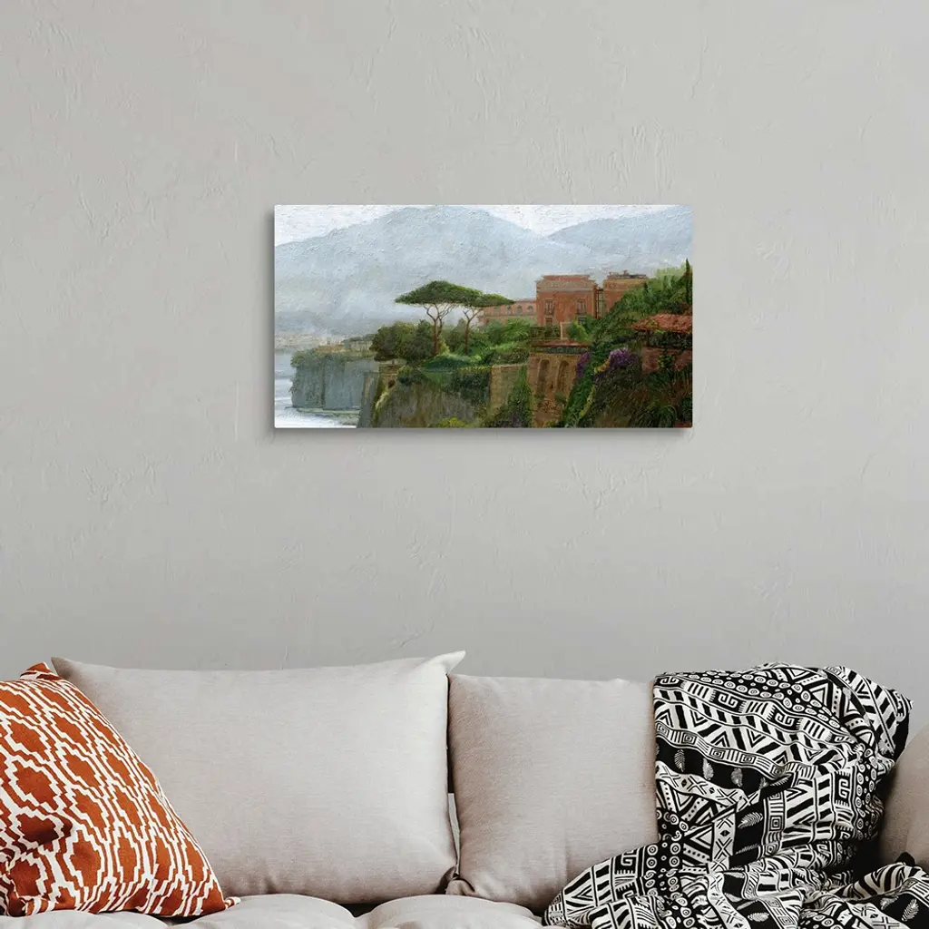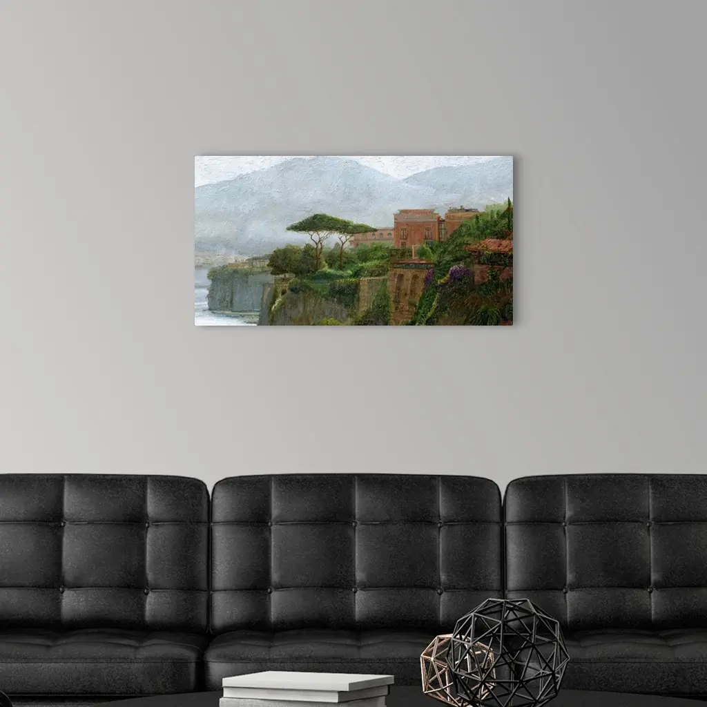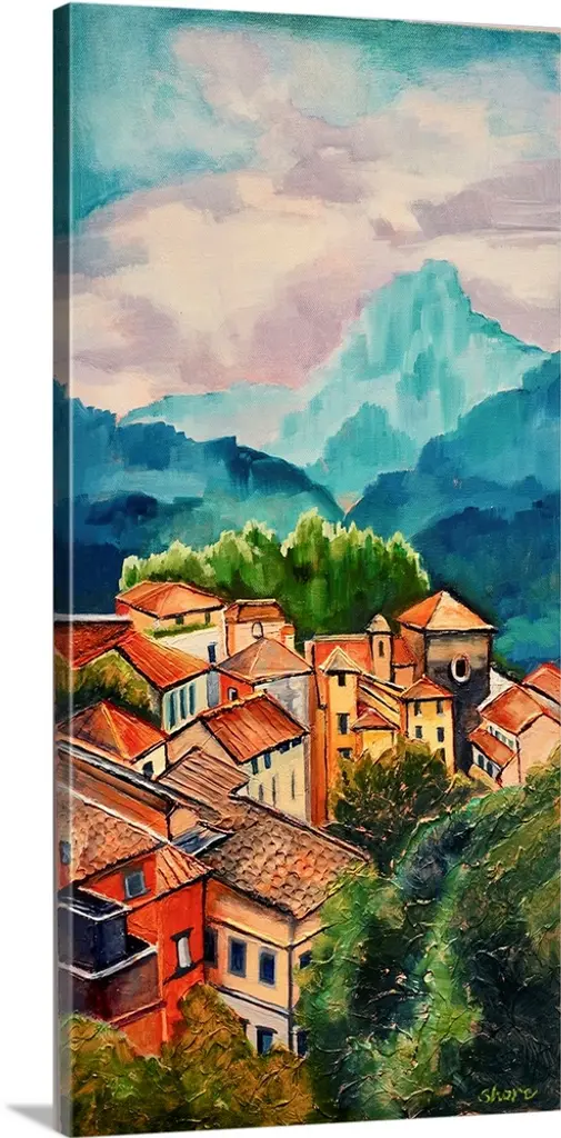 A contemporary painting of an Italian village on the Amalfi Coast showing lush plants growing around stuccoed homes in this landscape wall art.