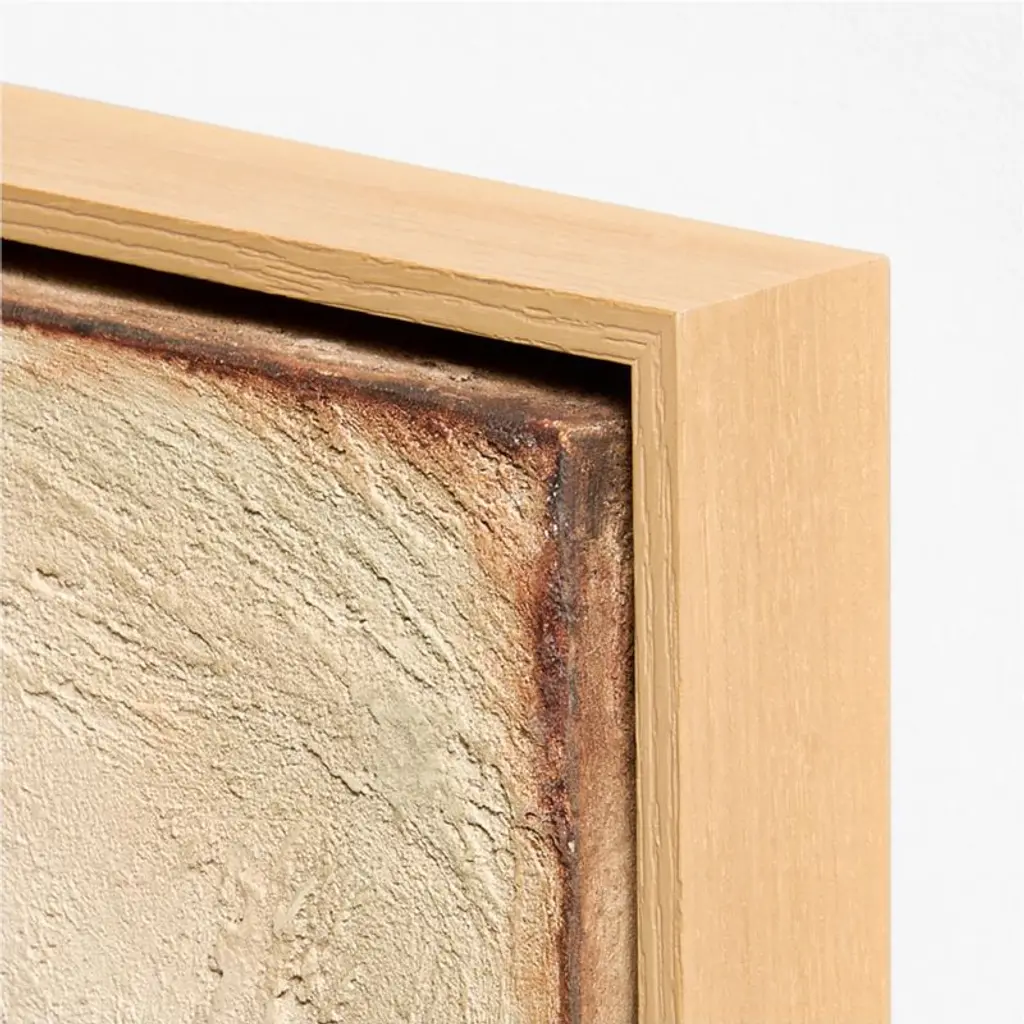 Summers in a sun-baked village in Pakistan inspired Aliyah Sadaf's monochromatic composition. Using a warm neutral palette, the artist suggests the town's concrete and clay buildings in two overlapping rectangles set against a backdrop of modulated tones. Each handpainted canvas replicates the original painting and is presented in a slim wood frame with an embossed grain finish.