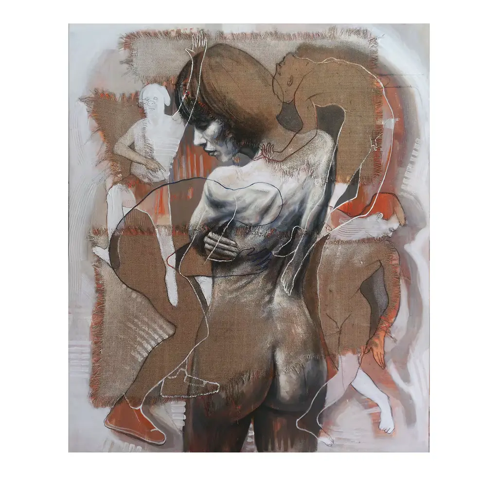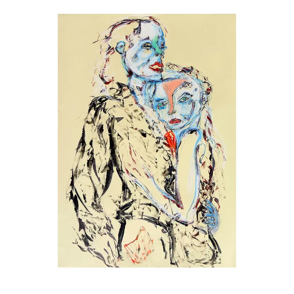 A black anthropomorphic figure of Cubist inspiration wearing flip flops is the whimsical subject of this oil on canvas painting. Its artful character acquires a contemplative vision when considering that the sweet cotton candy-like doll the figure holds between its arms represents its soul. The pink backdrop decorated with polychrome brushstrokes symbolizes the afterlife.