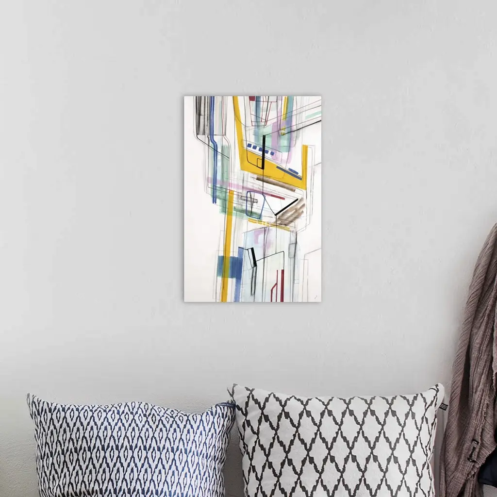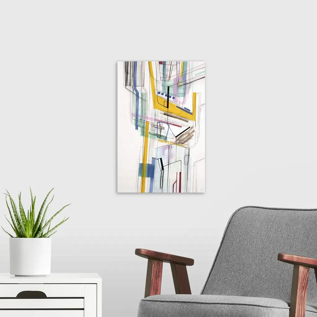 Large vertical modern artwork of multi-colored lines interlacing.