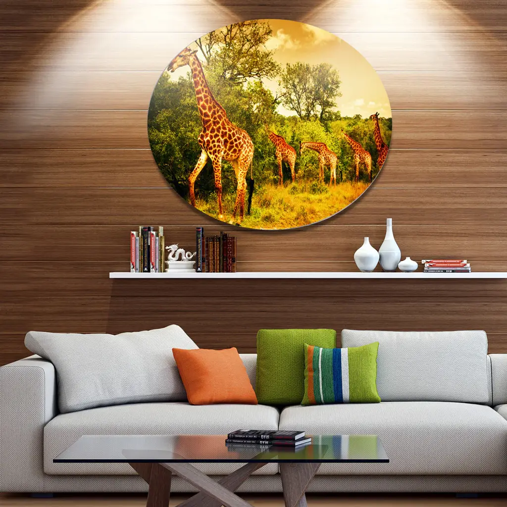 Bring Contemporary Abstraction to your home with this large Circle Metal wall art. This South African Giraffes Metal Artwork makes it the focal point of any room or office. - White Gloss Coating ensures colors are extra vibrant with light reflection.- Aluminum grade Sheet Metal with 1 inch mounting frame on the back giving the illusion that the artwork is floating on the wall..- Mounting Brackets are included along with instructions.- High Quality Digital images are created directly into a glossy aluminum panel producing a stunning and captivating print into the glossy finish of the metal.- Water, Fire and Scratch resistant HD Aluminum panels.- Looks better than any photo paper and guaranteed to last at least 20 years- Easy to clean with a microfiber cloth. Colors are far superior to regular Canvas Art. - Easy to Hang