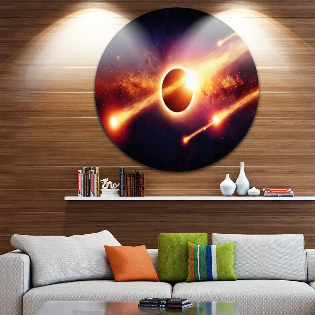 Bring Contemporary Abstraction to your home with this large Circle Metal wall art. This Space Apocalypse Metal Artwork makes it the focal point of any room or office. - White Gloss Coating ensures colors are extra vibrant with light reflection.- Aluminum grade Sheet Metal with 1 inch mounting frame on the back giving the illusion that the artwork is floating on the wall..- Mounting Brackets are included along with instructions.- High Quality Digital images are created directly into a glossy aluminum panel producing a stunning and captivating print into the glossy finish of the metal.- Water, Fire and Scratch resistant HD Aluminum panels.- Looks better than any photo paper and guaranteed to last at least 20 years- Easy to clean with a microfiber cloth. Colors are far superior to regular Canvas Art. - Easy to Hang