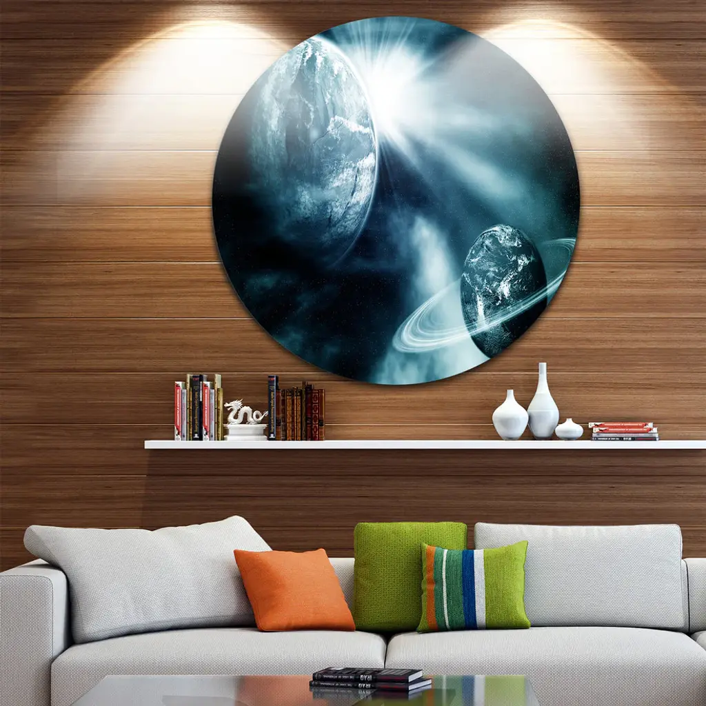 Bring Contemporary Abstraction to your home with this large Circle Metal wall art. This Space View with Two Planets Metal Artwork makes it the focal point of any room or office. - White Gloss Coating ensures colors are extra vibrant with light reflection.- Aluminum grade Sheet Metal with 1 inch mounting frame on the back giving the illusion that the artwork is floating on the wall..- Mounting Brackets are included along with instructions.- High Quality Digital images are created directly into a glossy aluminum panel producing a stunning and captivating print into the glossy finish of the metal.- Water, Fire and Scratch resistant HD Aluminum panels.- Looks better than any photo paper and guaranteed to last at least 20 years- Easy to clean with a microfiber cloth. Colors are far superior to regular Canvas Art. - Easy to Hang