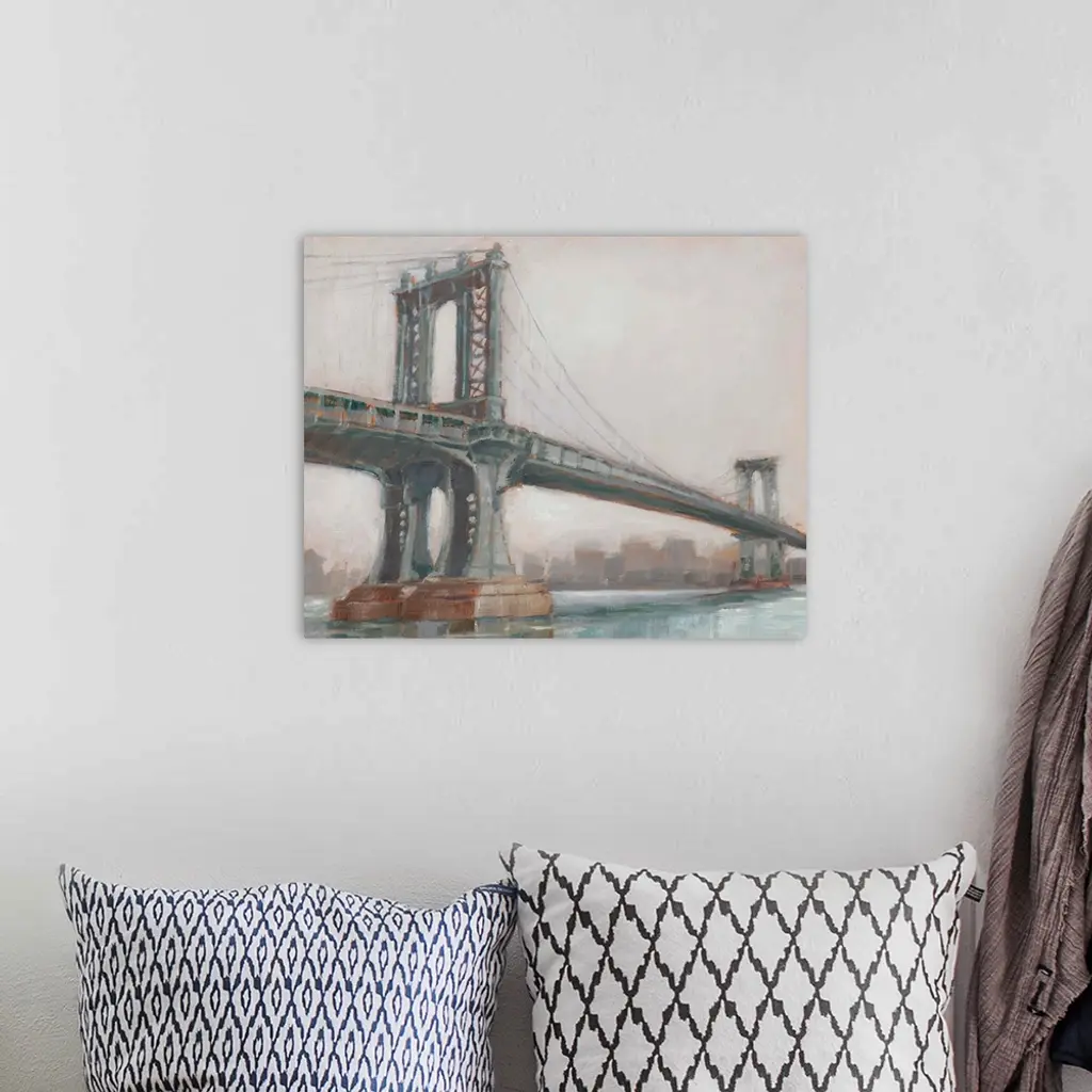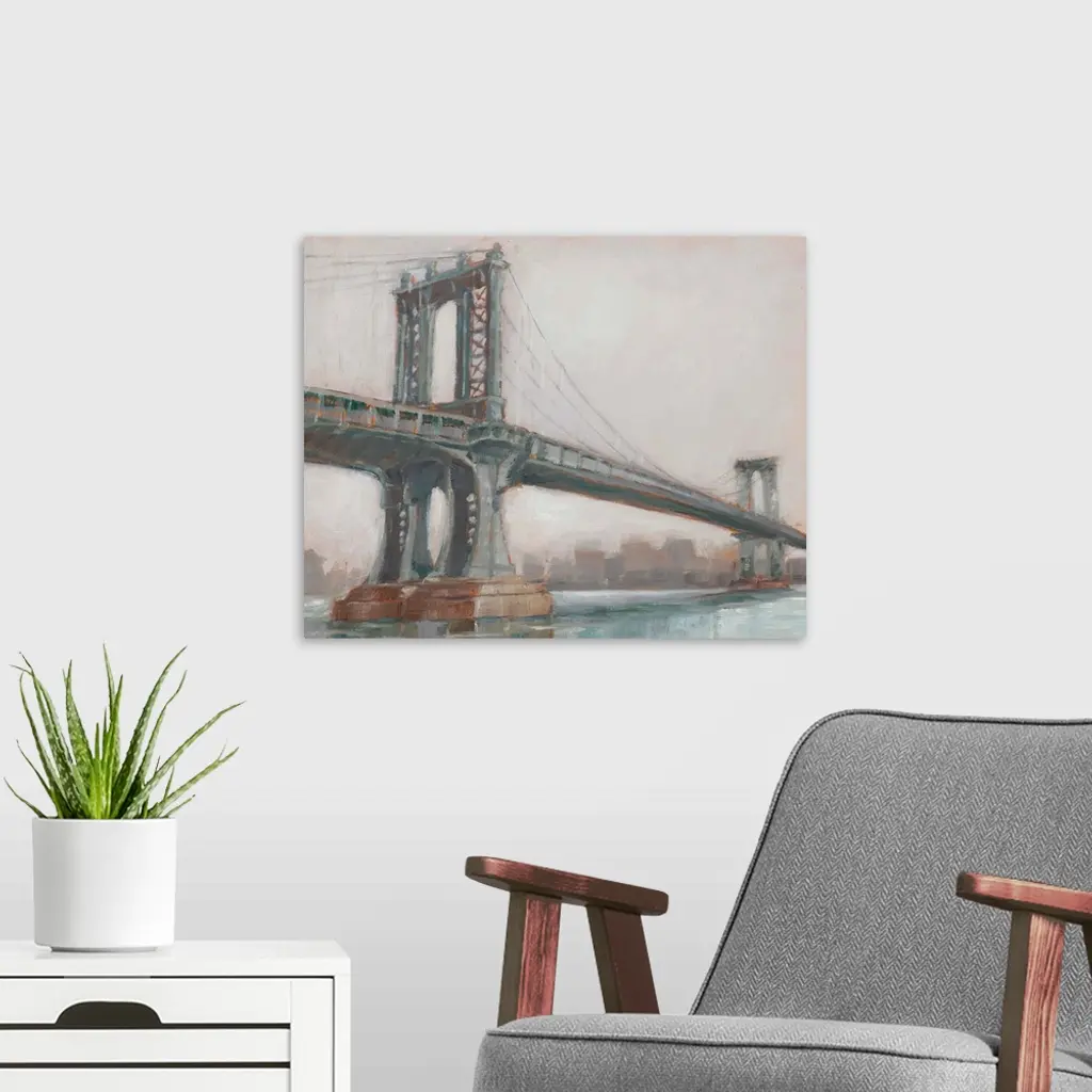 A picturesque painting of Manhattan Bridge in New York, in subdue colors with the city in the background.