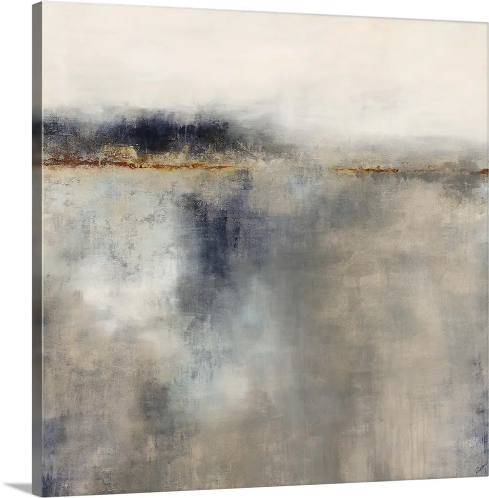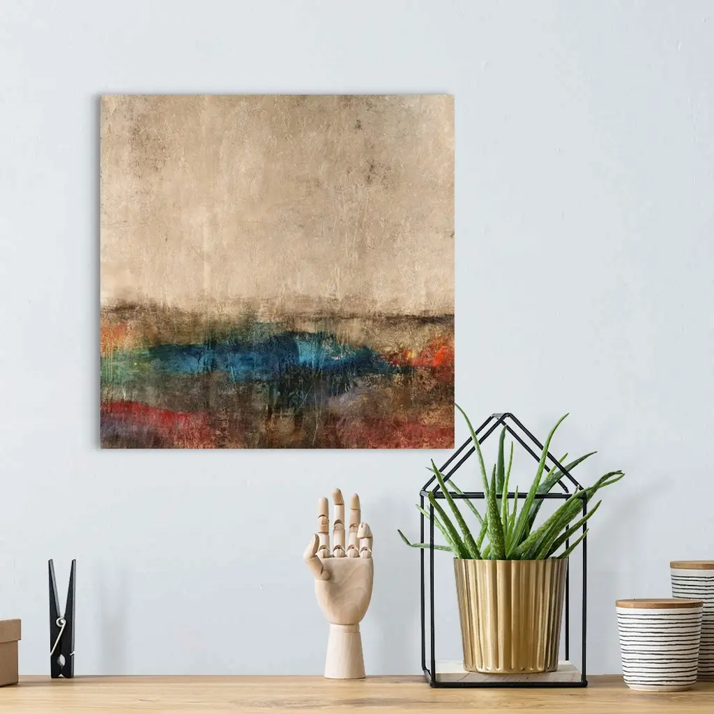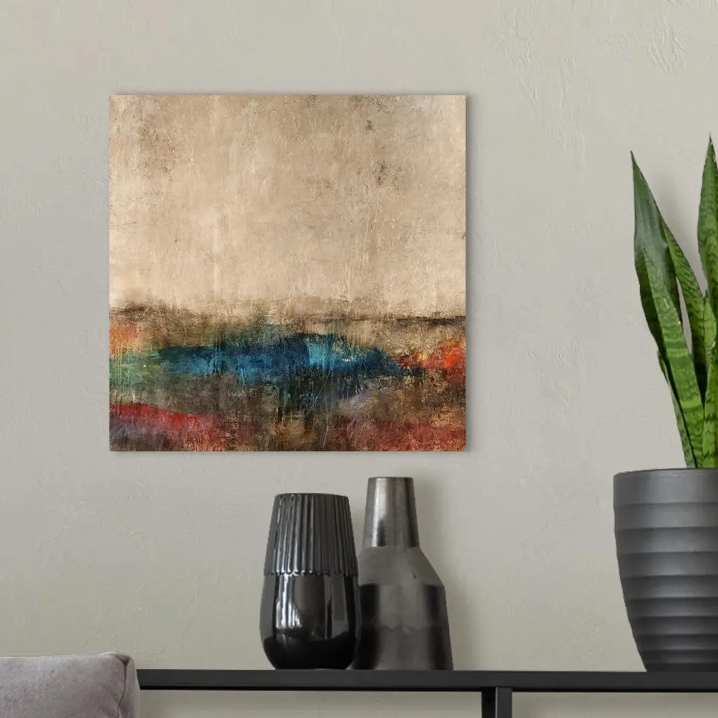 Abstract painting of natural looking colors coming together to form what looks like a landscape.