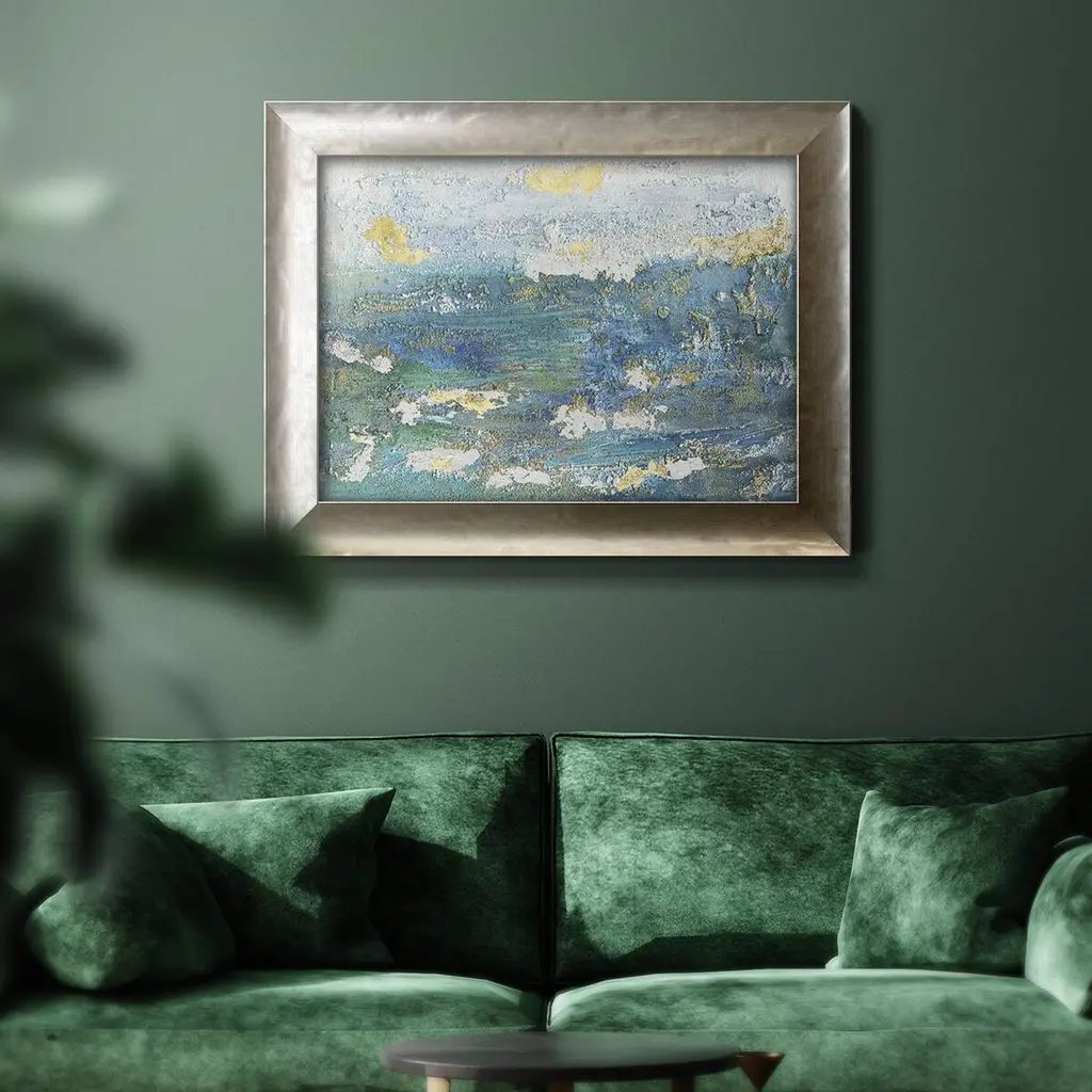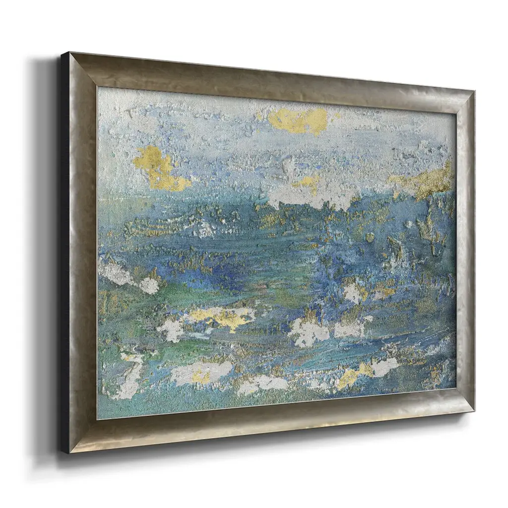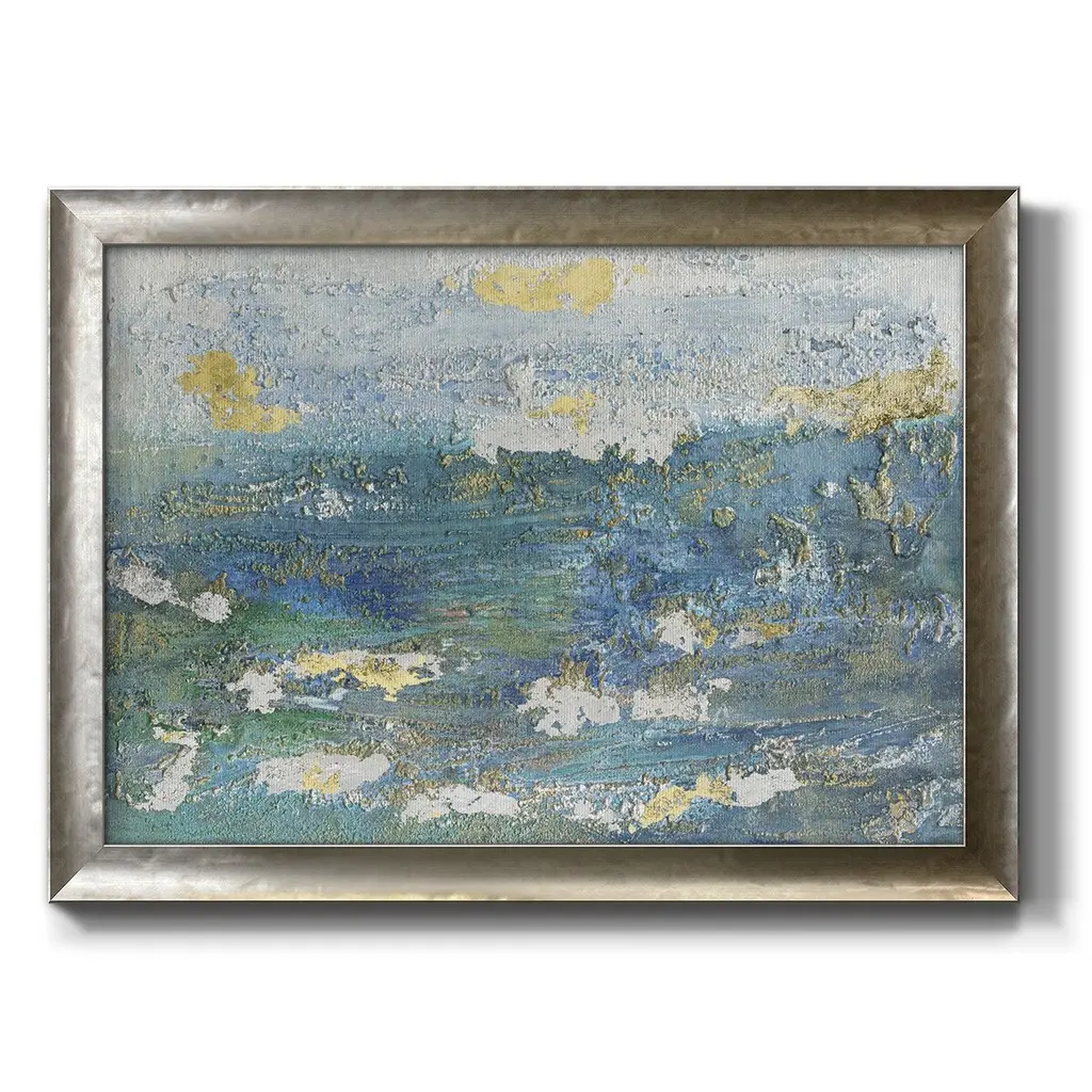 Sparkling Sea I Premium Framed Canvas- Ready to Hang A Premium Framed Canvas created to last. Framed in distressed wood and available in an array of sizes and colors Featuring a beveled a solid wood stretcher bar, each piece comes ready to hand 3 SIZES AVAILABLE 16''X20'' - Overall Size 18'X27'' - Overall Size 24''x36'' - Overall Size Each piece is made to order. Each piece comes with hanging hardware. Made in the USA Ready to Hang Giclee Paper Print Acrylic Glass Beveled Matt Board