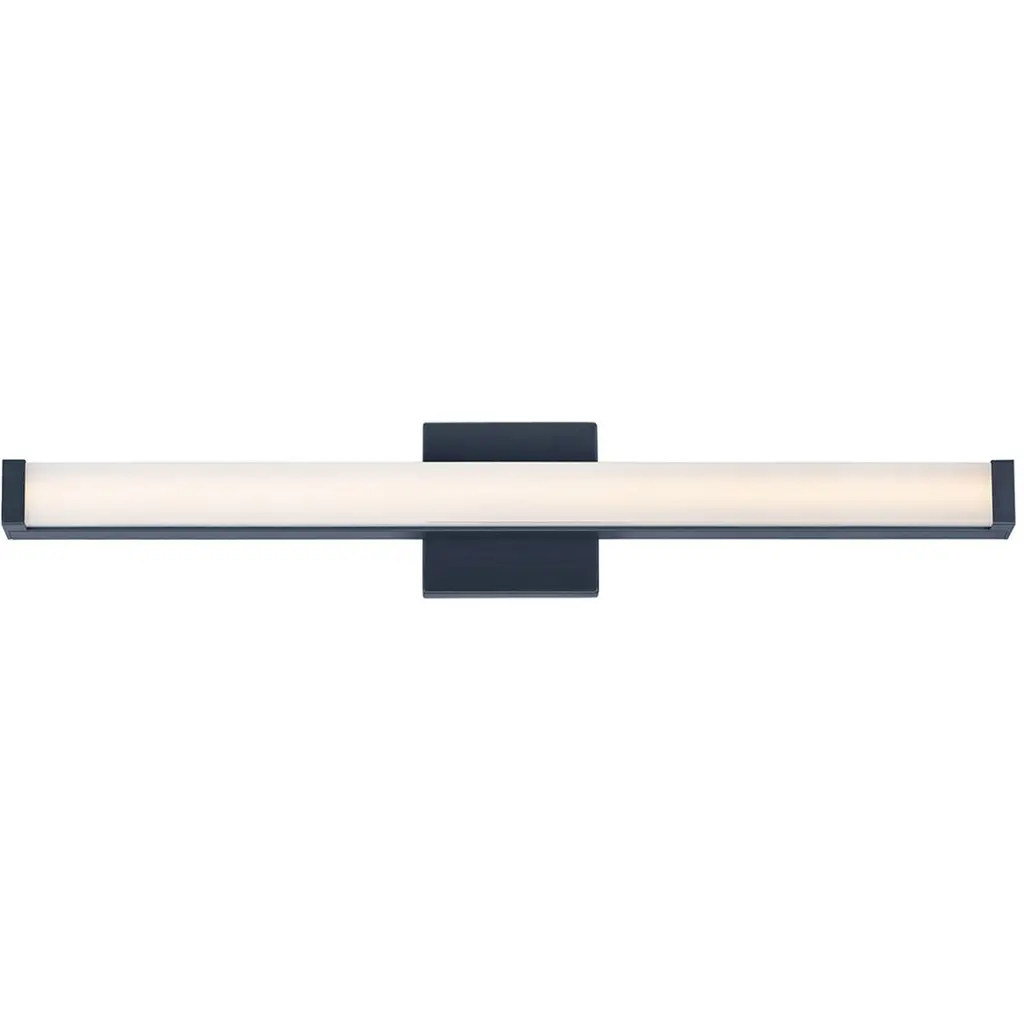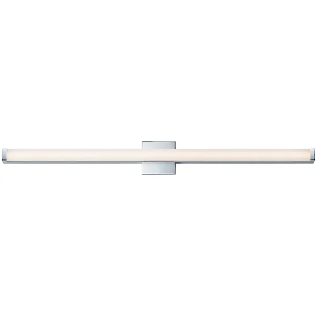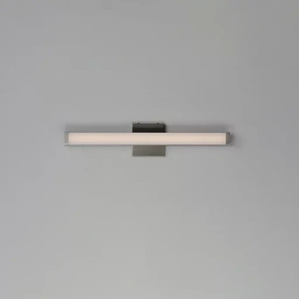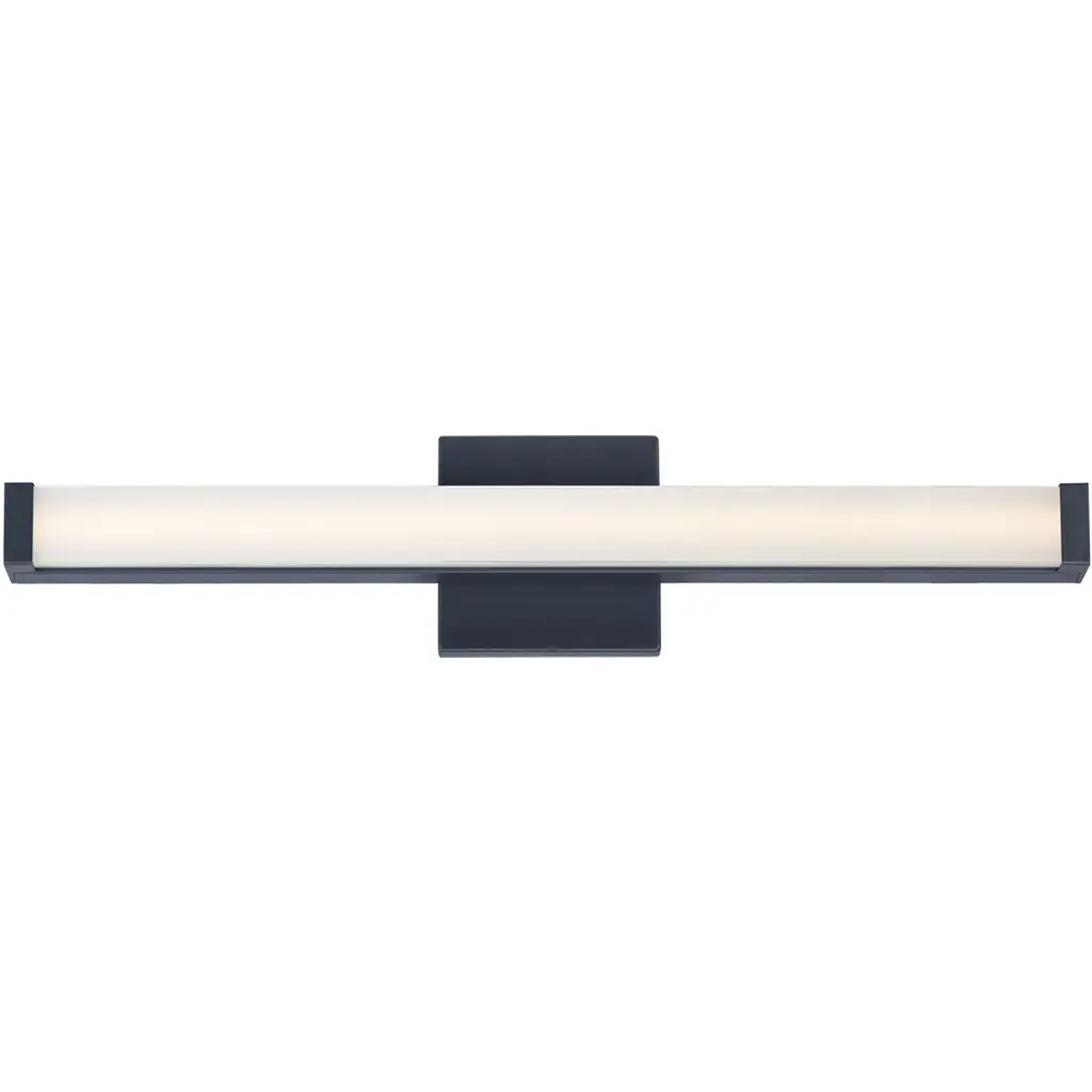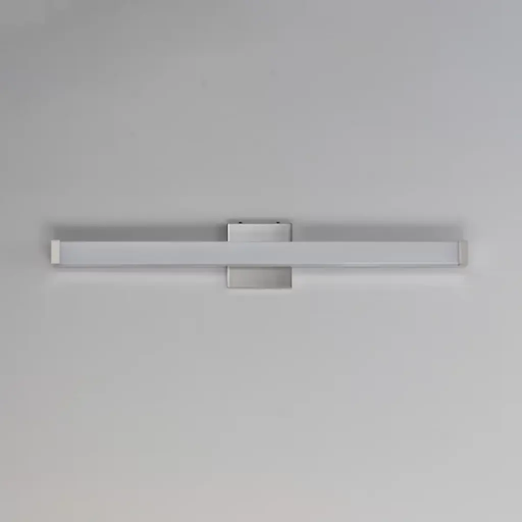 The Spec LED Vanity Light from Maxim Lighting reflects modernist bathroom design principles, emphasizing clean horizontal lines and functional illumination. The design approach is based on creating uniform light distribution through an elongated profile, which is suitable for mirror placement. A square backplate anchors the trim metal housing, detailed with brackets at each end. The aluminum construction features an acrylic diffuser that produces radiant, uniform illumination from integrated LEDs. Installation flexibility allows both horizontal and vertical mounting configurations for various bathroom layouts.