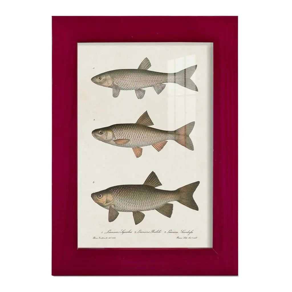 Species of Antique Fish IV -EZ SWITCH Framed Print w/glass-Cherry Red A delightful, framed print. Featuring a solid wood frame with real wood glass. This premium print is giclee quality. In addition, every frame features a removable back and table top stand. This allows you to change your art in the future or to just stand the art on a table for a new look. We are sure you'll enjoy our new series of EZ SWITCH Framed Art. Solid Wood Frame Real Glass Removable / Replaceable Art Built in Tabletop Stand Sizes range from 4x6 up to 12x15 - buy just one or pair them up as sets as you see fit.