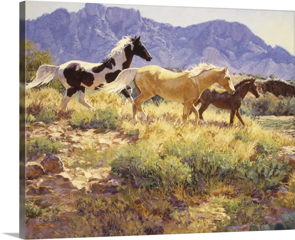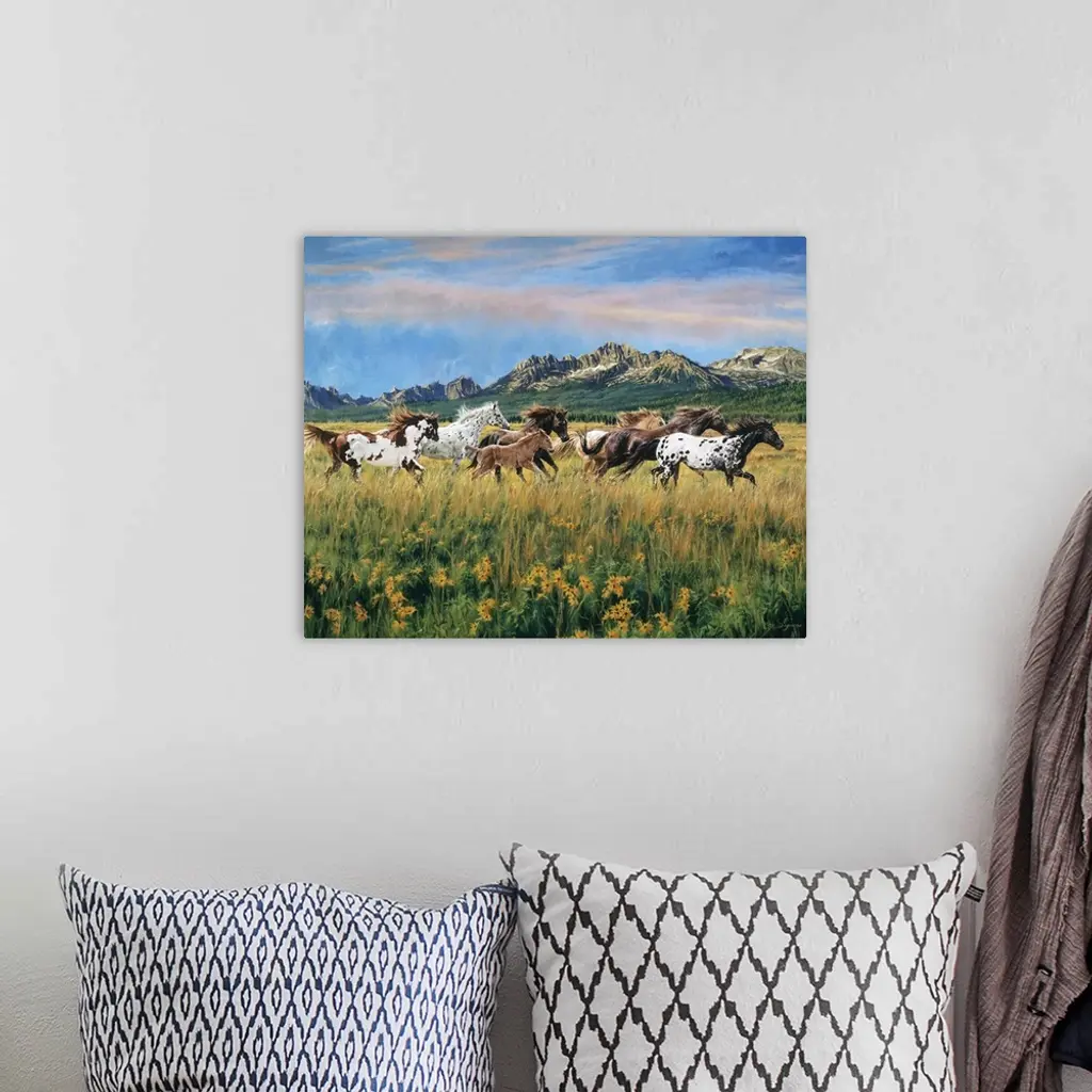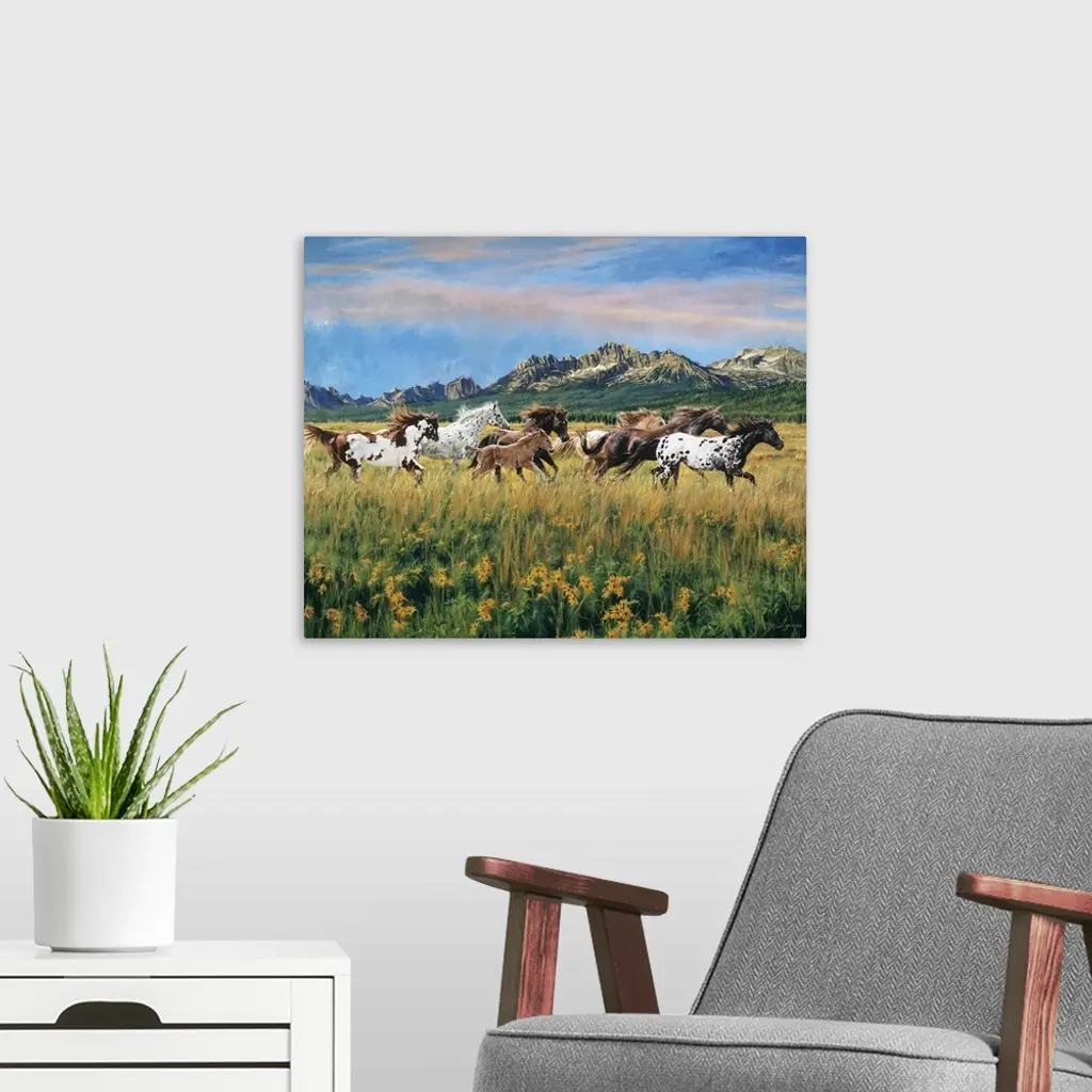 Painting of wild horses running through a meadow of flowers and tall grass with mountains in the distance under a cloudy sky.