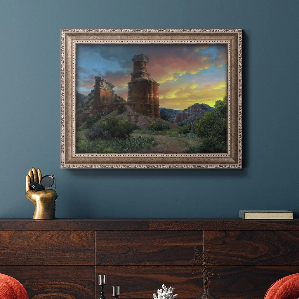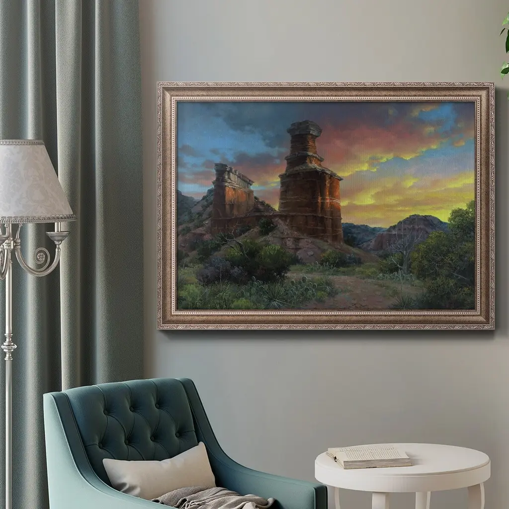 Spell of the Palo Duro Premium Framed Canvas- Ready to Hang A Premium Framed Canvas created to last. Framed in distressed wood and available in an array of sizes and colors Featuring a beveled a solid wood stretcher bar, each piece comes ready to hand 3 SIZES AVAILABLE 16''X20'' - Overall Size 18'X27'' - Overall Size 24''x36'' - Overall Size Each piece is made to order. Each piece comes with hanging hardware. Made in the USA Ready to Hang Giclee Paper Print Acrylic Glass Beveled Matt Board