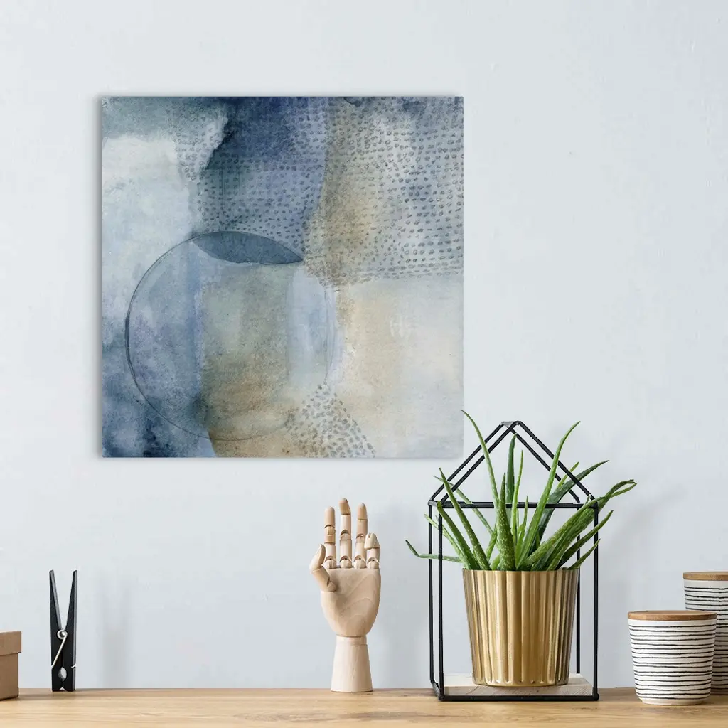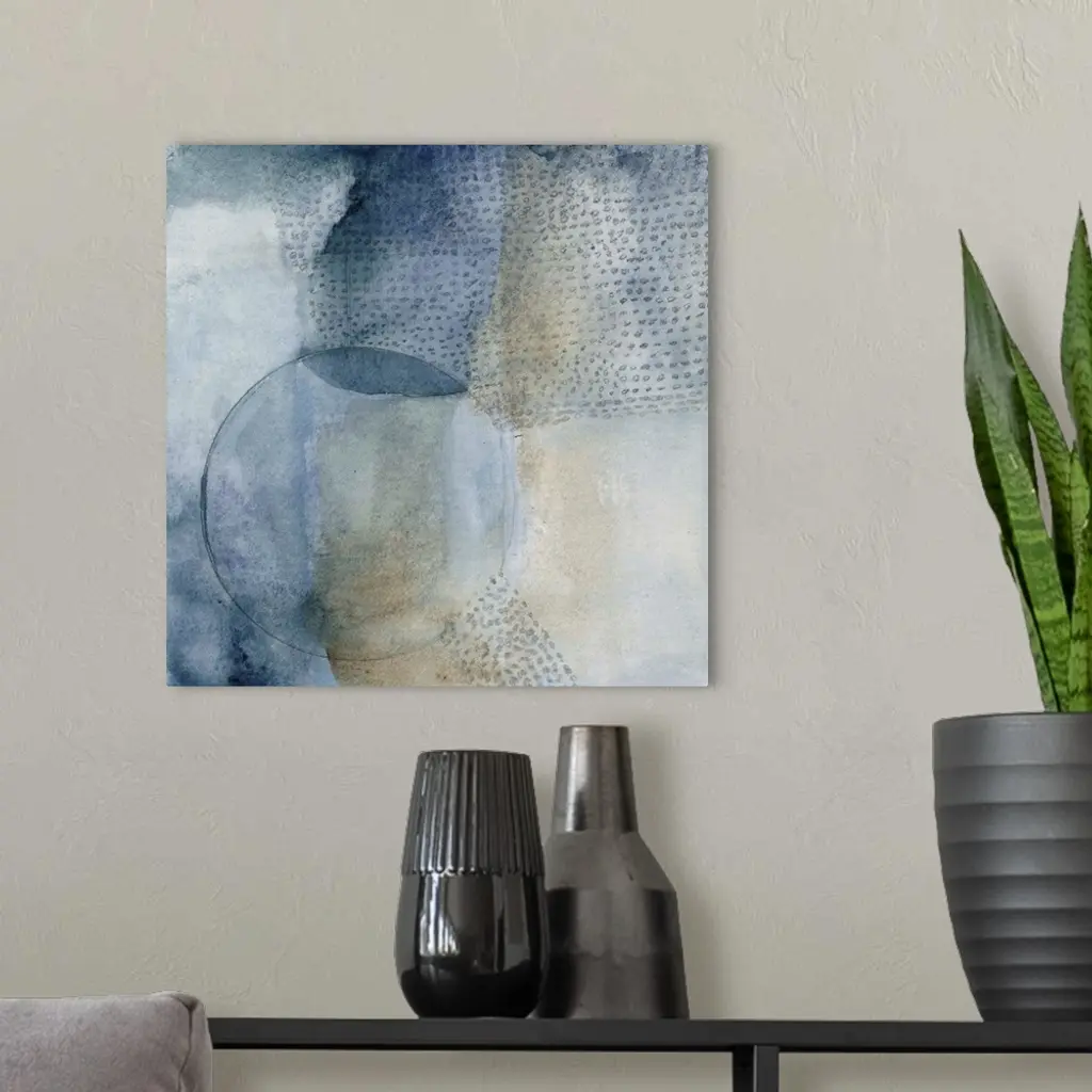 This contemporary artwork is a series of flowing watercolor backgrounds featuring a circular shape with dotted patterns as accents.
