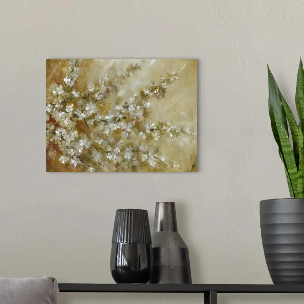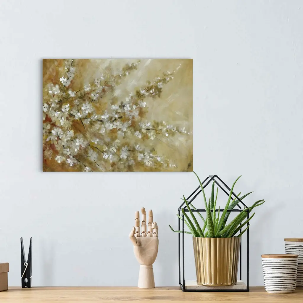 Contemporary painting of a tree with branches full of white blossoms.