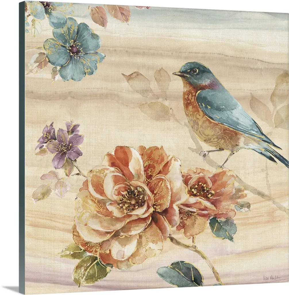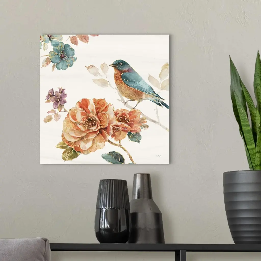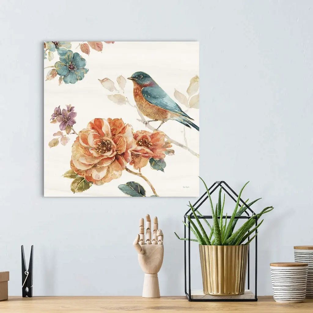 Contemporary square painting of a bird standing on a flower in warm tones of brown, red and green.