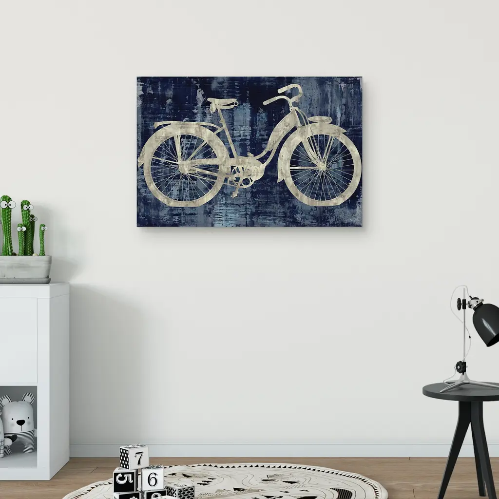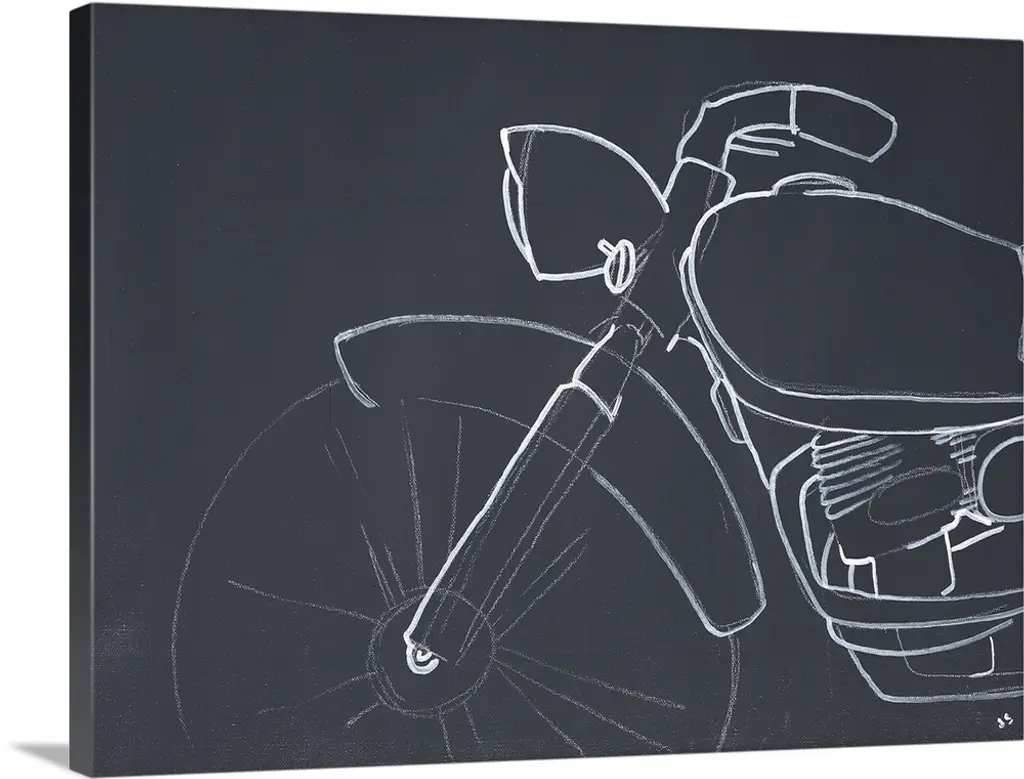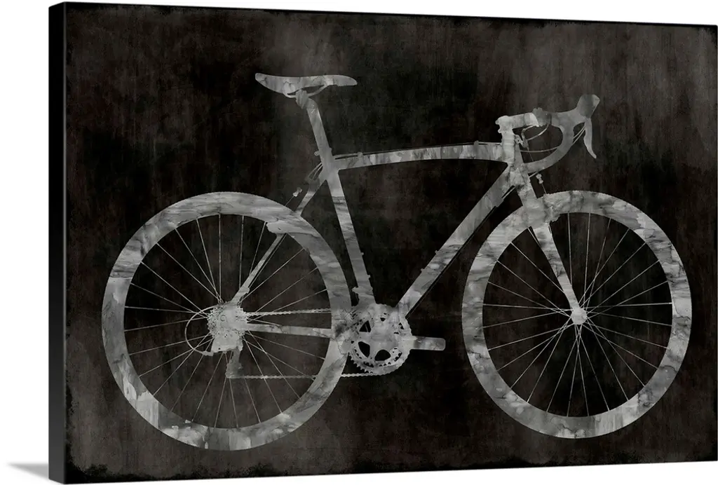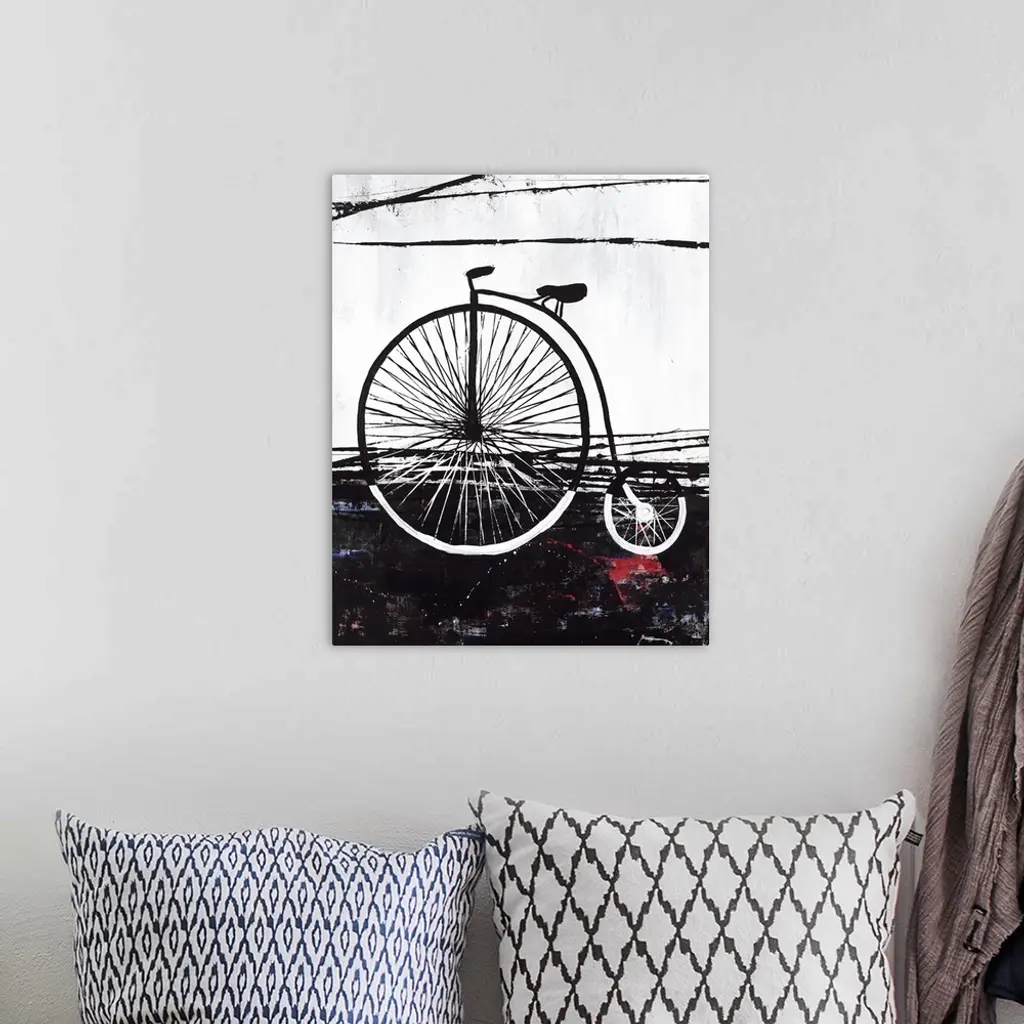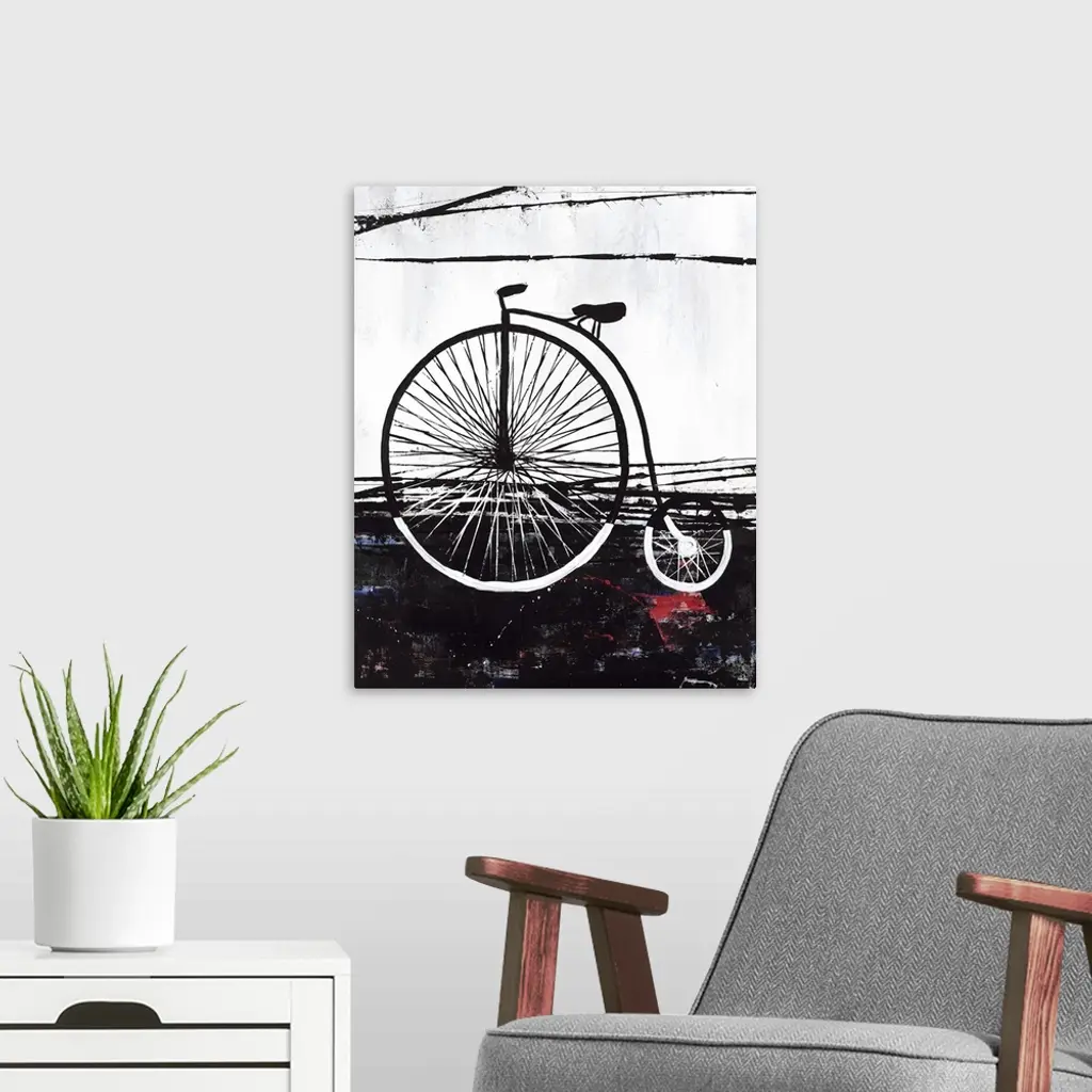 Contemporary painting of a penny-farthing bicycle in black and white with small hints of red and blue on the bottom half.