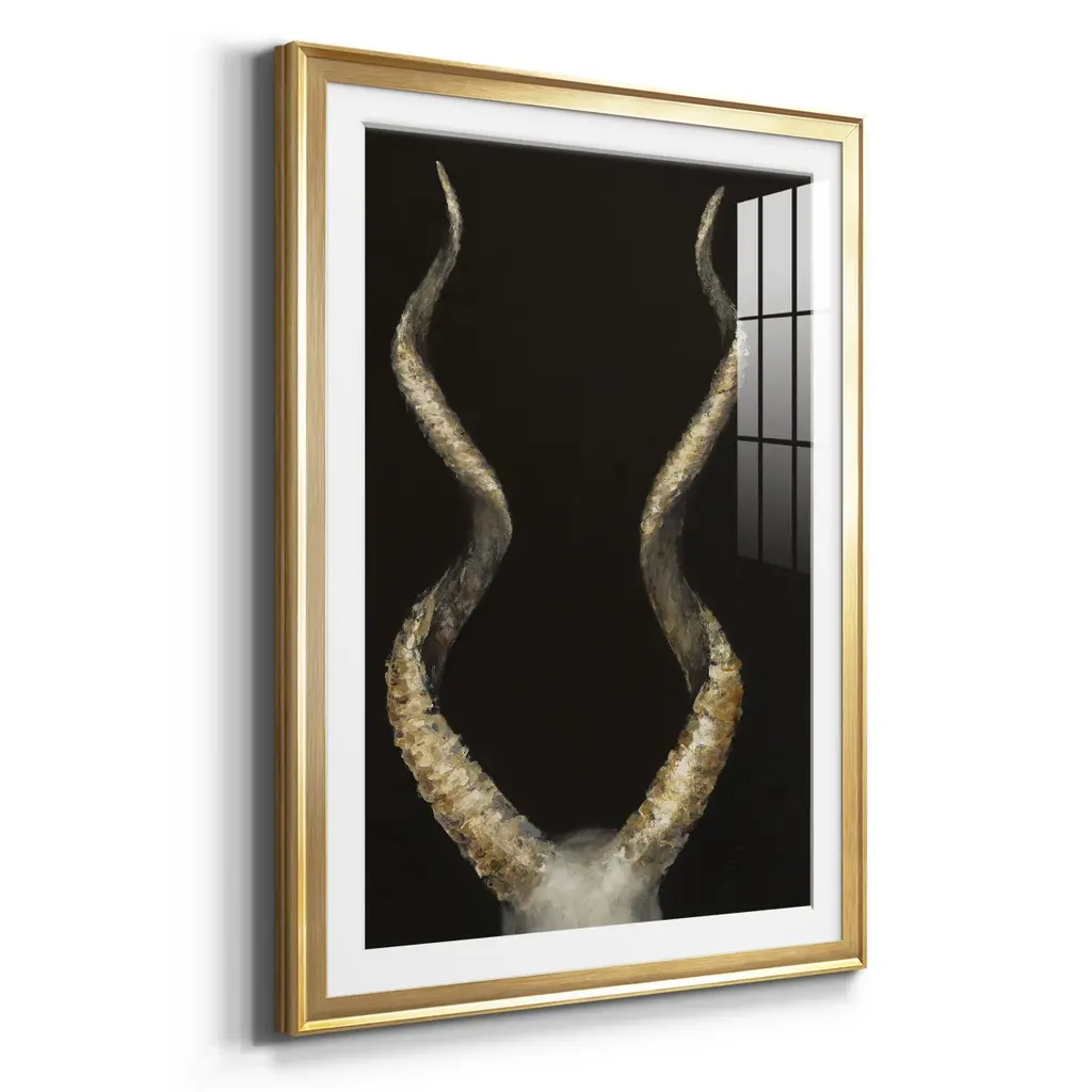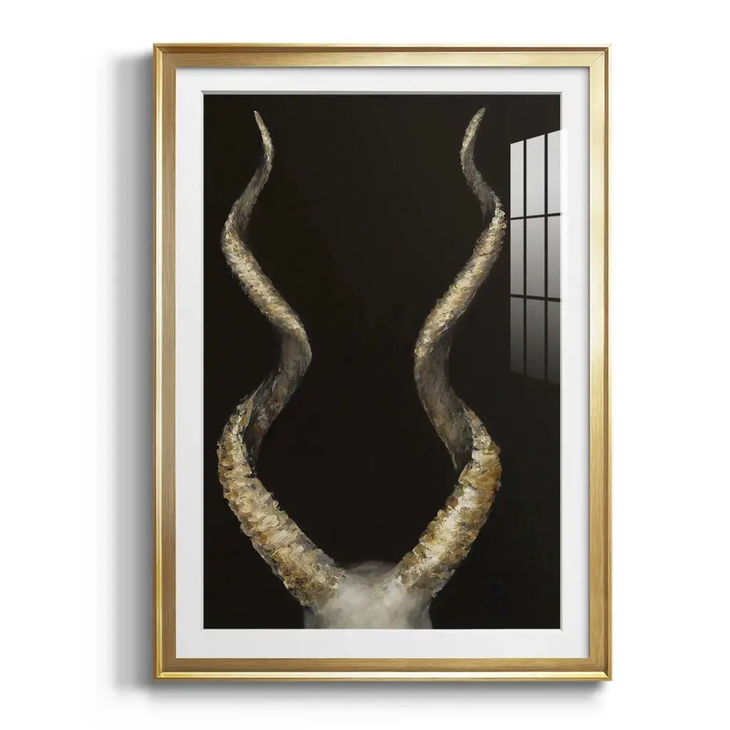 Spiral Antelope Horns Premium Framed Print - Ready to Hang A Premium Framed Print created to last. Framed in distressed wood and available in an array of sizes and colors Featuring a beveled a solid wood stretcher bar, each piece comes ready to hand 4 SIZES AVAILABLE 30.5''X42.5'' - Overall Size 26.5'X36.5'' - Overall Size 22.5''x30.5'' - Overall Size 18.5''x24.5'' - Overall Size Each piece is made to order. Each piece comes with hanging hardware. Made in the USA Ready to Hang Giclee Paper Print Acrylic Glass Beveled Matt Board