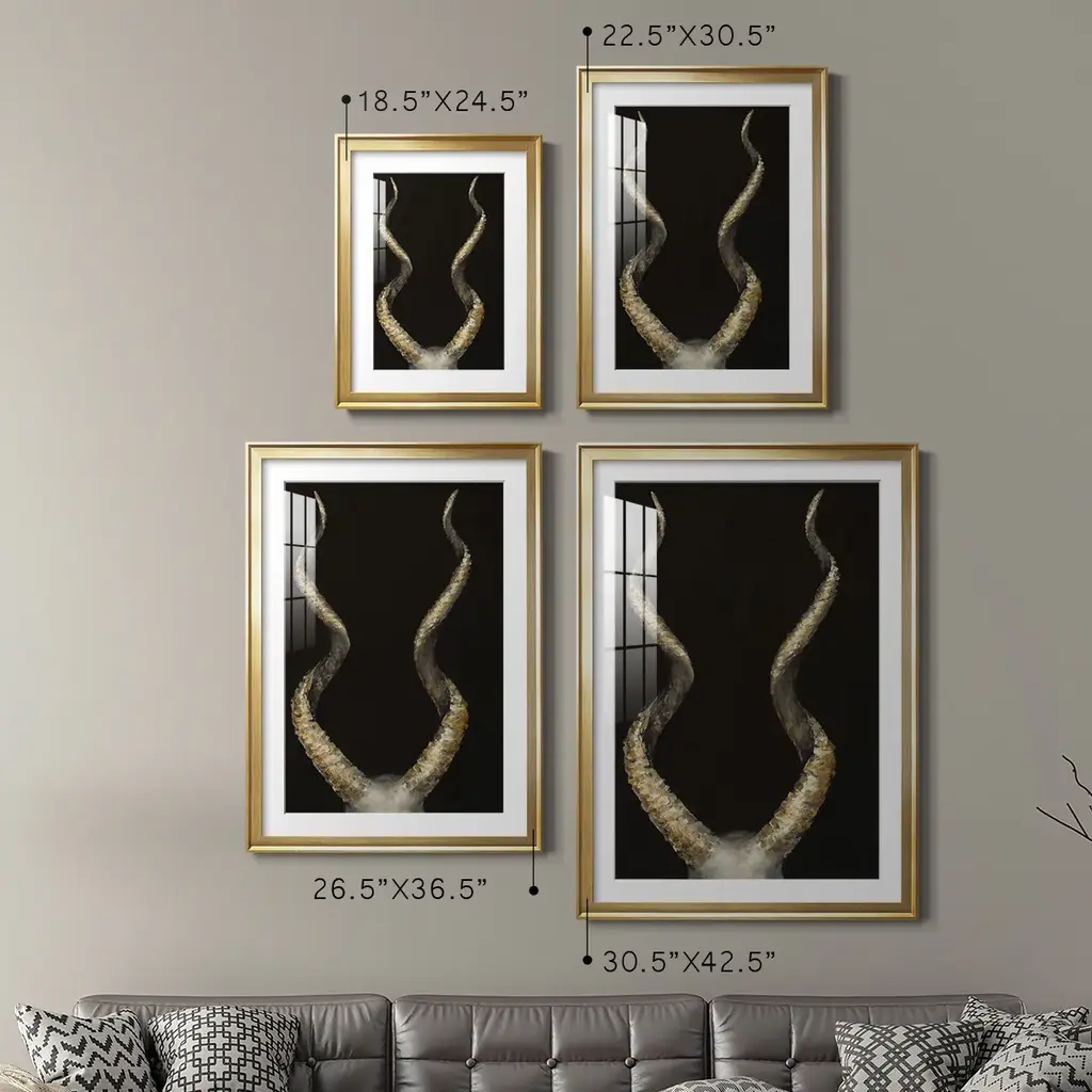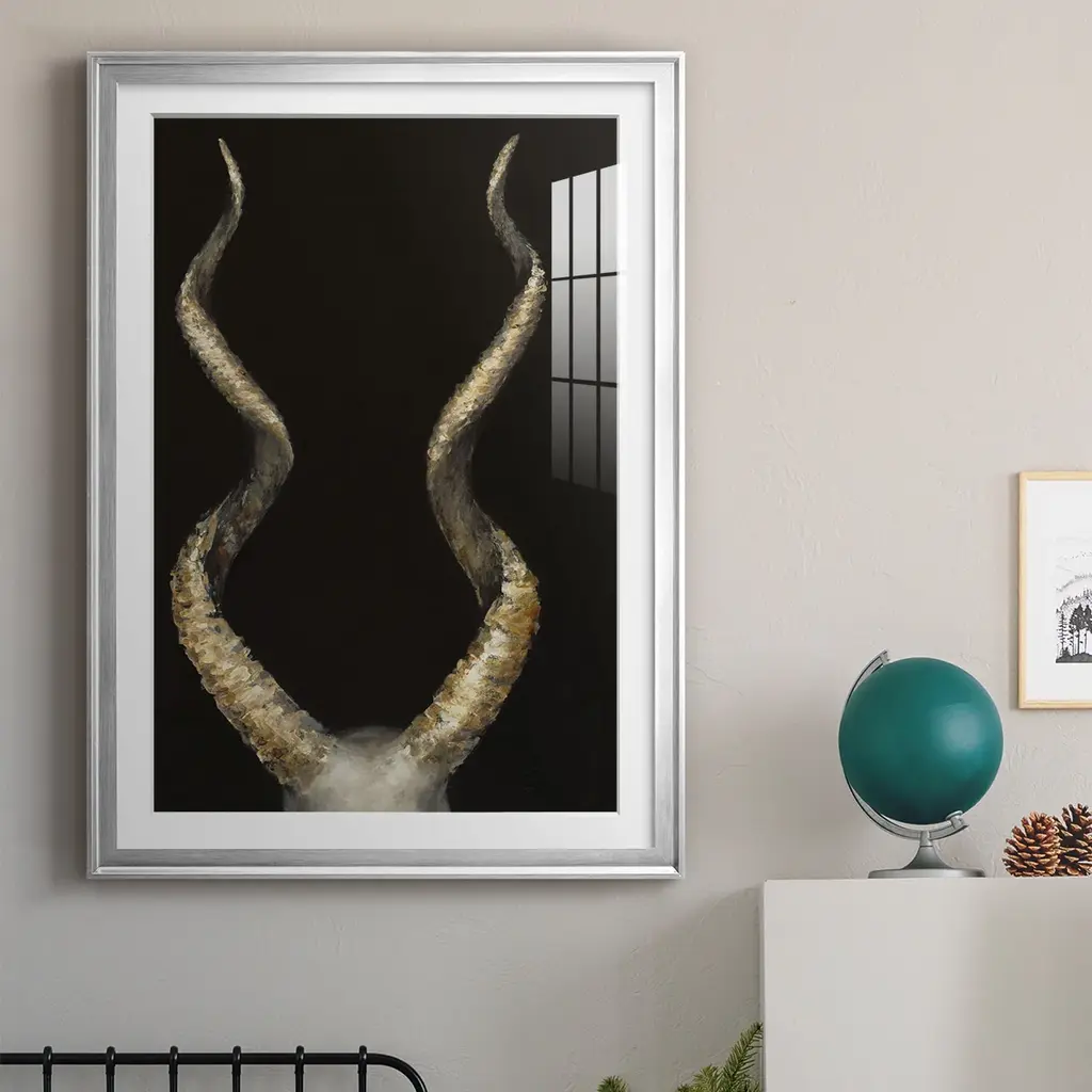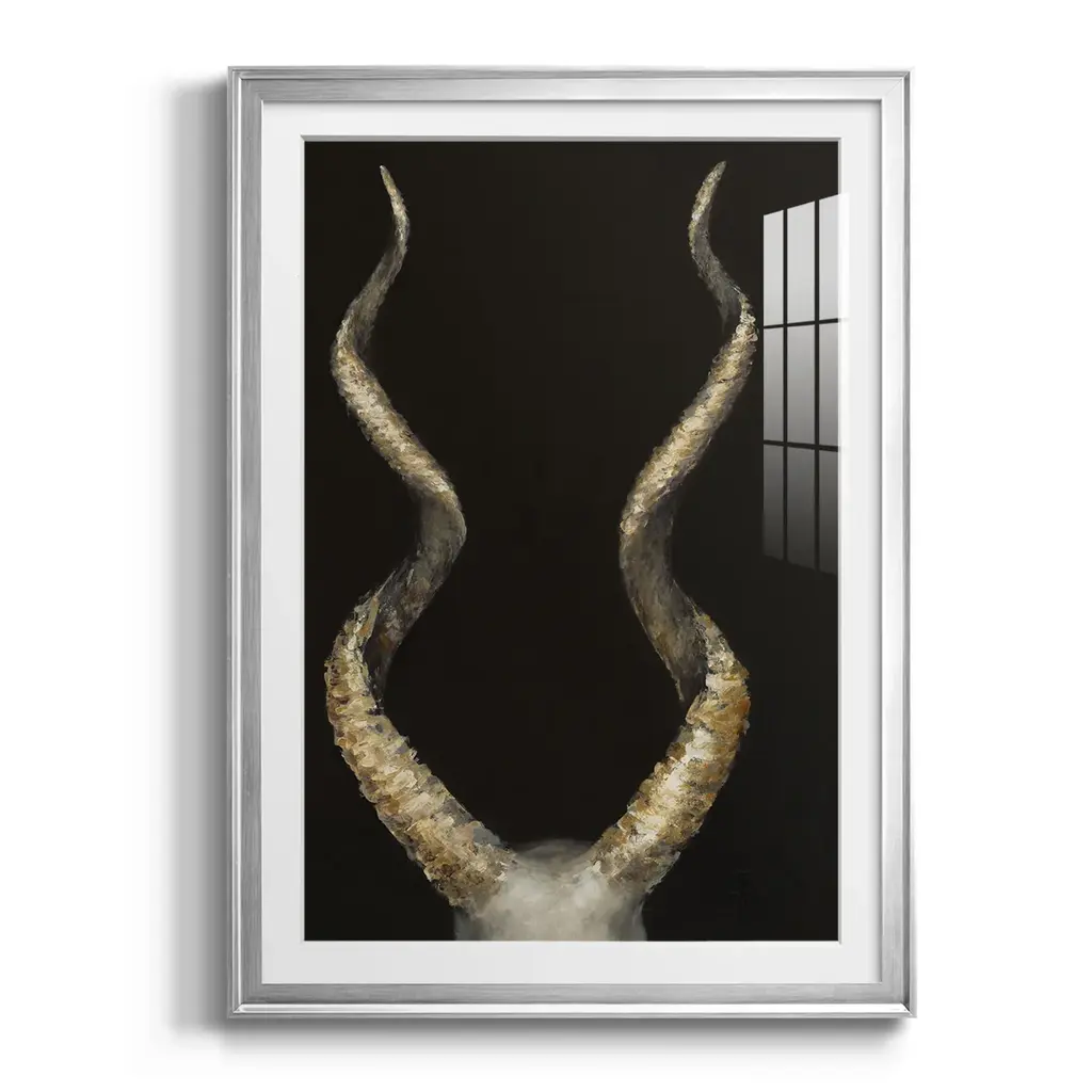 Spiral Antelope Horns Premium Framed Print - Ready to Hang A Premium Framed Print created to last. Framed in distressed wood and available in an array of sizes and colors Featuring a beveled a solid wood stretcher bar, each piece comes ready to hand 4 SIZES AVAILABLE 30.5''X42.5'' - Overall Size 26.5'X36.5'' - Overall Size 22.5''x30.5'' - Overall Size 18.5''x24.5'' - Overall Size Each piece is made to order. Each piece comes with hanging hardware. Made in the USA Ready to Hang Giclee Paper Print Acrylic Glass Beveled Matt Board