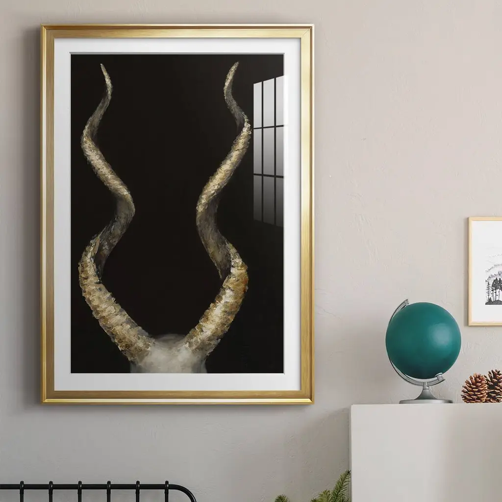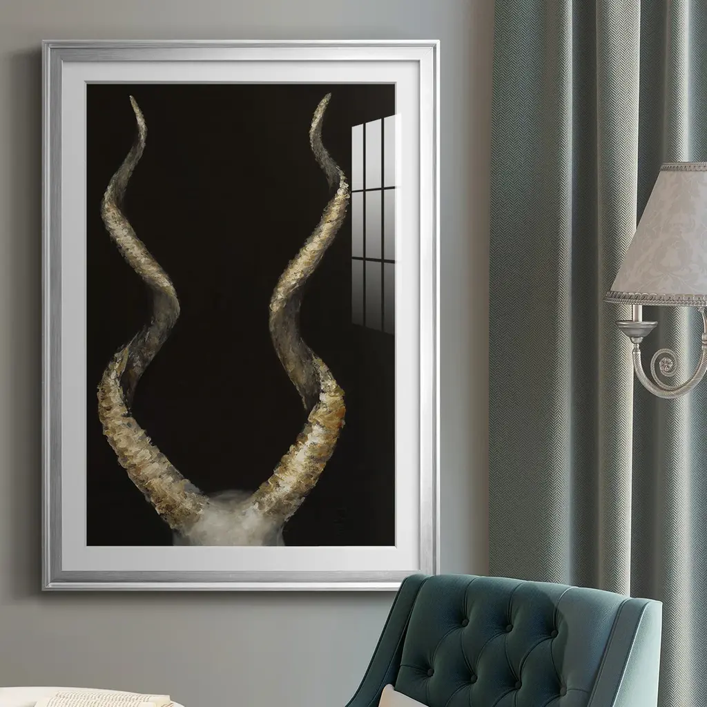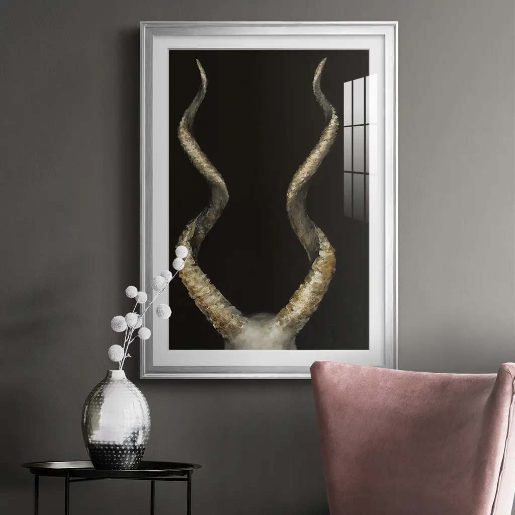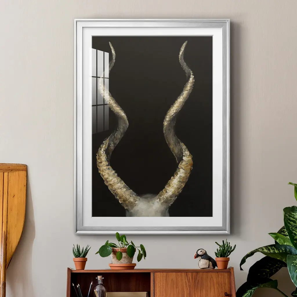 Spiral Antelope Horns Premium Framed Print - Ready to Hang A Premium Framed Print created to last. Framed in distressed wood and available in an array of sizes and colors Featuring a beveled a solid wood stretcher bar, each piece comes ready to hand 4 SIZES AVAILABLE 30.5''X42.5'' - Overall Size 26.5'X36.5'' - Overall Size 22.5''x30.5'' - Overall Size 18.5''x24.5'' - Overall Size Each piece is made to order. Each piece comes with hanging hardware. Made in the USA Ready to Hang Giclee Paper Print Acrylic Glass Beveled Matt Board