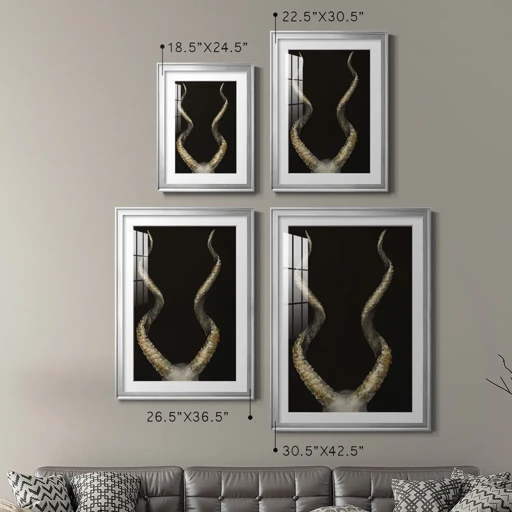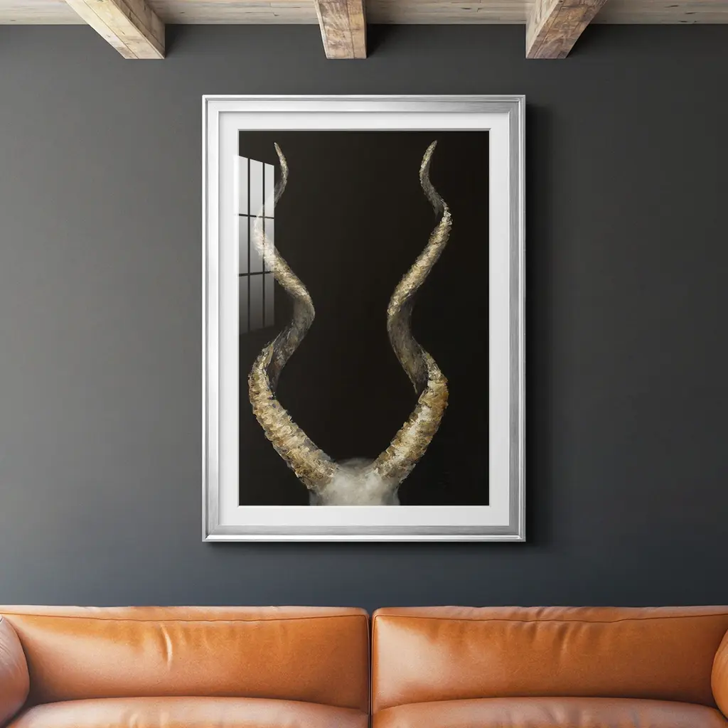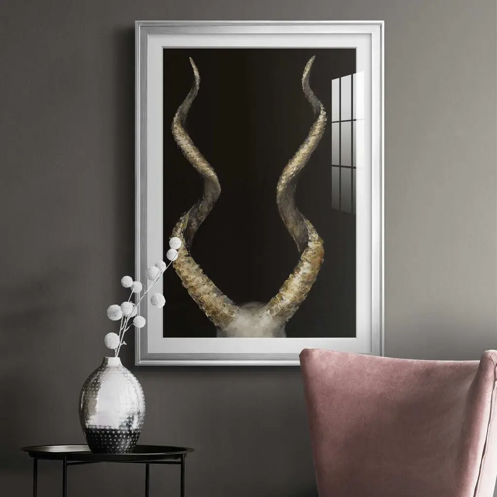 Spiral Antelope Horns Premium Framed Print - Ready to Hang A Premium Framed Print created to last. Framed in distressed wood and available in an array of sizes and colors Featuring a beveled a solid wood stretcher bar, each piece comes ready to hand 4 SIZES AVAILABLE 30.5''X42.5'' - Overall Size 26.5'X36.5'' - Overall Size 22.5''x30.5'' - Overall Size 18.5''x24.5'' - Overall Size Each piece is made to order. Each piece comes with hanging hardware. Made in the USA Ready to Hang Giclee Paper Print Acrylic Glass Beveled Matt Board