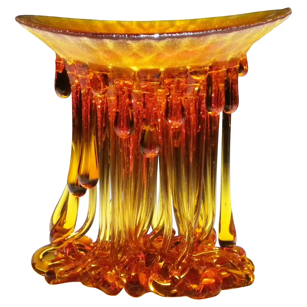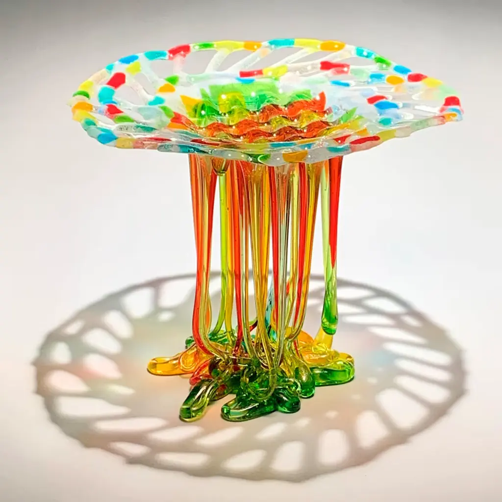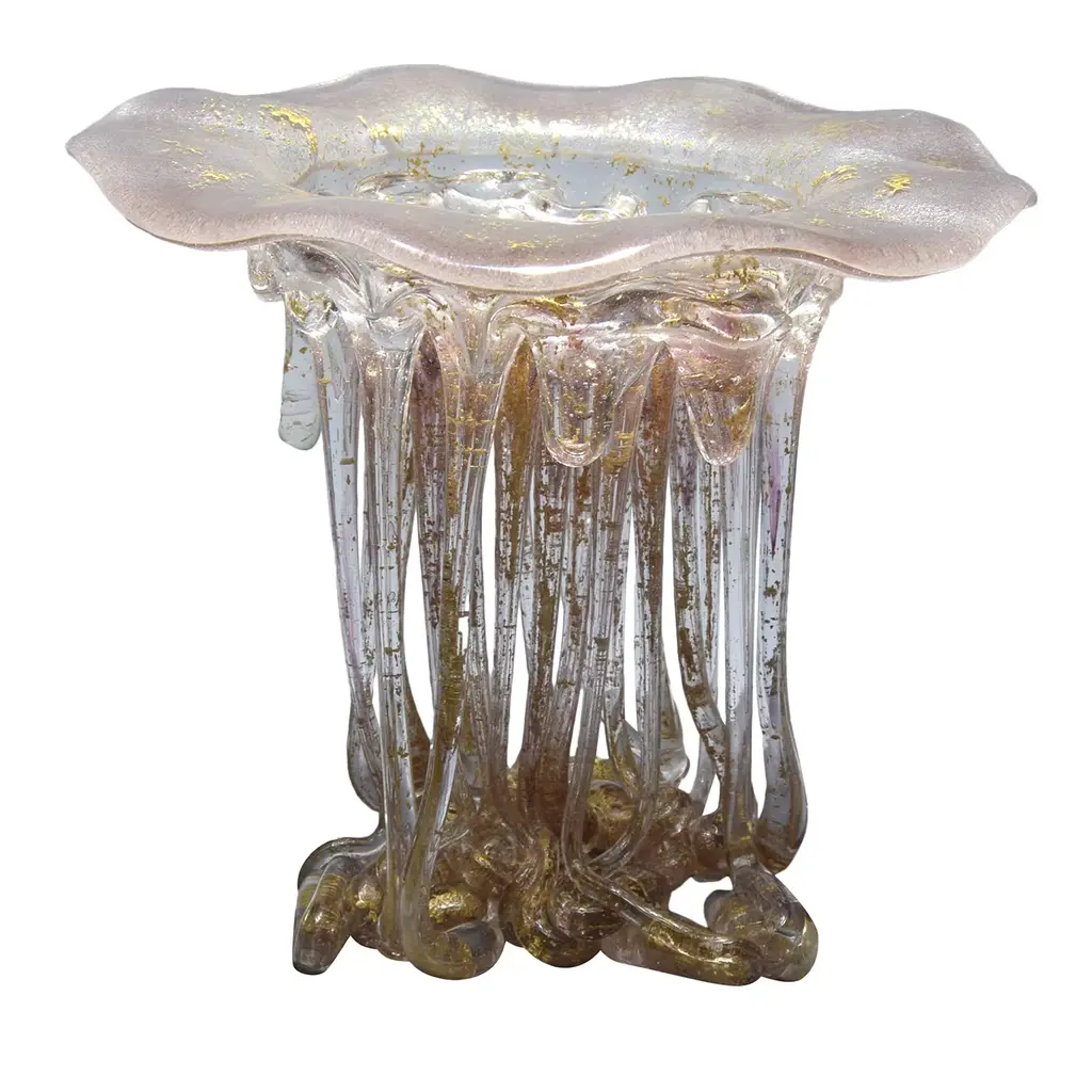 A bold artwork of strong visual impact, this sculptural centerpiece is a one-of-a-kind design from the Meduse Collection inspired by the unmistakable, visionary charm of marine creatures such as jellyfish. Colored in a captivating array of rainbow tones, it is handcrafted of Murano glass at a high temperature to obtain its singular and spectacular shape. Carefully packed in a cardboard and wooden box, filled with foam. Please ask the Concierge for further details.