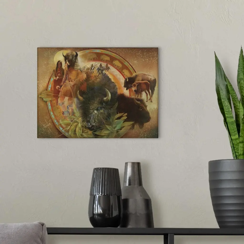 A contemporary painting of a montage of Native American tribesmen and bison.