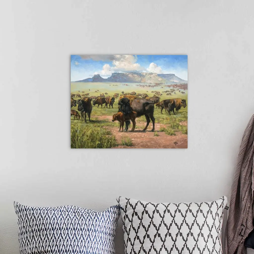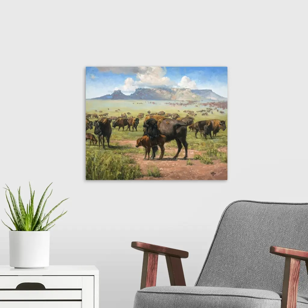 Contemporary artwork of lively brush strokes that create a serene western landscape filled with roaming buffaloes.