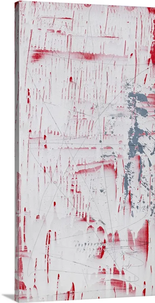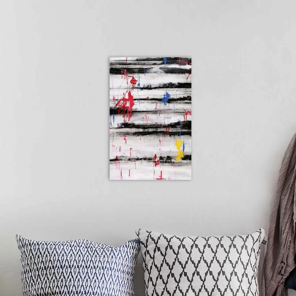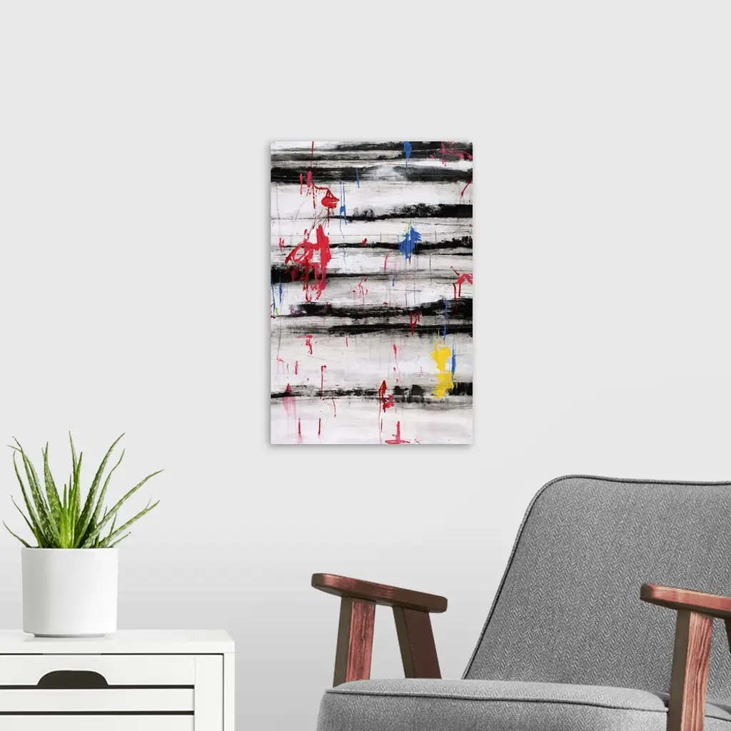 Contemporary abstract painting using dark bold horizontal lines against a neutral background with splashes of color in the foreground.