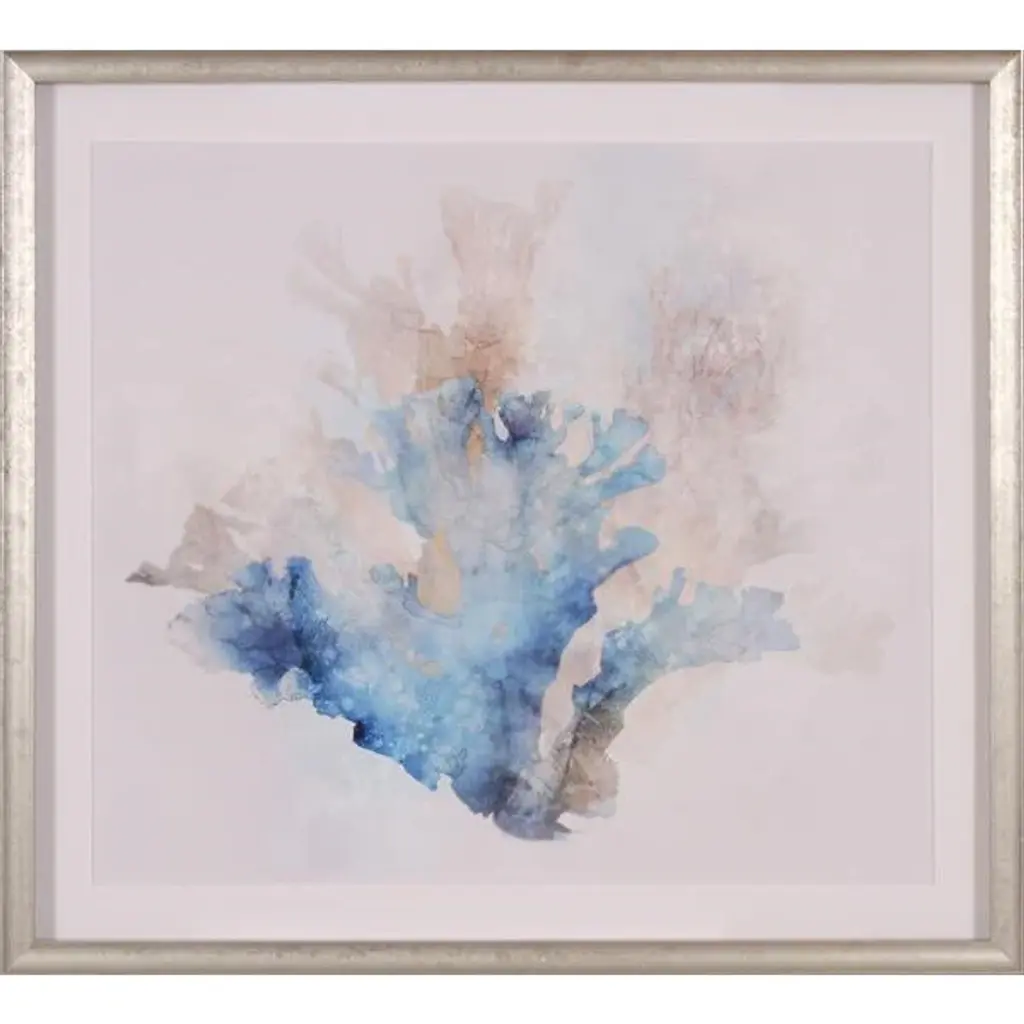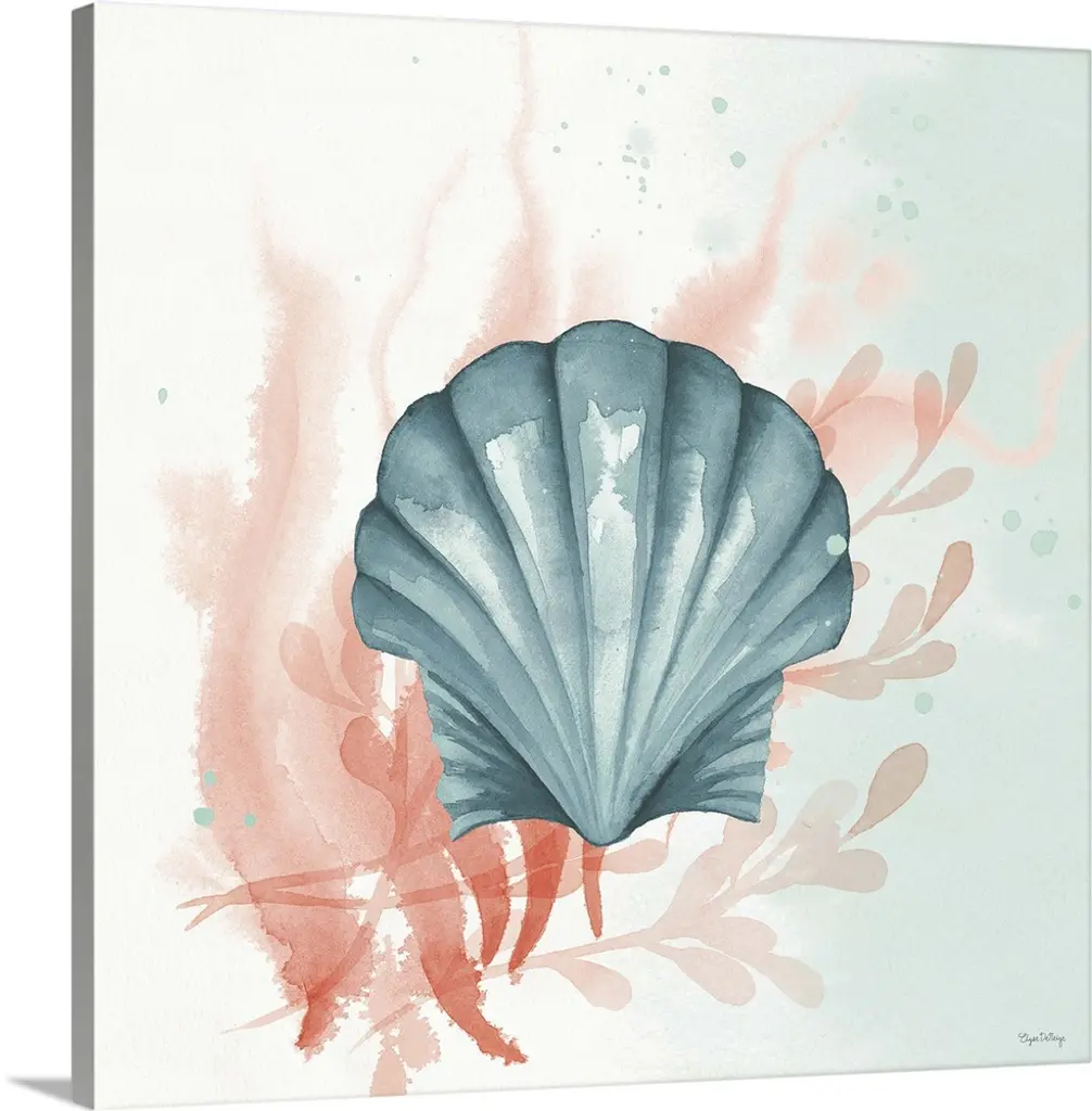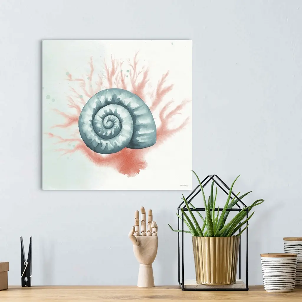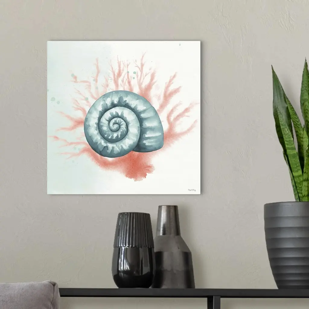 Watercolor painting of a seashell and coral in blue and pink hues on a square background.
