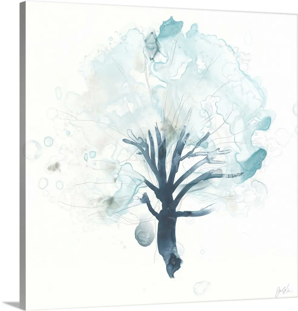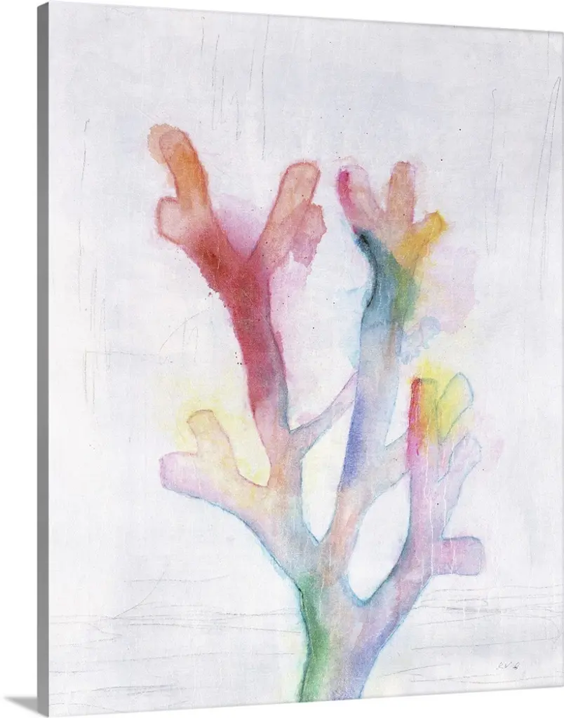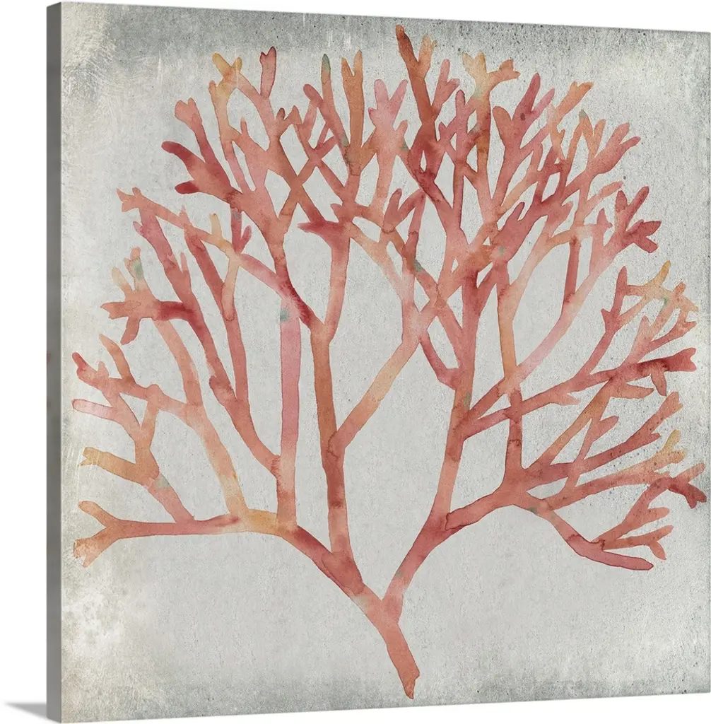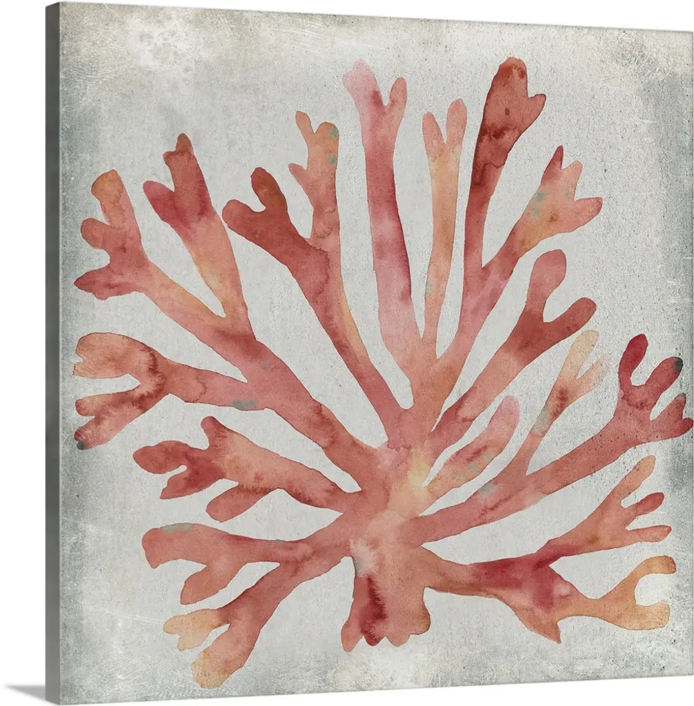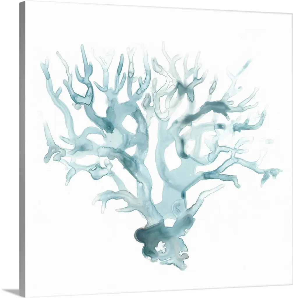 Watercolor painting of a seashell and coral in blue and pink hues on a square background.