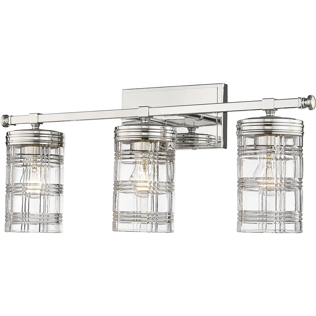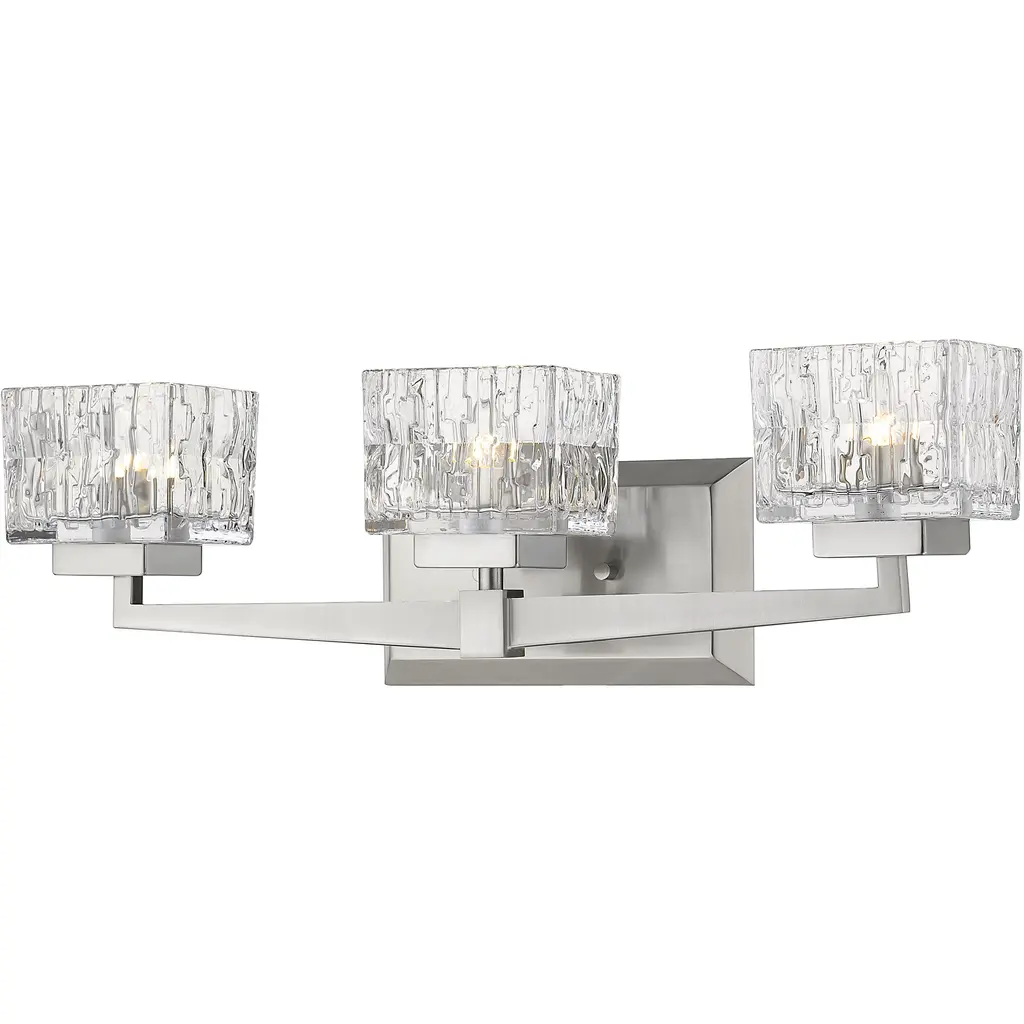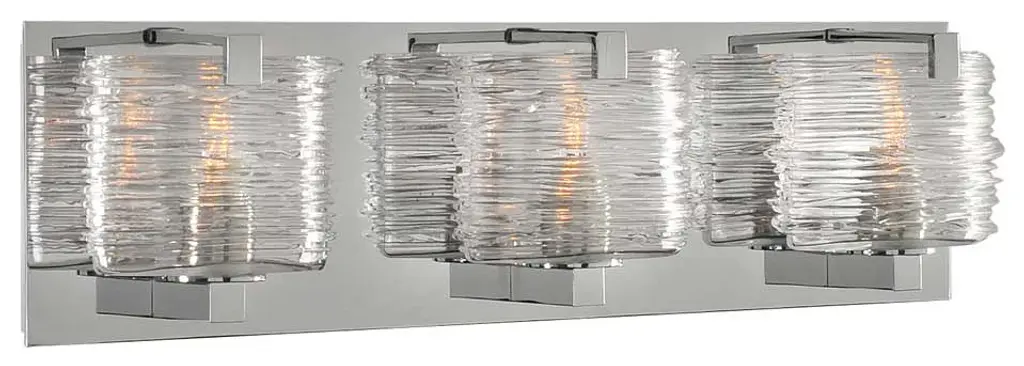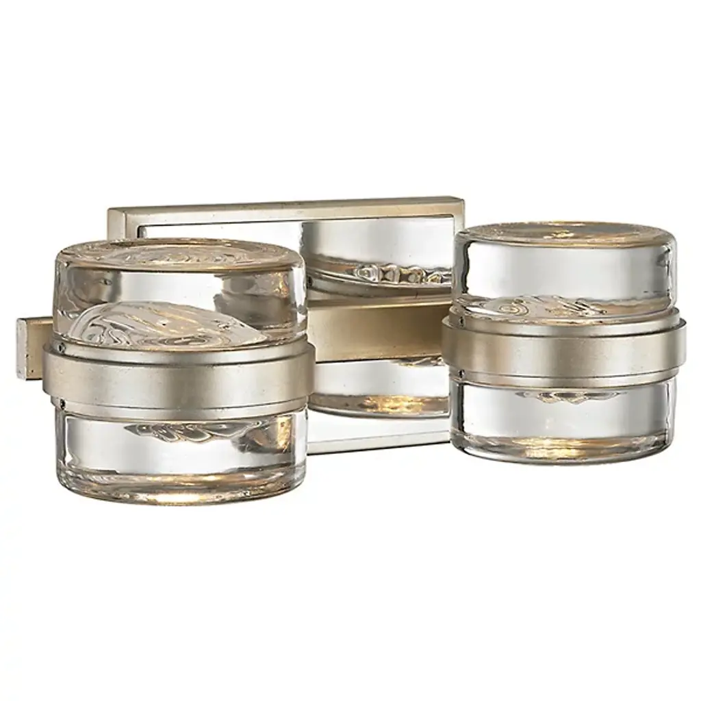 The Splash LED Vanity Light by Troy Lighting captures the beauty of water in its design, featuring Clear Pressed glass shades whose surface and interior mimic its ever-flowing quality. A slim bar made of Hand-Worked Iron wraps around the center of each shade, providing support as well as an alluring decorative contrast. Individual LED lamps help bring this piece to life, shining through the glass for a luxurious glistening effect.