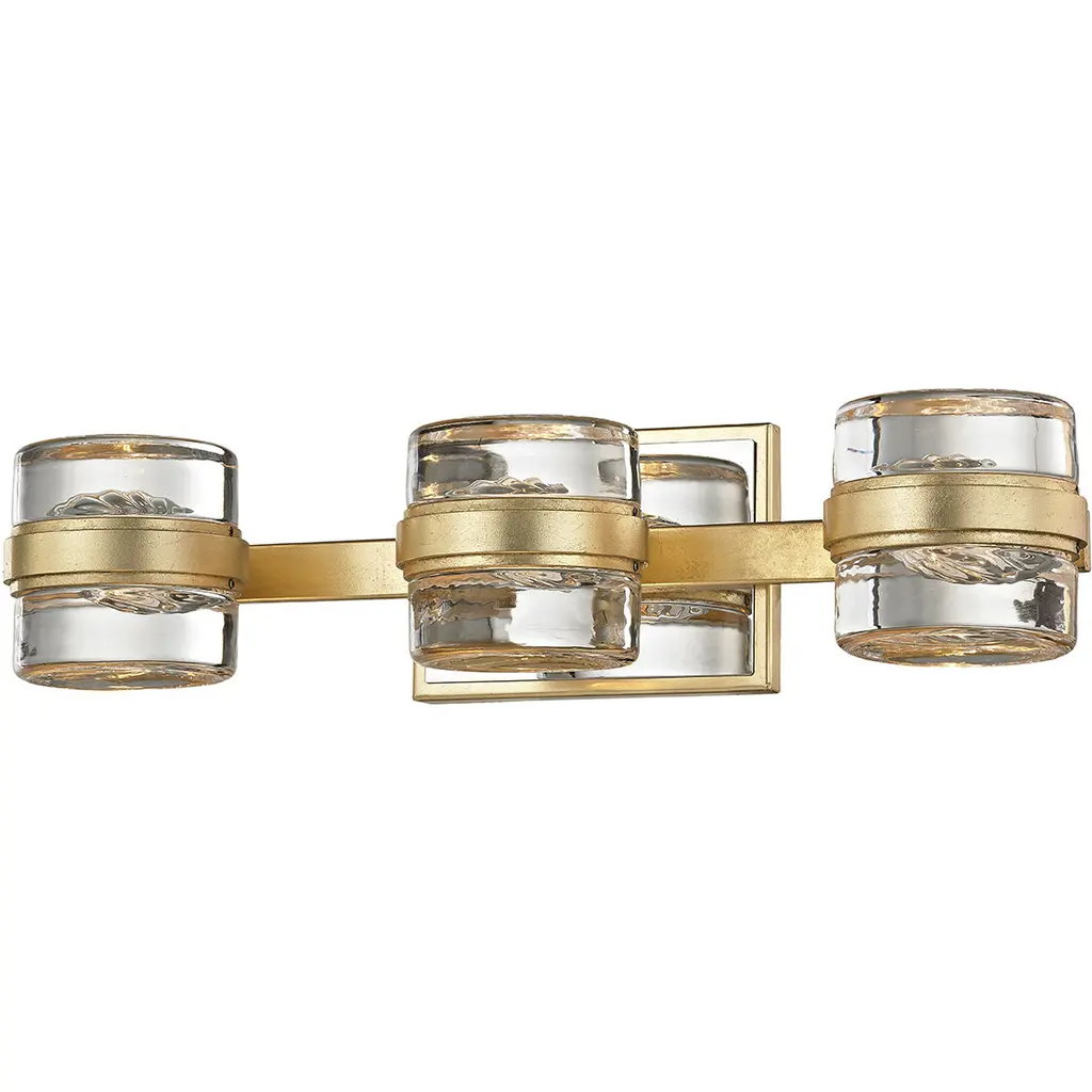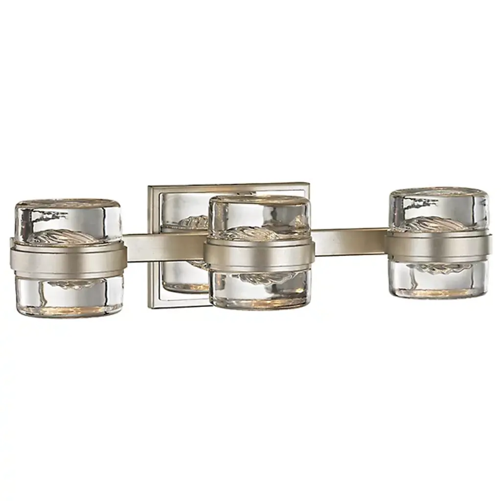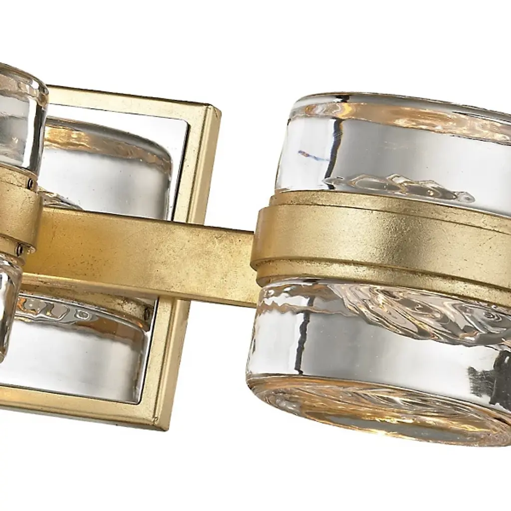 The Splash LED Vanity Light by Troy Lighting captures the beauty of water in its design, featuring Clear Pressed glass shades whose surface and interior mimic its ever-flowing quality. A slim bar made of Hand-Worked Iron wraps around the center of each shade, providing support as well as an alluring decorative contrast. Individual LED lamps help bring this piece to life, shining through the glass for a luxurious glistening effect.