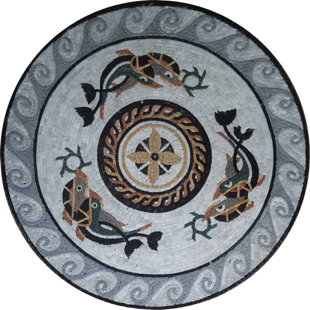 Introducing the Splashy Fish Mosaic Art, a stunning decorative piece that brings the beauty of the ocean directly into your home. Crafted with meticulous attention to detail, this exquisite mosaic is fully handmade using 100% natural stones and tiles, ensuring that each piece is unique and of the highest quality.At the heart of the Splashy Fish Mosaic Art is a captivating square design that features a sleek grey background, which elegantly contrasts with a striking black waves border. This design intricately showcases three vibrant sea creatures in shades of green, black, and beige, gracefully circling a charming medallion in the center. The combination of colors and shapes creates a mesmerizing visual effect that will draw the eye and spark conversation.The Splashy Fish Mosaic Art is more than just a decorative item—it's a versatile addition to your space. Whether you're looking to enhance a coastal-themed room, a chic modern space, or anything in between, this nautical mosaic can be customized in size and color to perfectly fit your design vision. With just a touch of personalization, this artwork can become the focal point of your decor, inspiring tranquility and creativity in any space.Bring a piece of the ocean into your daily life with the Splashy Fish Mosaic Art. Perfect for living rooms, bedrooms, or even a serene office atmosphere, this art piece serves as a reminder of the beauty that lies beneath the waves. Make a splash with this delightful mosaic and transform your environment into a haven of relaxation and style. Embrace the artistry of nature and let the Splashy Fish Mosaic Art elevate your home decor.