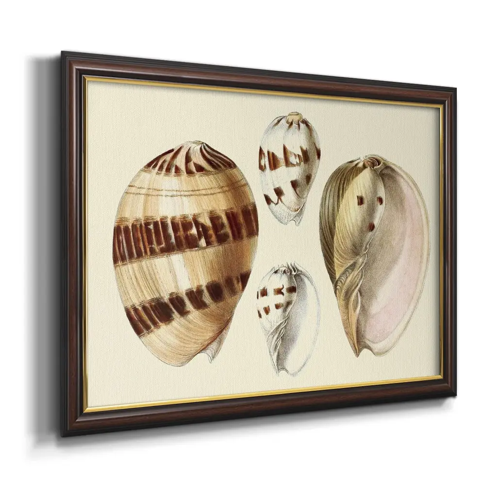 Splendid Shells VII Premium Framed Canvas- Ready to Hang A Premium Framed Canvas created to last. Framed in distressed wood and available in an array of sizes and colors Featuring a beveled a solid wood stretcher bar, each piece comes ready to hand 3 SIZES AVAILABLE 16''X20'' - Overall Size 18'X27'' - Overall Size 24''x36'' - Overall Size Each piece is made to order. Each piece comes with hanging hardware. Made in the USA Ready to Hang Giclee Paper Print Acrylic Glass Beveled Matt Board
