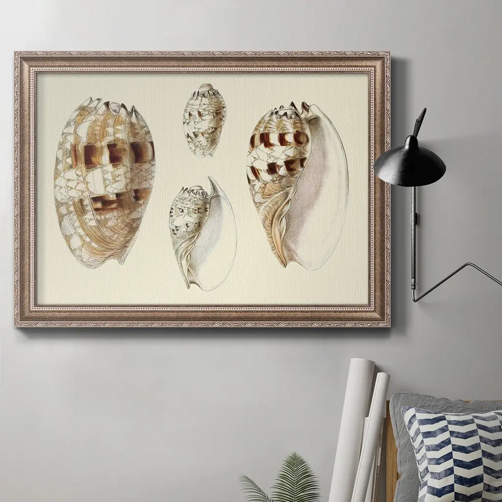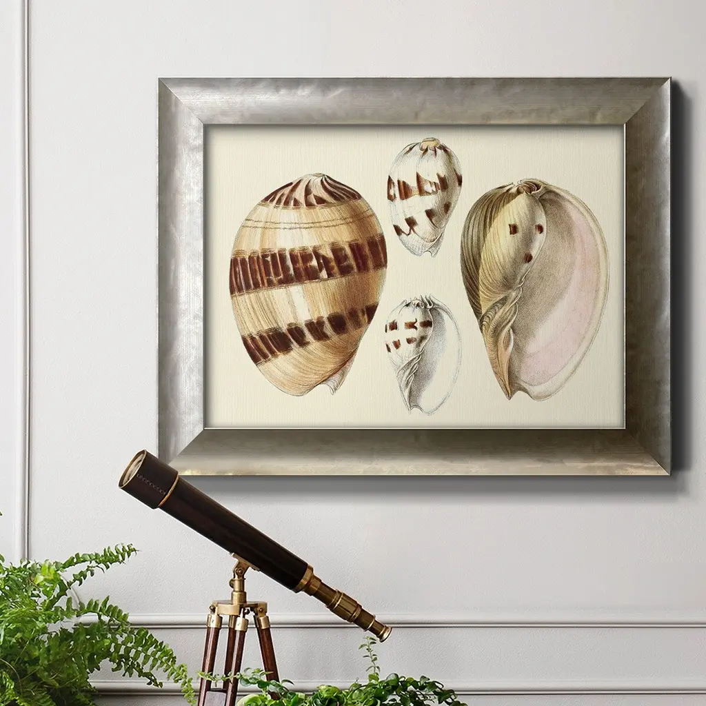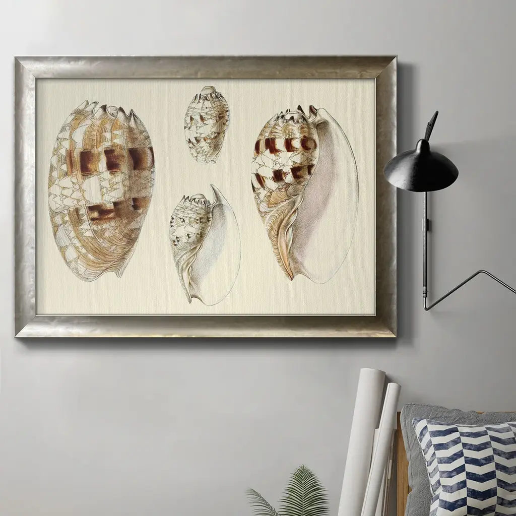 Splendid Shells VII Premium Framed Canvas- Ready to Hang A Premium Framed Canvas created to last. Framed in distressed wood and available in an array of sizes and colors Featuring a beveled a solid wood stretcher bar, each piece comes ready to hand 3 SIZES AVAILABLE 16''X20'' - Overall Size 18'X27'' - Overall Size 24''x36'' - Overall Size Each piece is made to order. Each piece comes with hanging hardware. Made in the USA Ready to Hang Giclee Paper Print Acrylic Glass Beveled Matt Board