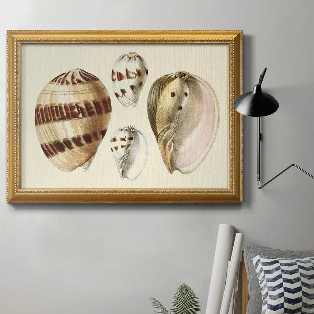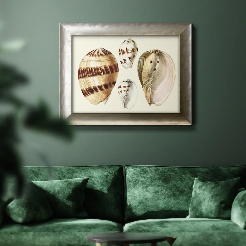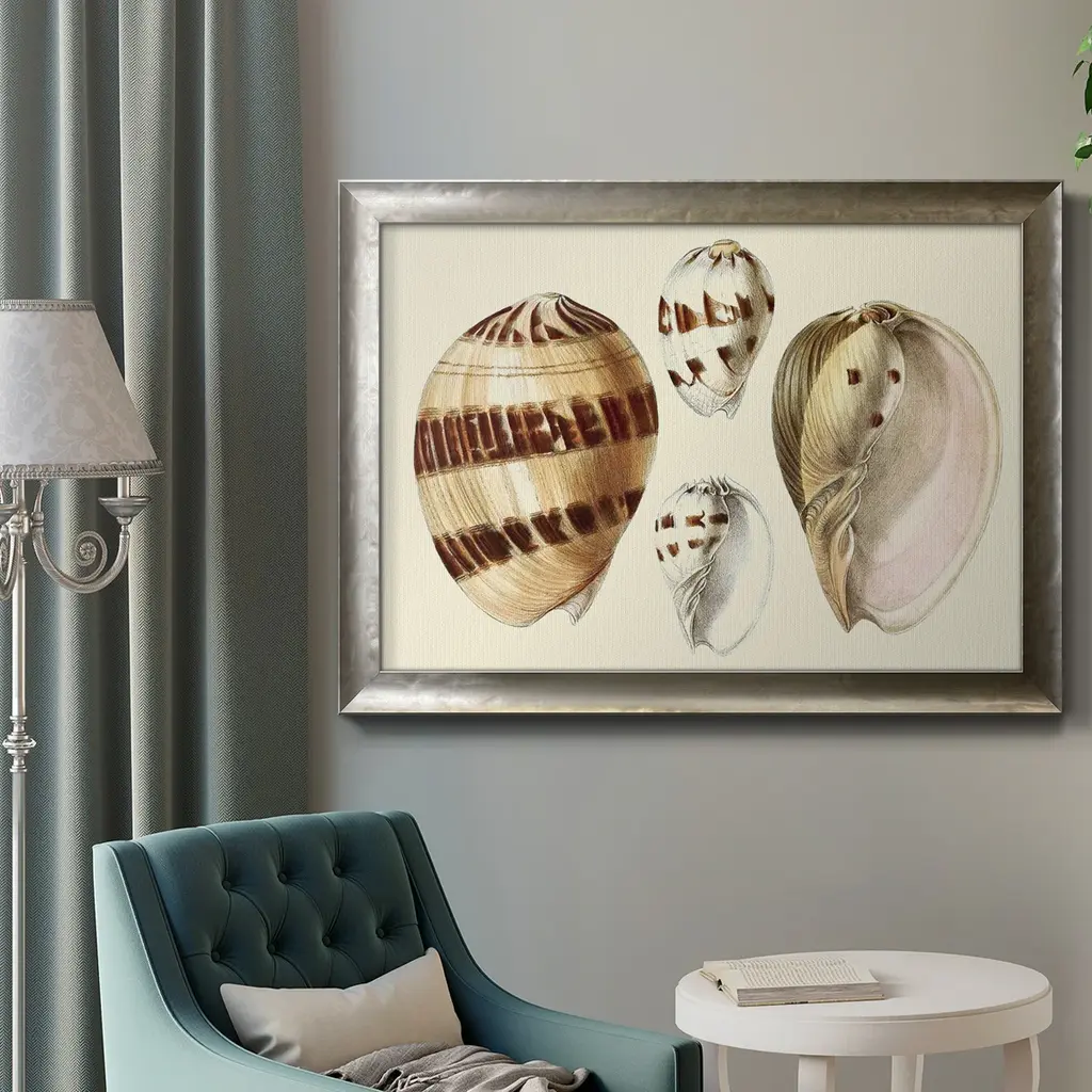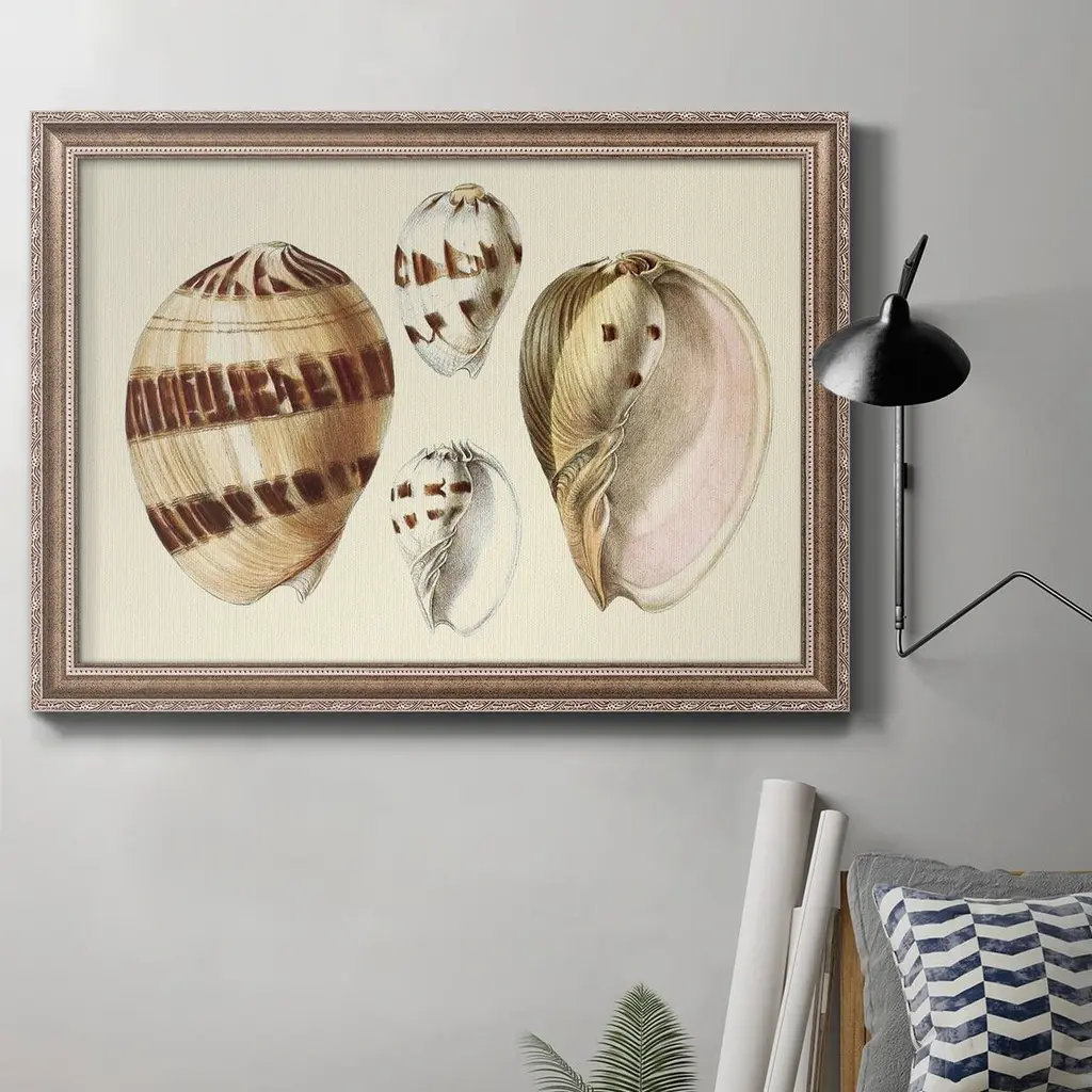 Splendid Shells VII Premium Framed Canvas- Ready to Hang A Premium Framed Canvas created to last. Framed in distressed wood and available in an array of sizes and colors Featuring a beveled a solid wood stretcher bar, each piece comes ready to hand 3 SIZES AVAILABLE 16''X20'' - Overall Size 18'X27'' - Overall Size 24''x36'' - Overall Size Each piece is made to order. Each piece comes with hanging hardware. Made in the USA Ready to Hang Giclee Paper Print Acrylic Glass Beveled Matt Board