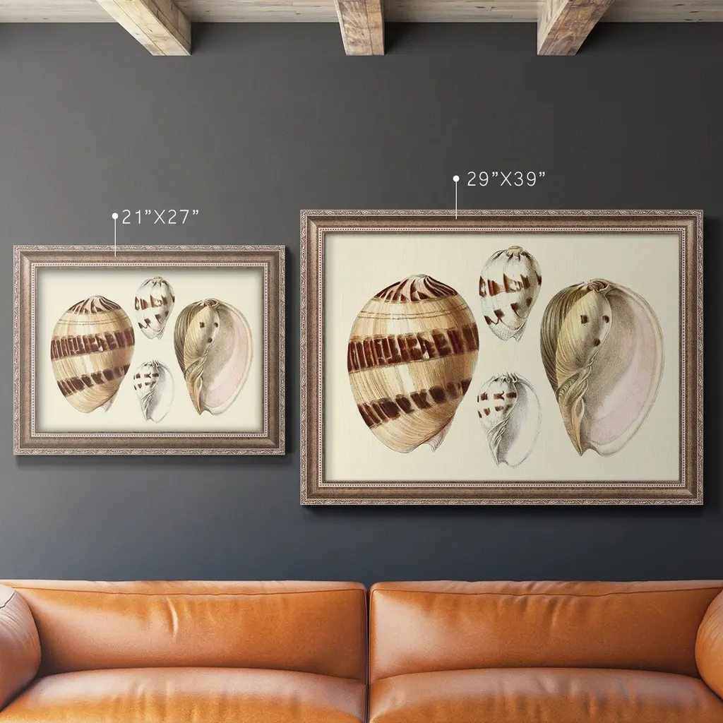 Splendid Shells VII Premium Framed Canvas- Ready to Hang A Premium Framed Canvas created to last. Framed in distressed wood and available in an array of sizes and colors Featuring a beveled a solid wood stretcher bar, each piece comes ready to hand 3 SIZES AVAILABLE 16''X20'' - Overall Size 18'X27'' - Overall Size 24''x36'' - Overall Size Each piece is made to order. Each piece comes with hanging hardware. Made in the USA Ready to Hang Giclee Paper Print Acrylic Glass Beveled Matt Board