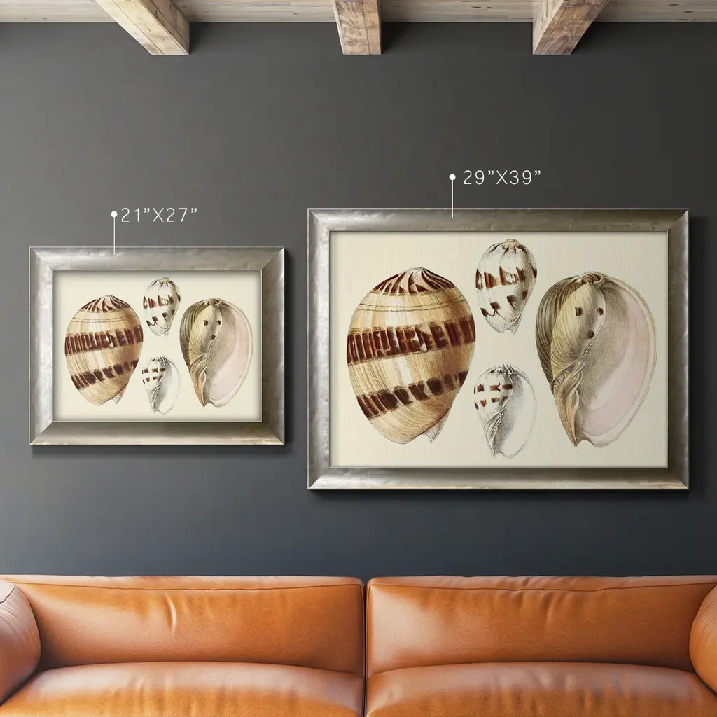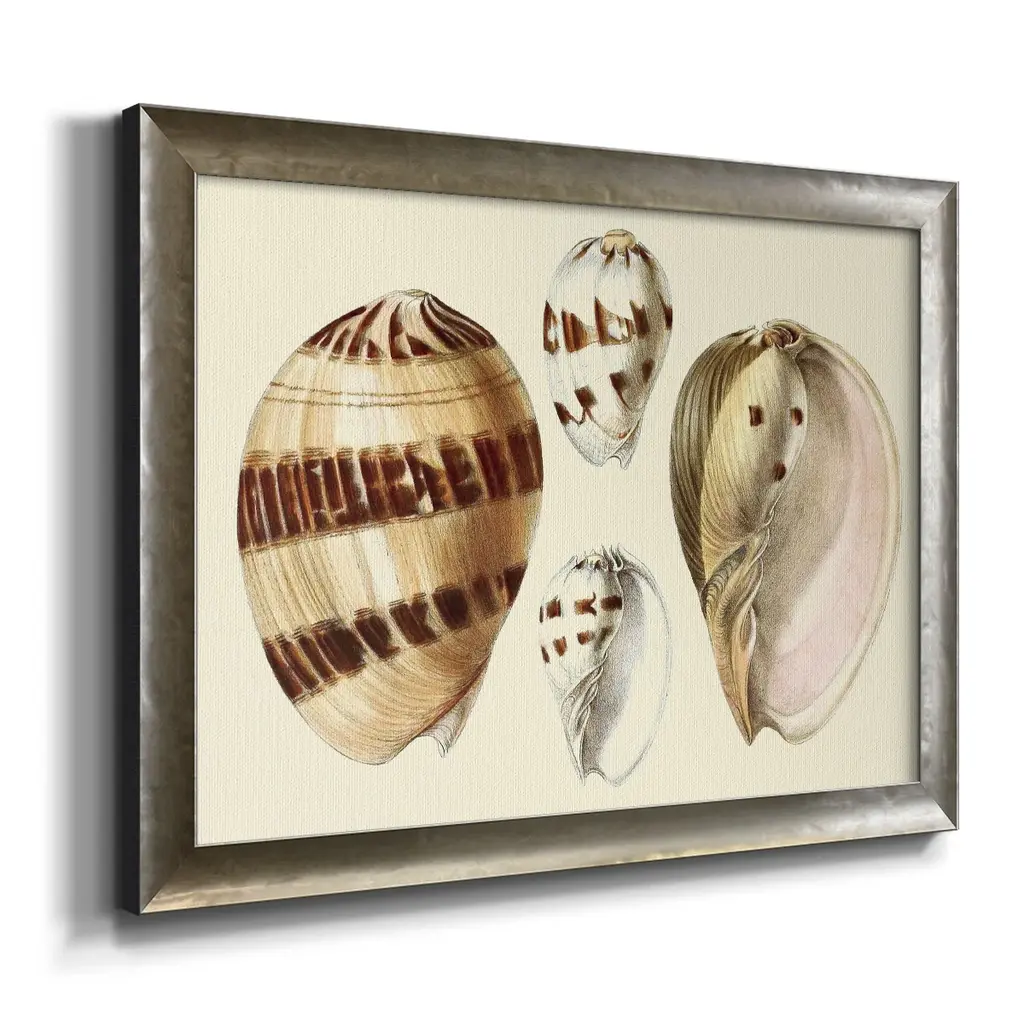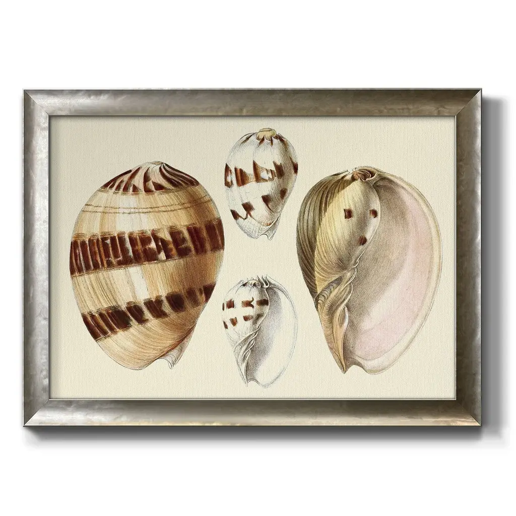 Splendid Shells VII Premium Framed Canvas- Ready to Hang A Premium Framed Canvas created to last. Framed in distressed wood and available in an array of sizes and colors Featuring a beveled a solid wood stretcher bar, each piece comes ready to hand 3 SIZES AVAILABLE 16''X20'' - Overall Size 18'X27'' - Overall Size 24''x36'' - Overall Size Each piece is made to order. Each piece comes with hanging hardware. Made in the USA Ready to Hang Giclee Paper Print Acrylic Glass Beveled Matt Board