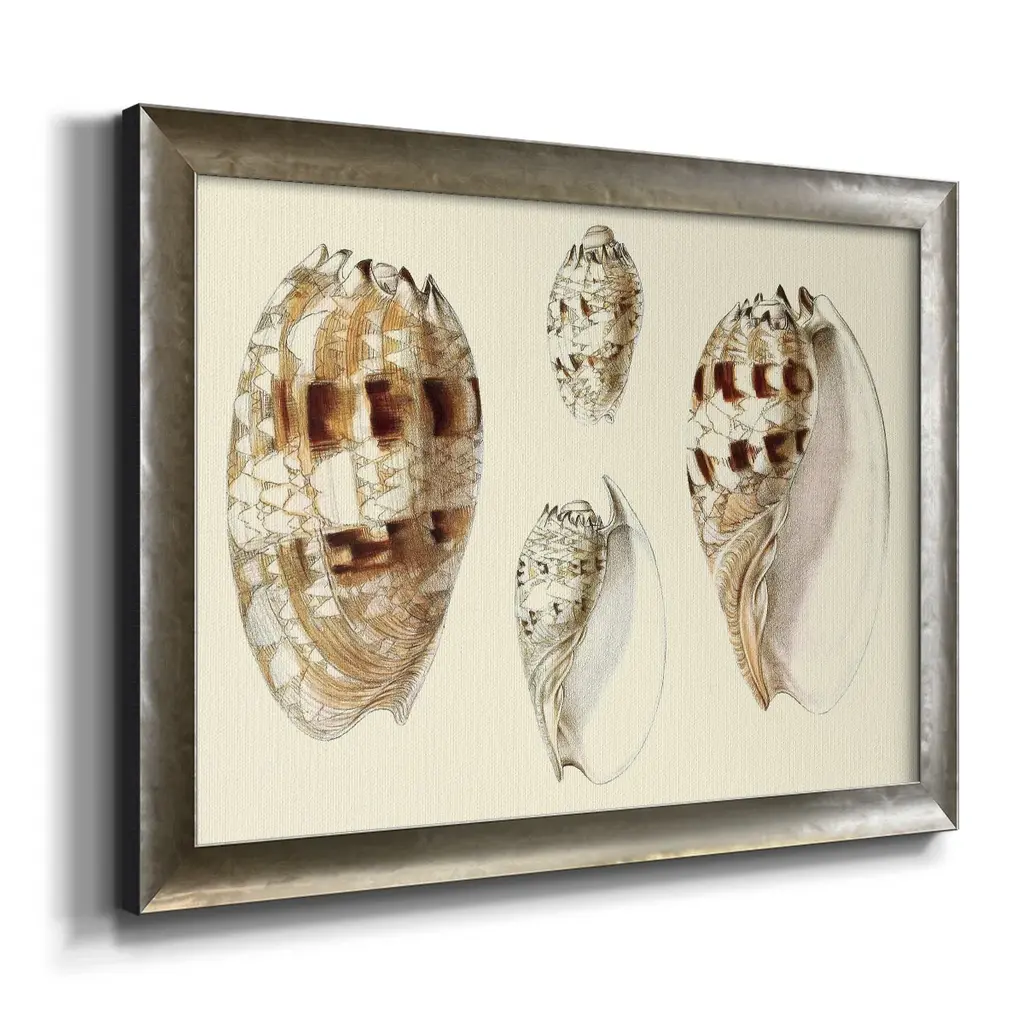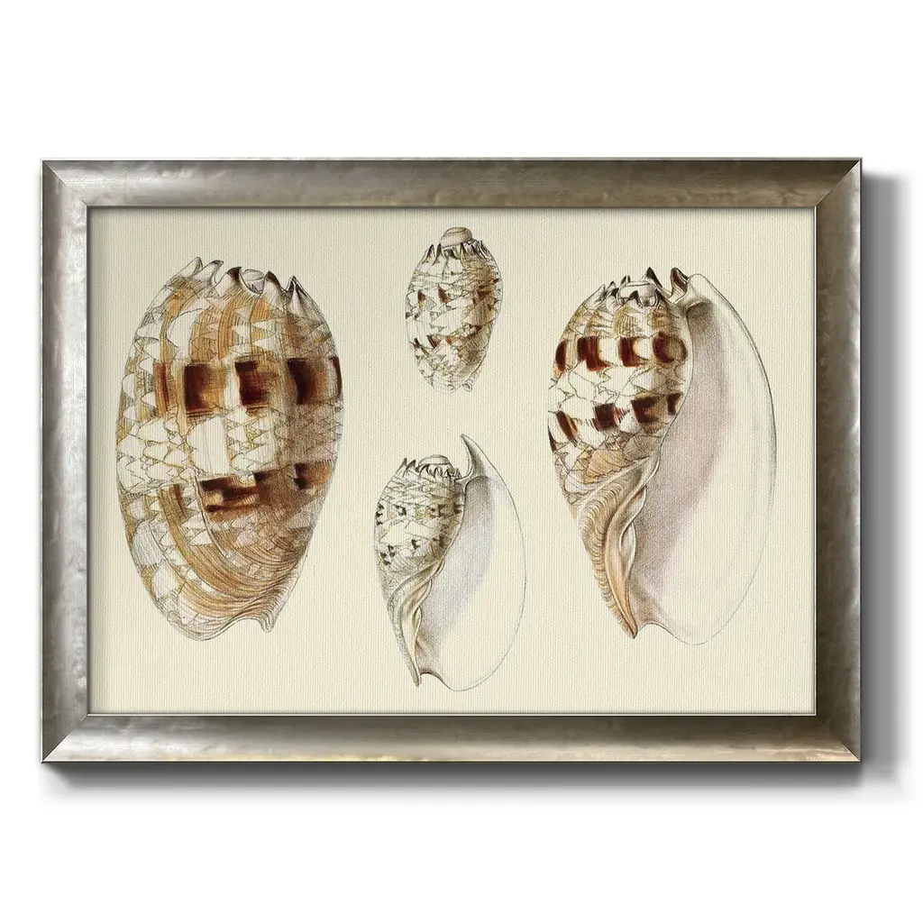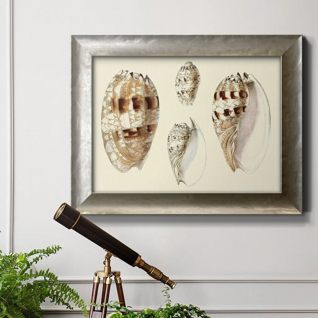 Splendid Shells VIII Premium Framed Canvas- Ready to Hang A Premium Framed Canvas created to last. Framed in distressed wood and available in an array of sizes and colors Featuring a beveled a solid wood stretcher bar, each piece comes ready to hand 3 SIZES AVAILABLE 16''X20'' - Overall Size 18'X27'' - Overall Size 24''x36'' - Overall Size Each piece is made to order. Each piece comes with hanging hardware. Made in the USA Ready to Hang Giclee Paper Print Acrylic Glass Beveled Matt Board