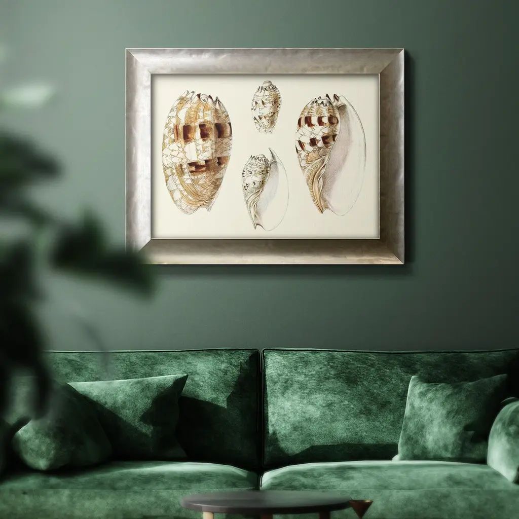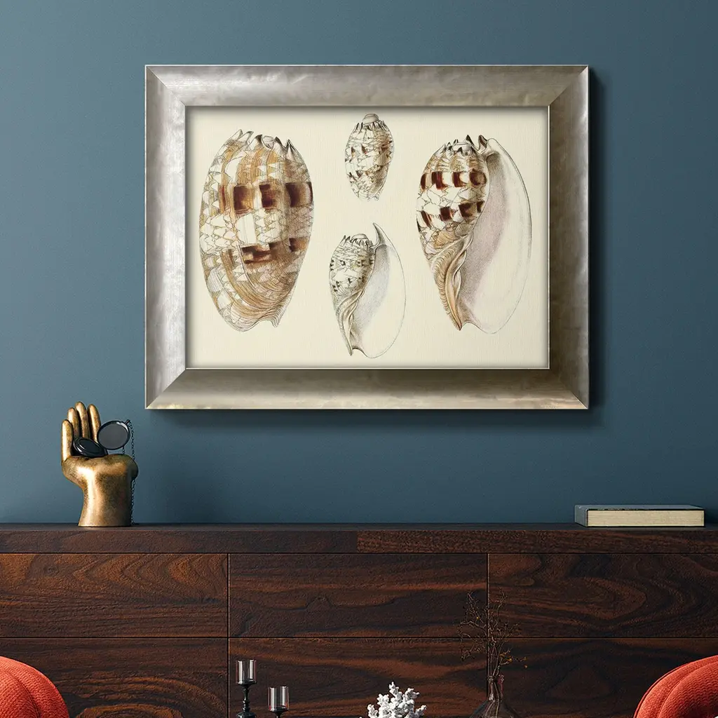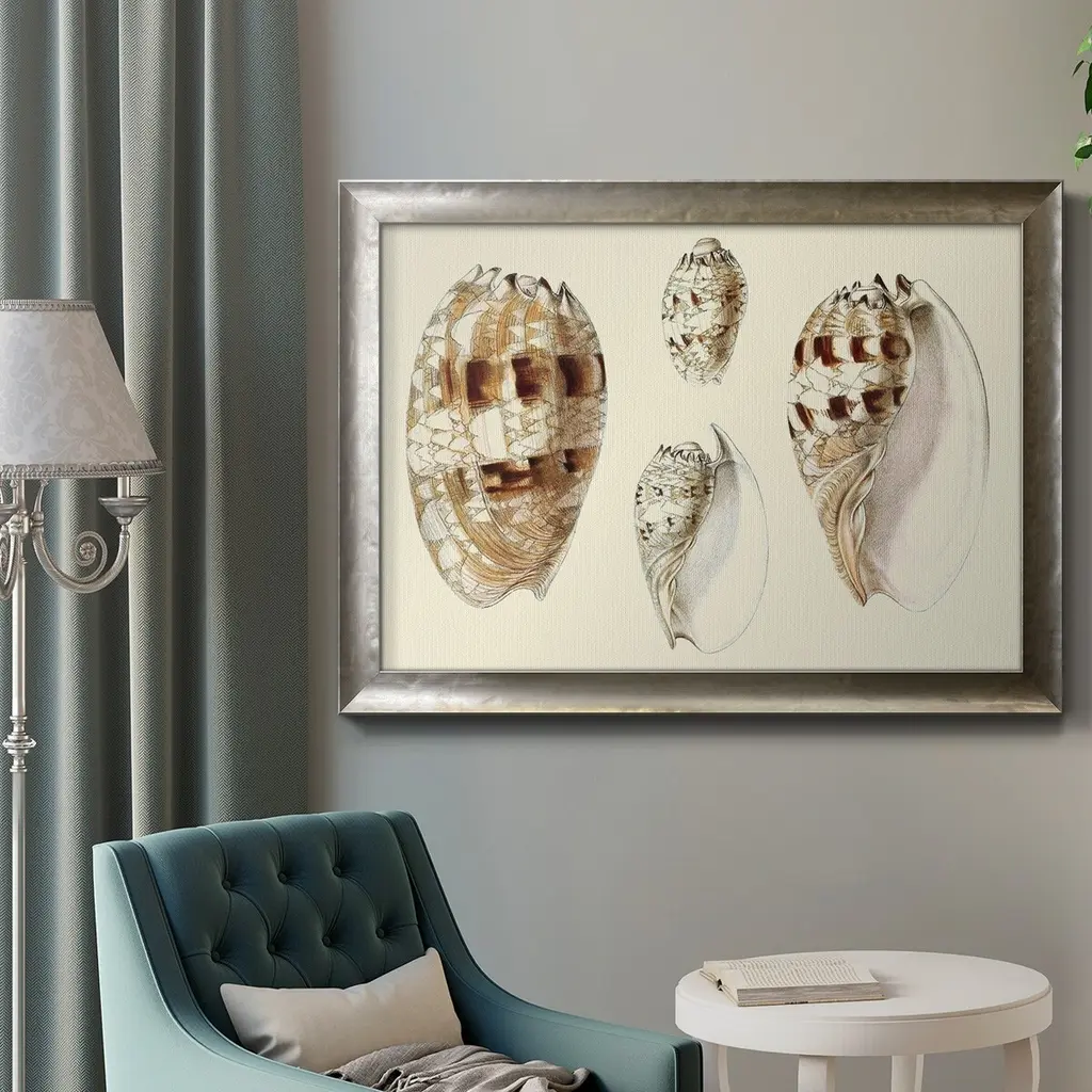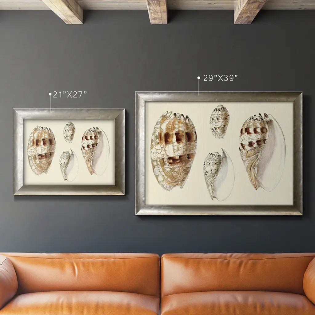 Splendid Shells VIII Premium Framed Canvas- Ready to Hang A Premium Framed Canvas created to last. Framed in distressed wood and available in an array of sizes and colors Featuring a beveled a solid wood stretcher bar, each piece comes ready to hand 3 SIZES AVAILABLE 16''X20'' - Overall Size 18'X27'' - Overall Size 24''x36'' - Overall Size Each piece is made to order. Each piece comes with hanging hardware. Made in the USA Ready to Hang Giclee Paper Print Acrylic Glass Beveled Matt Board