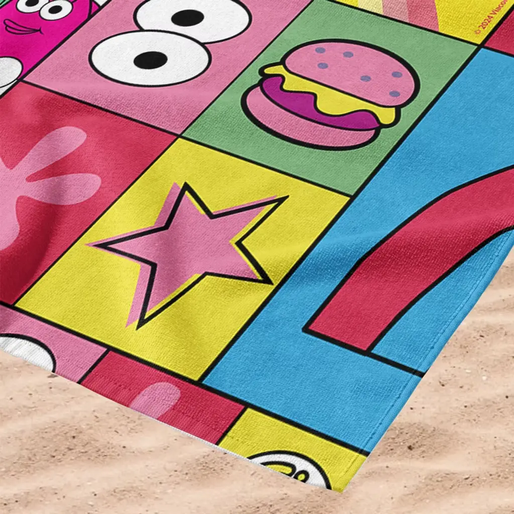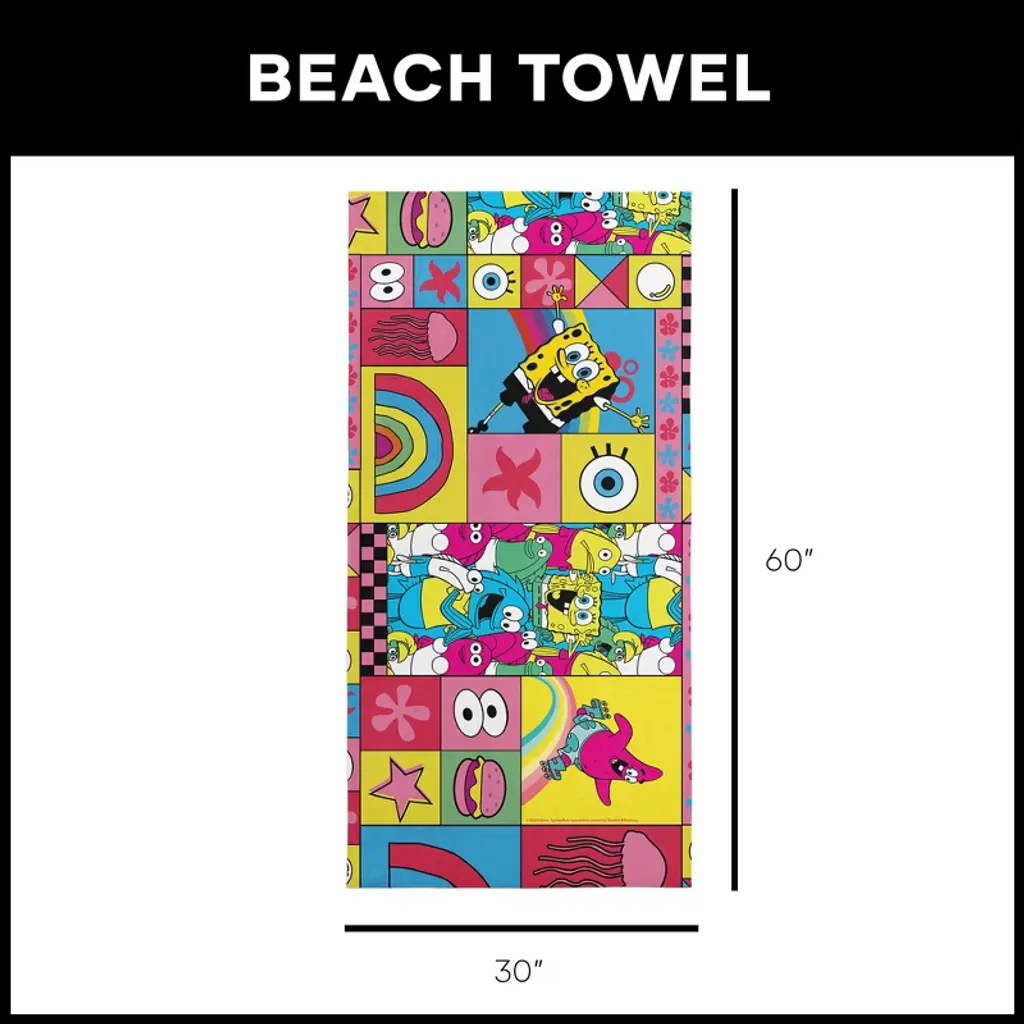 Get ready for fun in the sun with this colorful and lively Nickelodeon SpongeBob SquarePants "Colorful SB" Beach Towel. Featuring vibrant artwork from the beloved show, the towel showcases iconic characters like SpongeBob, Patrick, and a host of other underwater friends in playful and energetic designs. Perfect for beach days, poolside lounging, or even as a whimsical addition to any bathroom. Crafted with soft, absorbent fabric, this towel ensures comfort while you dry off. Its bold, graphic design creates a cheerful vibe wherever you go, making it a great companion for fans of all ages. The playful arrangement of colors and characters captures the joy and humor of SpongeBob SquarePants, adding a splash of fun to any outing. Show your love for the underwater adventures of Bikini Bottom in the best way possible. Whether you're soaking up the sun at the beach or relaxing by the pool, this towel is not only functional but also a statement piece. With its fun design and high-quality material, it’s sure to become a favorite for SpongeBob fans everywhere!