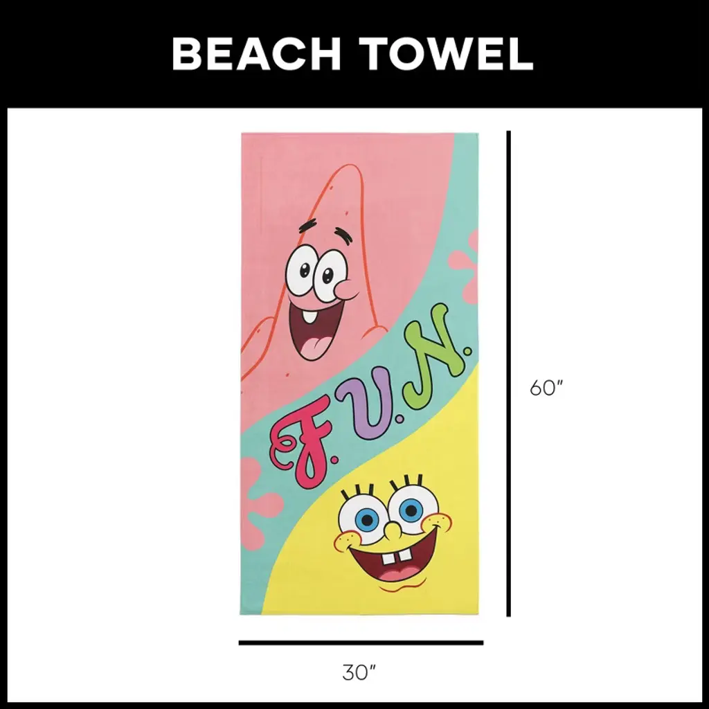 Dive into the world of fun with this vibrant Nickelodeon SpongeBob SquarePants "Fun Towel" beach towel. Featuring the iconic duo, SpongeBob and Patrick, the towel showcases bold colors and playful designs that bring joy to every beach day or poolside hangout. The whimsical "F.U.N." lettering captures the essence of the fun-filled adventures from the show, making this towel a must-have for fans of all ages. Crafted from soft, absorbent fabric, it provides the perfect balance of comfort and functionality. Whether you're drying off after a swim or lounging under the sun, this towel ensures you stay cozy and stylish. The bright, energetic design adds a burst of color and fun to any setting, whether at the beach, pool, or your own backyard. Celebrate your love for SpongeBob SquarePants and the spirit of fun that the show brings. With its lively artwork and top-quality material, this towel is sure to become a favorite for fans who want to add a playful touch to their beach or bath routine.